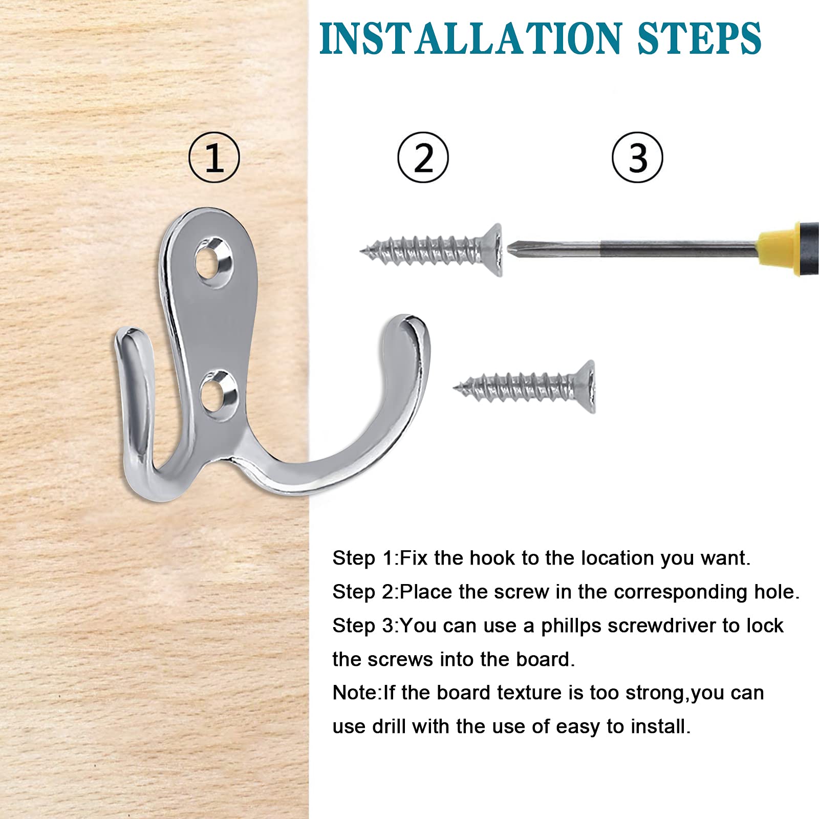 — Einfach zu installieren. Jeder garderobenhaken silber hat 2 Löcher und kann mit zwei Schrauben verstärkt werden. Die Haken und Schrauben passen gut zusammen.