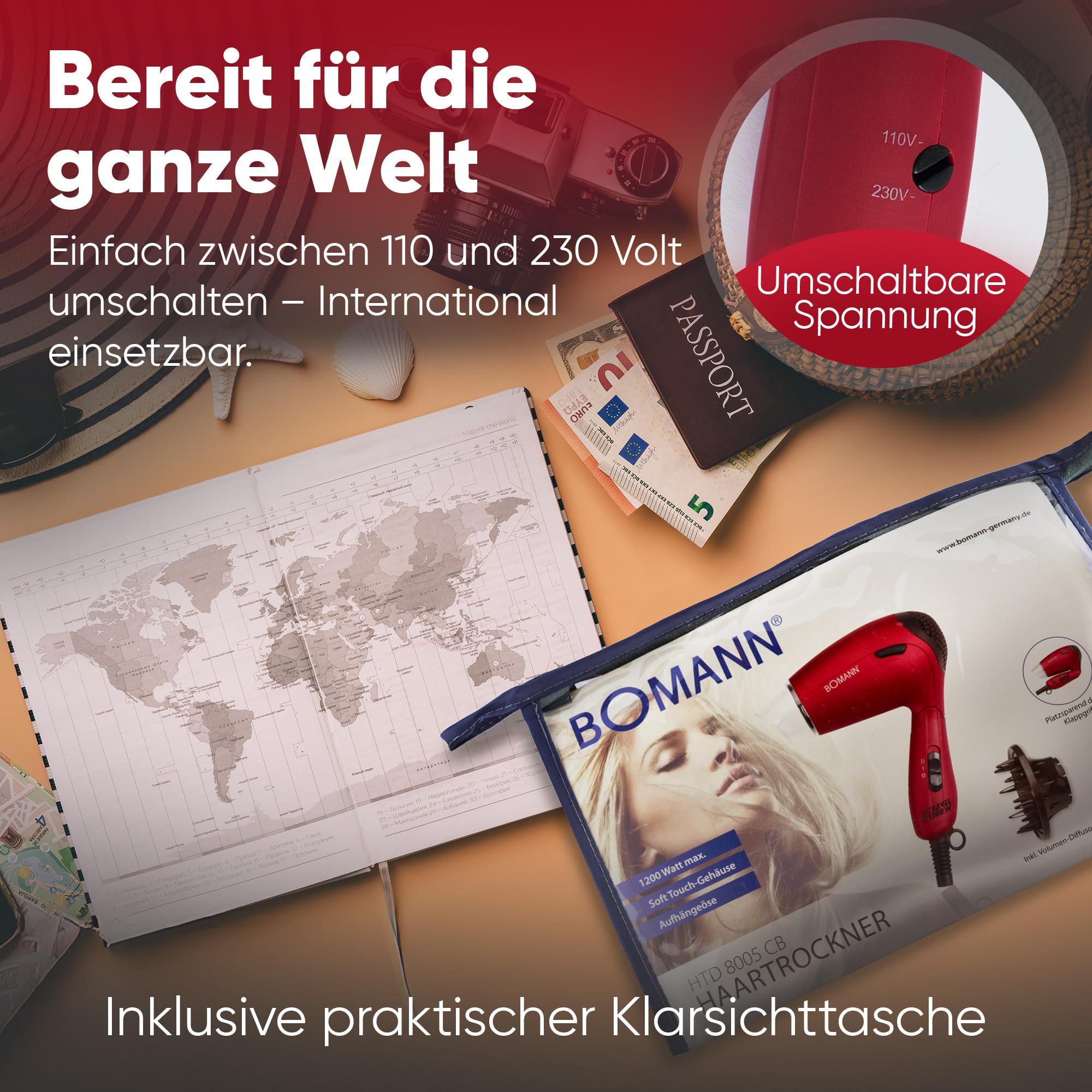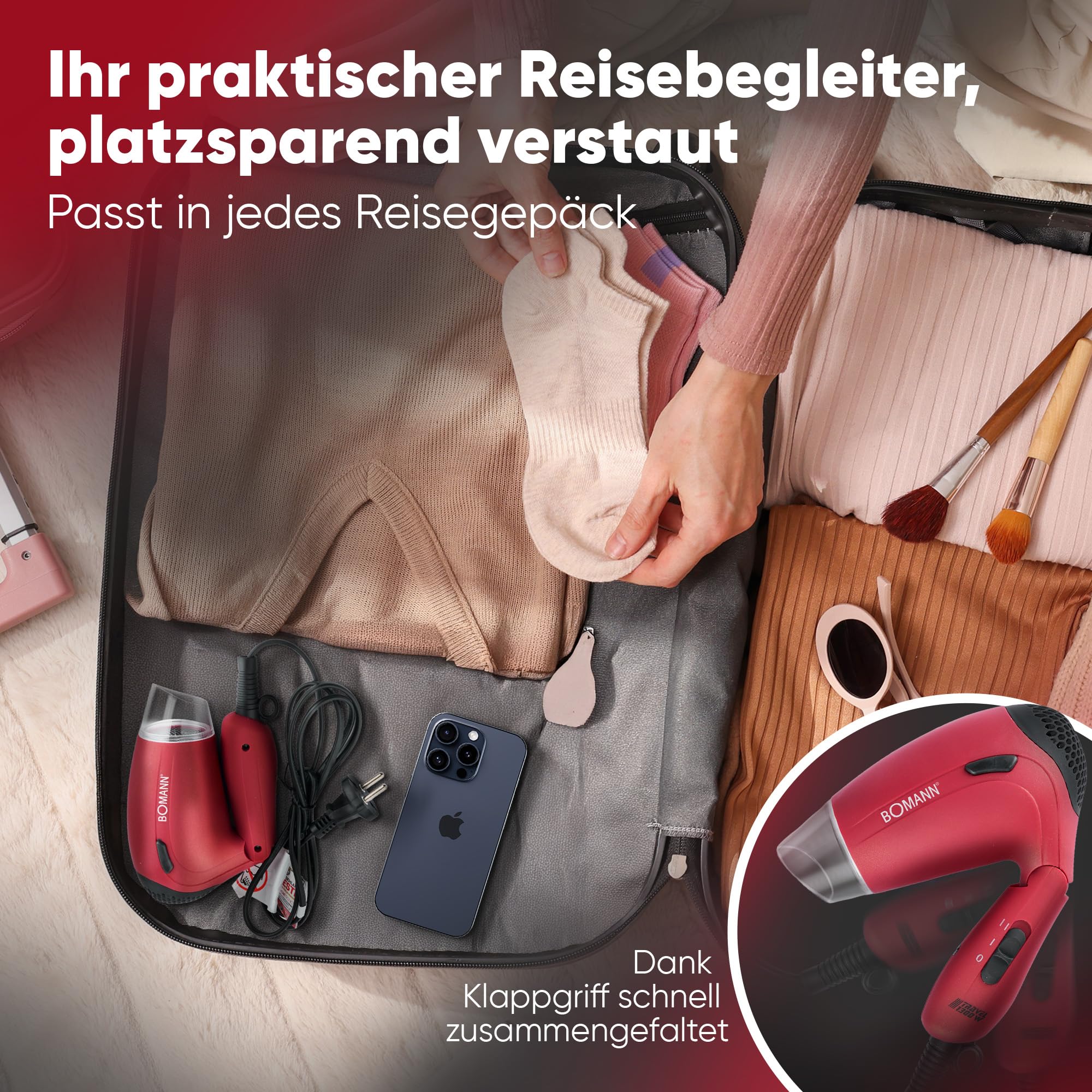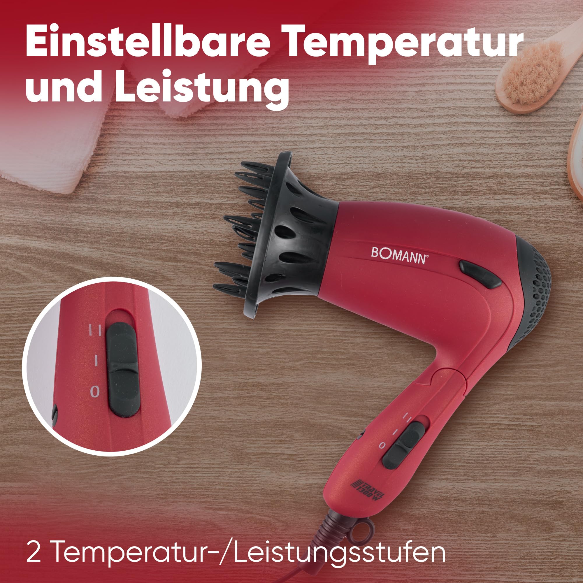 Bomann® Haartrockner klappbar | 1200W Reisehaartrockner | 2 Stufen | inkl. Diffusor und Tasche | Spannungsversorgung umschaltbar 110/230V | Raartrockner klein | Hair Dryer HTD 8005 CB rot
