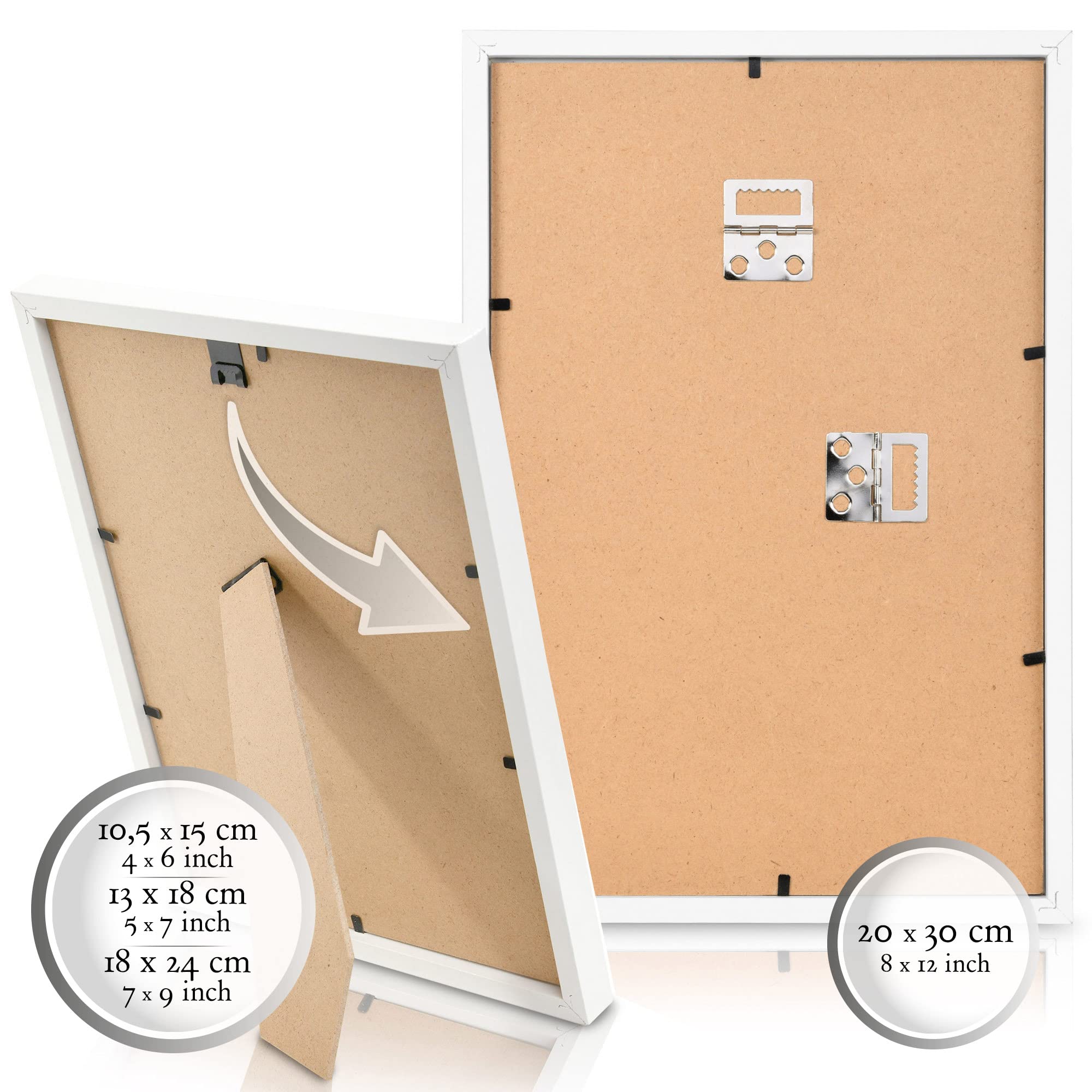 Bilderrahmen von Bomoe für die Wanddekoration aus MDF-Holz und Kunststoffglas. Möchten Sie eine Lösung, um Ihre Wände stilvoll zu dekorieren, Ihre Fotos aufzuhängen oder Ihre Zeichnungen immer im Blick zu haben? Mit diesen bomoe-Bilderrahmen finden Sie die perfekte Lösung. Die Rahmen können in einem einzigen Raum verwendet werden, um an einer Wand angebracht zu werden, um einen dekorativen Effekt zu erzielen, egal ob im Quer- oder Hochformat. Des Weiteren sind die Rahmen mit Füssen und einem Metalldraht ausgestattet, mit dem sie problemlos auf Tischen oder Möbeln aufgestellt werden können. Die Bilderrahmen für Bilder sind aus MDF Holz und Kunststoffglas. So werden Ihre Fotos, egal ob Familienfotos, Urlaubsbilder, Kunst oder Zeichnungen lange vor Schmutz geschützt. Dieses Set beinhaltet Passepartouts und Passepartouts für alle Bilderrahmen. So können Sie auch kleinere Fotos als Rahmen einfügen, die ihren Stempel erhalten. Mit den Passepartouts können Sie folgende Grössen ändern: ohne Passepartout: 20x30cm, 18x24cm, 13x18cm und 10x15cm Mit Passepartouts 15x20cm, 13x18cm, 9x13cm und 7x10cm Produktdetails Marke: bomoeLieferumfang: Lieferumfang: 6 Stück. 10,5 x 15 cm / 4 x 13 x 18 cm / 4 x 18 x 24 cm / 4 x 20 x 30 cm Bilderrahmen Material: MDF-Holz und Kunststoffglas. Inklusive Passepartouts für alle Rahmen