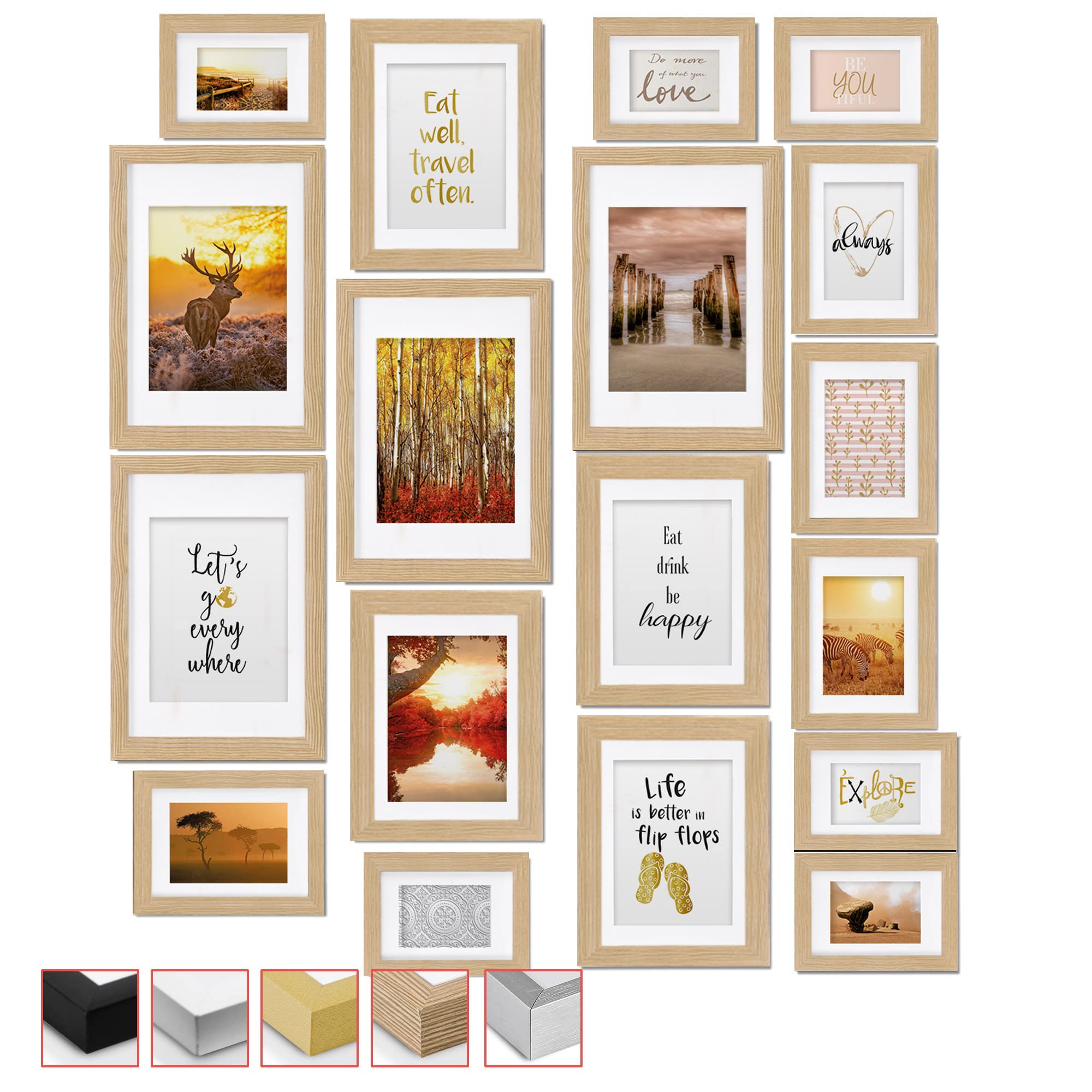 bomoe 18er Bilderrahmen Set – 6x 10x15 cm, 4x 13x18 cm, 4x 18x24 cm, 4x 20x30 cm Fotowand Bilder Set Holz & Kunststoffglas Holzbilderrahmen mit Passepartout Eiche