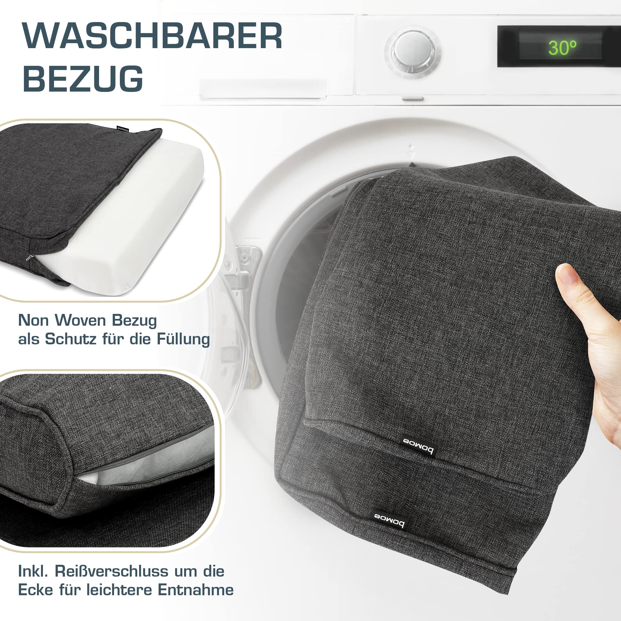 Das bomoe Outdoor Lounge Kissen mit dem Namen Ilano ist ein hochwertiges Sitzkissen/Rückenkissen in Anthrazit. Das Kissen bietet einen exzellenten Sitzkomfort über viele Jahre hinweg, dank des hochwertigen Schaumstoffkerns mit hoher Sprungelastizität. Der Bezug besteht aus Premium-Polypropylen, das spinndüsengefärbt und wasserabweisend ist. Zusätzlich ist der Bezug pflegeleicht, atmungsaktiv und strapazierfähig. Die Innen gekettelten Nähte vermeiden Fransenbildung. Das atmungsaktive Spezialgewebe ummantelt den Kern und sorgt dafür, dass das Kissen formschön bleibt. Der verdeckte Reissverschluss ermöglicht ein einfaches Entfernen des Bezugs, um ihn bei 30°C zu waschen. Das Kissen ist in verschiedenen Farben erhältlich und es gibt sowohl ein Rückenkissen als auch ein Sitzkissen. Das Kissen wird mit passendem Wattevlies geliefert und ist sofort einsatzbereit. Das Kissen wird in Europa hergestellt und ist mit dem OEKO-TEX Zertifikat ausgestattet, welches garantiert, dass die benutzten Materialien auf Schadstoffe geprüft wurden. Dieses hochwertige Kissen bietet Ihnen ein perfektes Sitzerlebnis und ist ein Must-have für Ihren Gartenstil. Sitzkissen: 50 x 50 x 9 cm 60 x 60 x 9 cm 70 x 70 x 9 cm Rückenkissen: 50 x 40 x 10-19 cm 60 x 40 x 10-19 cm 70 x 40 x 10-19 cm Produktdetails: Kern: die Inhalte passen zu unserem Produkt bis auf: wir haben 25 kg/m³ Oberfläche: Sehr hohe UV- und Lichtbeständigkeit (7-8) Wasserabweisende Oberfläche mit Fleckenschutz Exzellente Farbechtheit Reissverschluss: Metallschieber und verdeckter Reissverschluss Bezug: Premium Qualität Spinndüsengefärbtes Polypropylen Pflegeleicht, atmungsaktiv, strapazierfähig Innen gekettelte Nähte zur Vermeidung von Fransen Atmungsaktives Spezialgewebe: Ummantelt mit Trikotgewebe, Vorteile: besseres einsetzten der Hülle (der Reissverschluss bleibt nicht am Vlies hängen), durch das Gewebe bleibt das Kissen formschön. Wattevlies