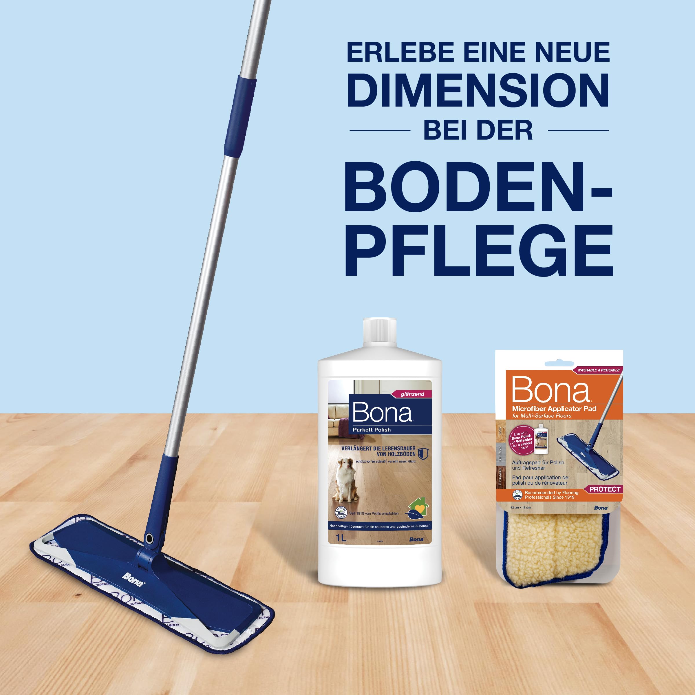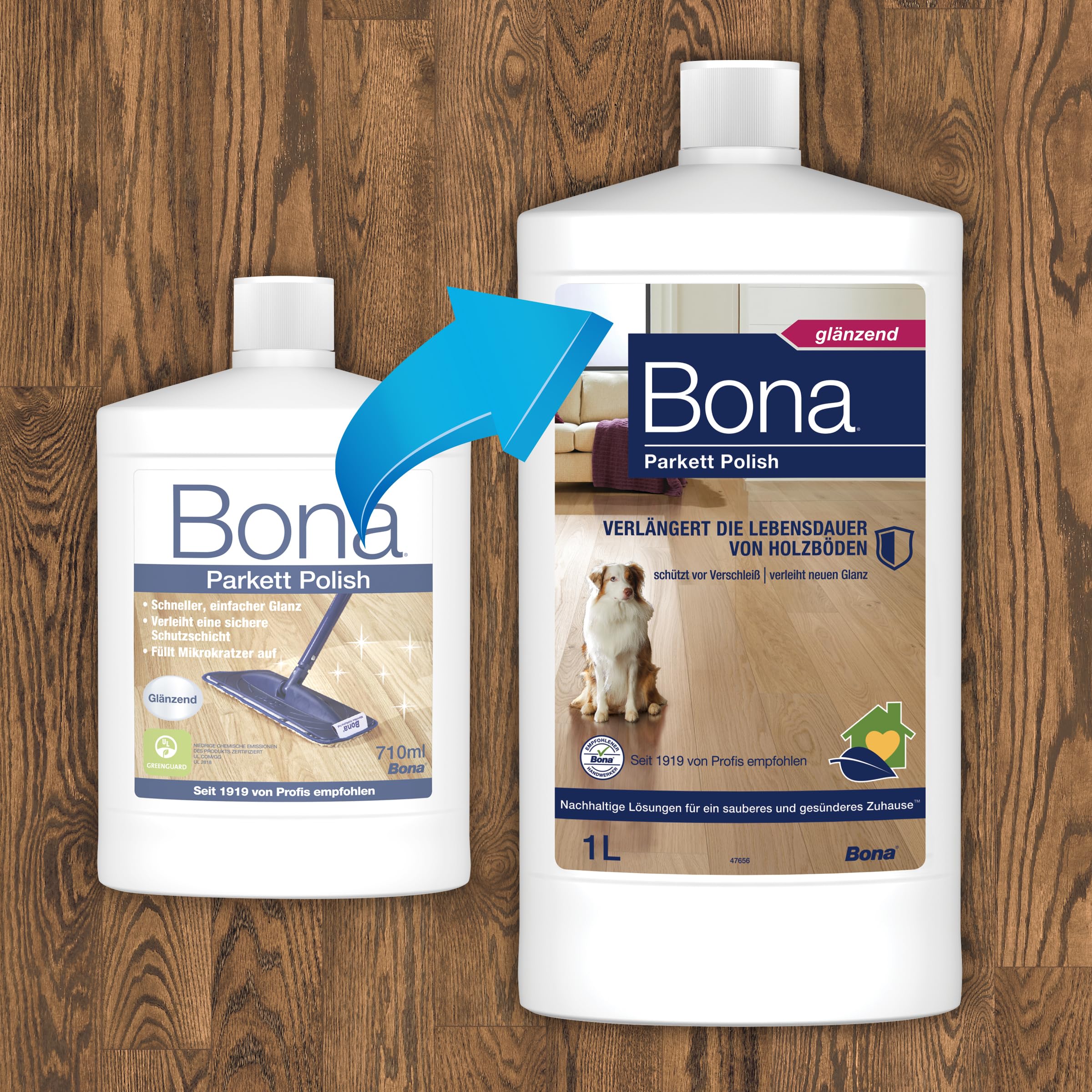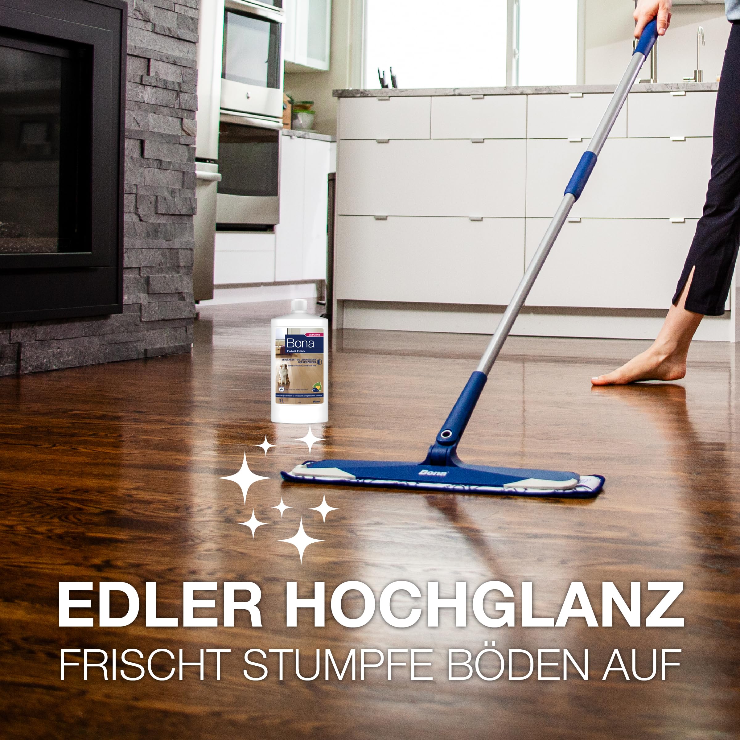 Bona Parkett Öl Polish Glänzend, Parkettreiniger und Parkettpflege für lackierte Holzböden 1 L, Parkett Politur, Parkett Pflegemittel, Parkett Versiegelung