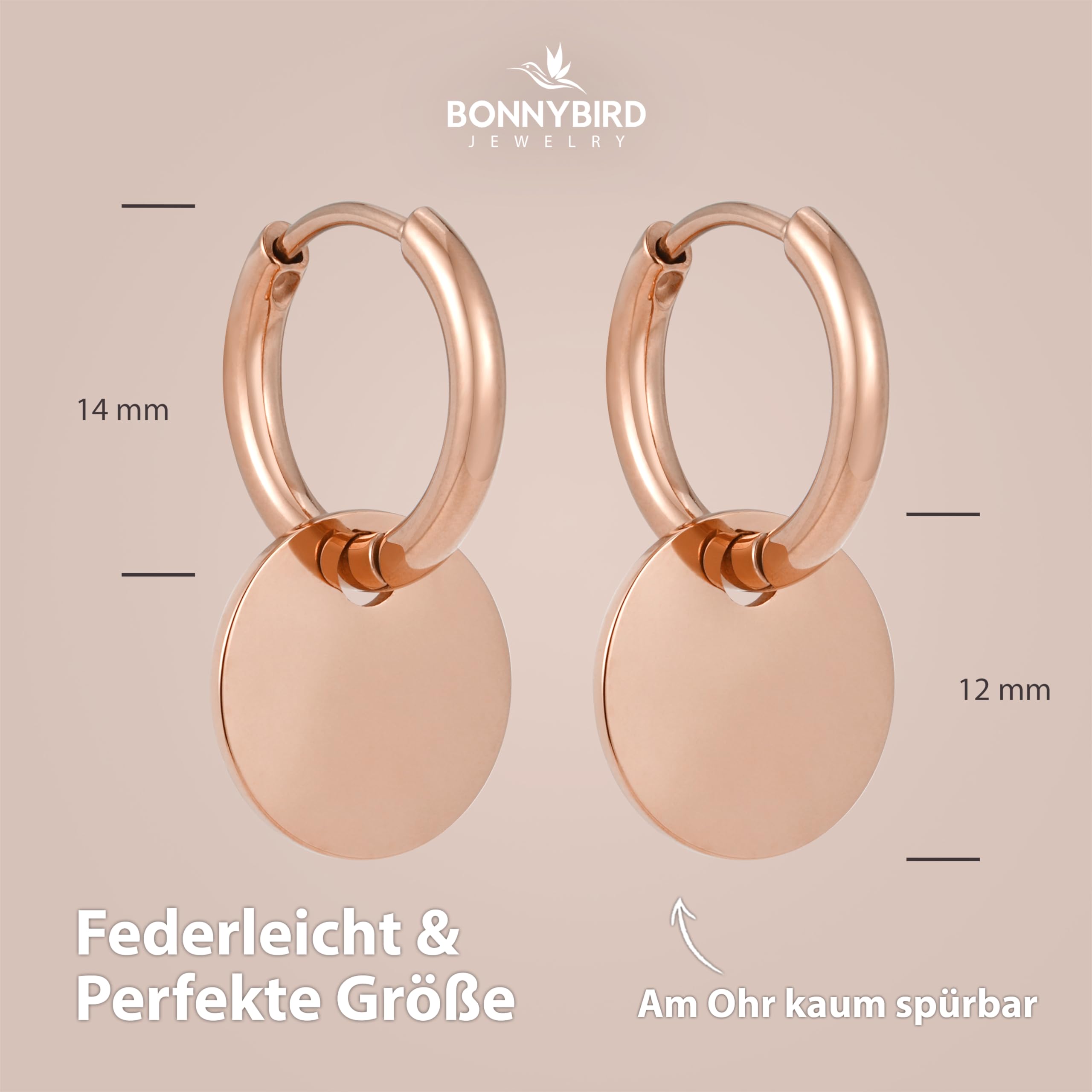 BONNYBIRD® Wasserfeste Edelstahl Creolen mit Pättchen in Silber, Gold & Roségold - Premium Creolen mit Anhänger aus Chirurgenstahl, 100% Wasserfest & Hautverträglich "BonnyCoin" (14 mm)