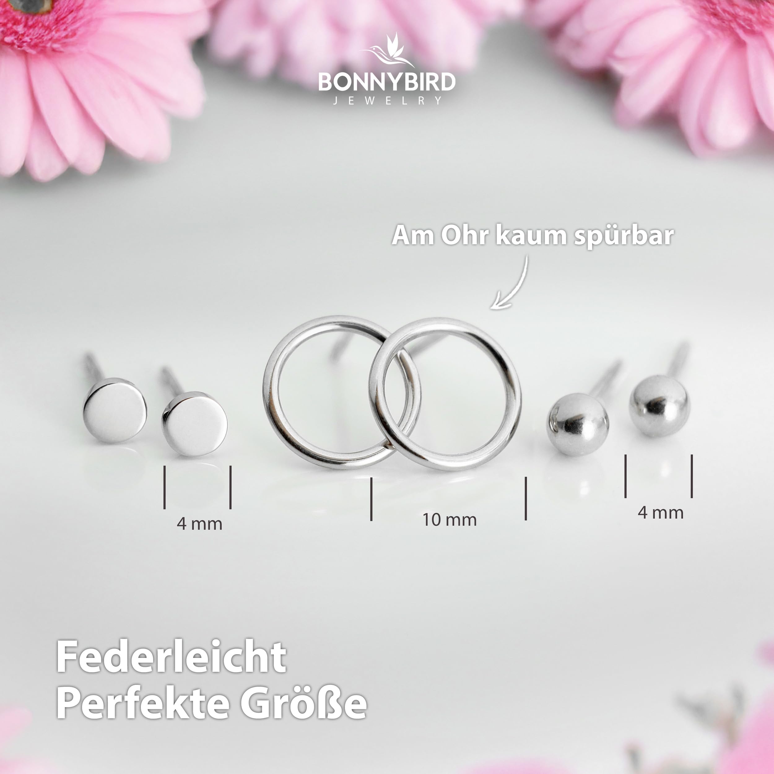Das Ohrringe Set Silber von BONNYBIRD ist aus hochwertigem Edelstahl gefertigt. Die Chirurgenstahl Ohrringe Edelstahl Damen sind somit sehr langlebig und widerstandsfähig. Medizinische Ohrringe für mehrere Ohrlöcher haben den Vorteil, dass sie von jedem Hauttyp sehr gut vertragen werden. So sind die Ohrstecker Chirurgenstahl echte Gesundheitsstecker Ohrringe, die Rötungen und allergische Reaktionen verhindern. Edelstahl Ohrringe Damen sind aufgrund der besonderen Eigenschaften aber für jeden Träger die optimale Wahl. Im Vergleich zu Ohrstecker Silber 925 ist Edelstahl härter und läuft nicht an. Ein Ohrringe Silber 925 Set hat eine ähnliche Farbe und Glanz wie Ohrstecker Edelstahl, aber das Silber-Material ist deutlich weicher und somit nicht so widerstandsfähig. Zudem handelt es sich bei den BonnyClassics um Nickelfreie Ohrringe. Ob Sie nun also ein Ohrstecker Silber 925 Set oder medizinische ohrringe damen aus Edelstahl kaufen, macht in der Optik keinen grossen Unterschied. Die Material Beschaffenheiten und Eigenschaften unterscheiden sich aber recht deutlich. Sie sind auf der Suche nach Ohrringe Klein? Dann sind diese Mini Ohrstecker genau das richtige für Sie. Das Ohrring Set für mehrere Ohrlöcher besteht aus Ohrstecker Kugel, Ohrstecker Plättchen und Kreis Ohrringe. Die Ohrstecker rund sind nur 4 mm in der Grösse. Das ist ein optimaler Durchmesser für Edelstahl Ohrstecker. Es sind folglich Ohrstecker klein, die in jedes Ohrloch passen. Für das Ohrringe Stecker Set verwenden wir nur die besten Rückstecker, sodass du die Ohrstecker Edelstahl Damen nicht verlierst. Die Ohrring Stecker werden also einen guten Halt haben. Die Ohrringe Plättchen lassen sich besonders gut mit mit den Ohrringe Kreis kombinieren. Alles in allem ist das Ohrstecker Set Silber das perfekte Basic Set, das jede Frau zu Hause haben sollte. Nicht nur weil die Ohrstecker Kreis gerade voll im Trend liegen, sondern auch weil dieses Ohrstecker Set Edelstahl nie alt werden wird und immer passend ist.