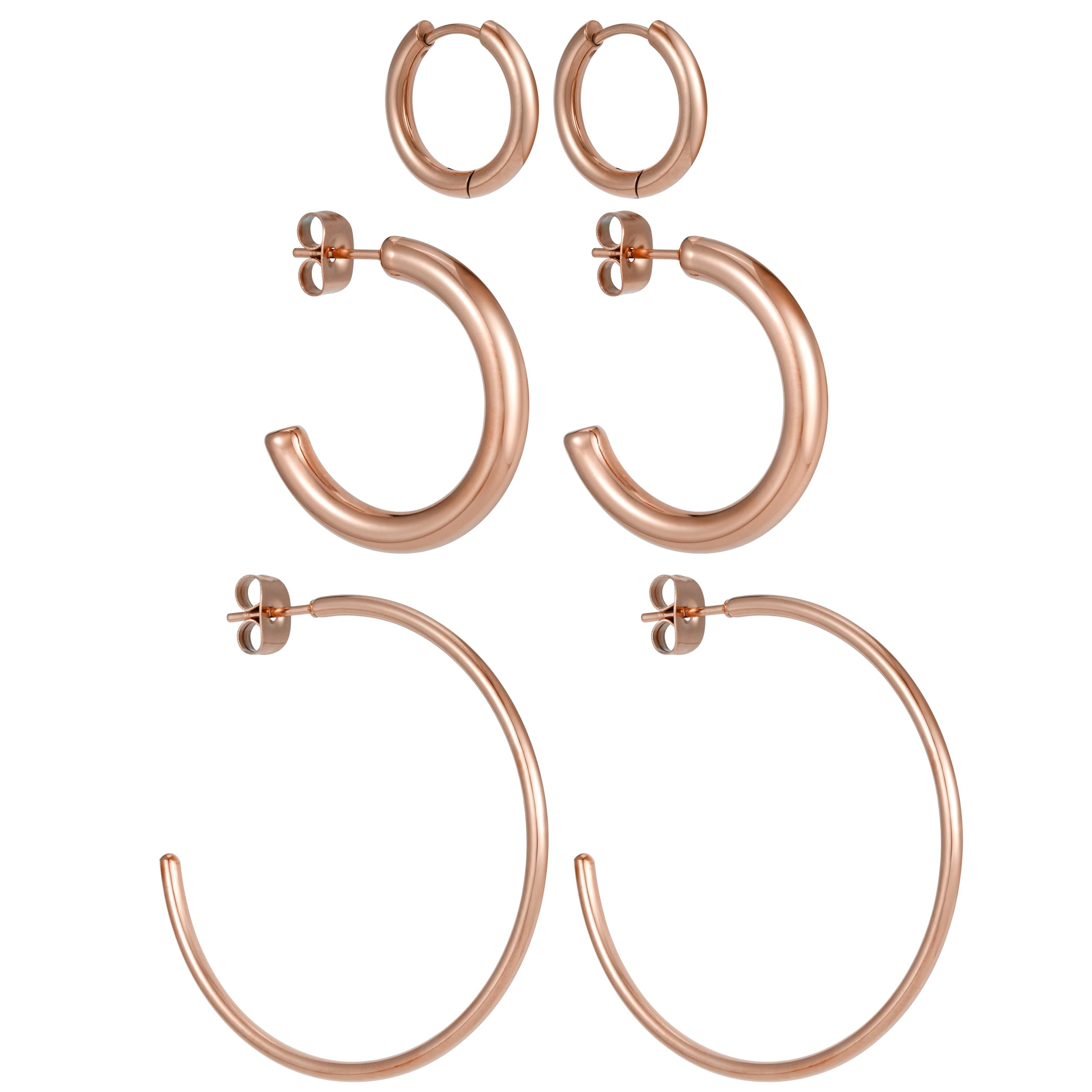 Das Creolen Ohrringe Set besteht aus Creolen Dünn Gross, Breite Creolen und kleinen Creolen. Die Rosegold Ohrringe Damen sind aus hochwertigem Edelstahl gefertigt. Das 3er Set Creolen Gross ist somit sehr langlebig und widerstandsfähig. Es handelt es sich um Ohrringe Creolen Rosegold, die Rötungen und allergische Reaktionen verhindern. Ohrstecker Set mit Rose Gold Hoops, Creolen Rosegold klein und Creolen Breit sind aufgrund der besonderen Eigenschaften die optimale Wahl. Im Vergleich zu Creolen Silber 925 ist ein Creolen Edelstahl Set härter. Ein Ohrringe Silber 925 Set hat eine ähnliche Farbe und Glanz wie Creolen Set Edelstahl, aber das Silber-Material ist deutlich weicher und somit nicht so widerstandsfähig. Zudem handelt es sich bei den Ohrringe Creolen dünn, dicke Creolen und Creolen Gold klein um nickelfreie Ohrringe Edelstahl Rosegold. Ob du nun also Creolen Silber 925 oder Creolen Edelstahl Damen kaufst, macht in der Optik keinen grossen Unterschied. Sie sind auf der Suche nach Creolen Rosegold gross? Dann sind diese Ohrringe Rosegold Set Creolen Damen Edelstahl genau das richtige für Sie. Das Ohrringe 3er Set besteht aus Creolen Set verschiedene Grössen: Creolen Set Gross, kleine Creolen Set und Creolen dick. Das Creolen Schmuck Set Creolen Rosegold Damen in unterschiedlichen Grössen (kleine Creolen Gold, grosse dünne Creolen Gold) hat den Vorteil, dass es besonders leicht ist. Somit lässt sich unser Kreolen Rosegold Set besonders angenehm am Ohr tragen. Ein Creolen Set verschiedene Grössen ist auch ein schönes Geschenk. Das Creolen Set Creolen Edelstahl Breit macht immer etwas her und sorgt sicherlich für eine tolle Überraschung. Edelstahl Ohrringe Damen haben aber auch den Vorteil, dass sie sich perfekt kombinieren lassen. Kleine Mini Kreolen können beispielweise auch mit Ohrclips und Ohrklemmen kombiniert werden. Wenn du also ein Schmuck Set Creolen vergoldete Ohrringe kaufen möchtest, dann ist das Ohrringe Gross Creolen Set genau das richtige für dich!