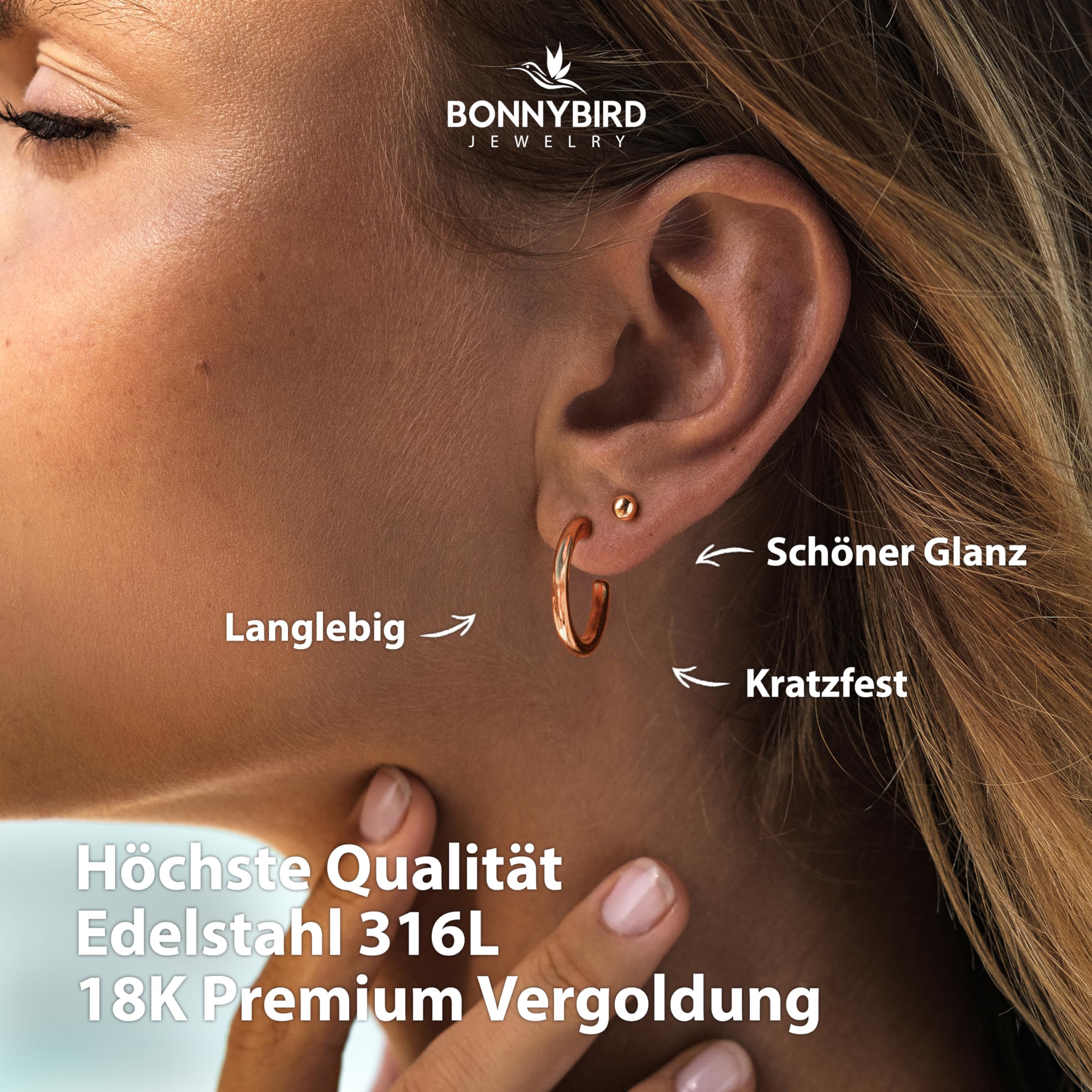 BONNYBIRD® Wasserfeste Edelstahl Ohrringe Damen in Silber, Gold & Roségold, Hypoallergen dank medizinischem Chirurgenstahl, Extra Leicht