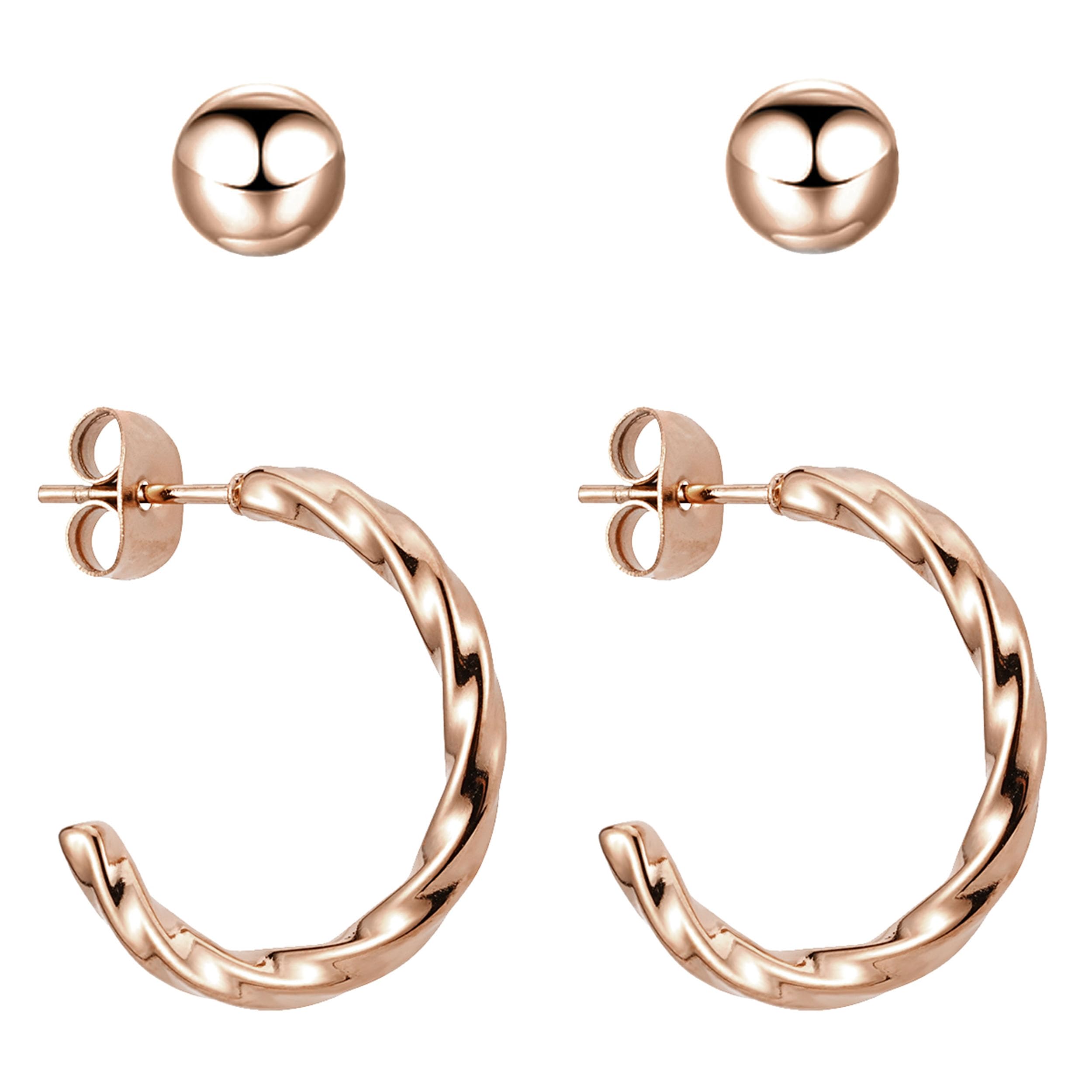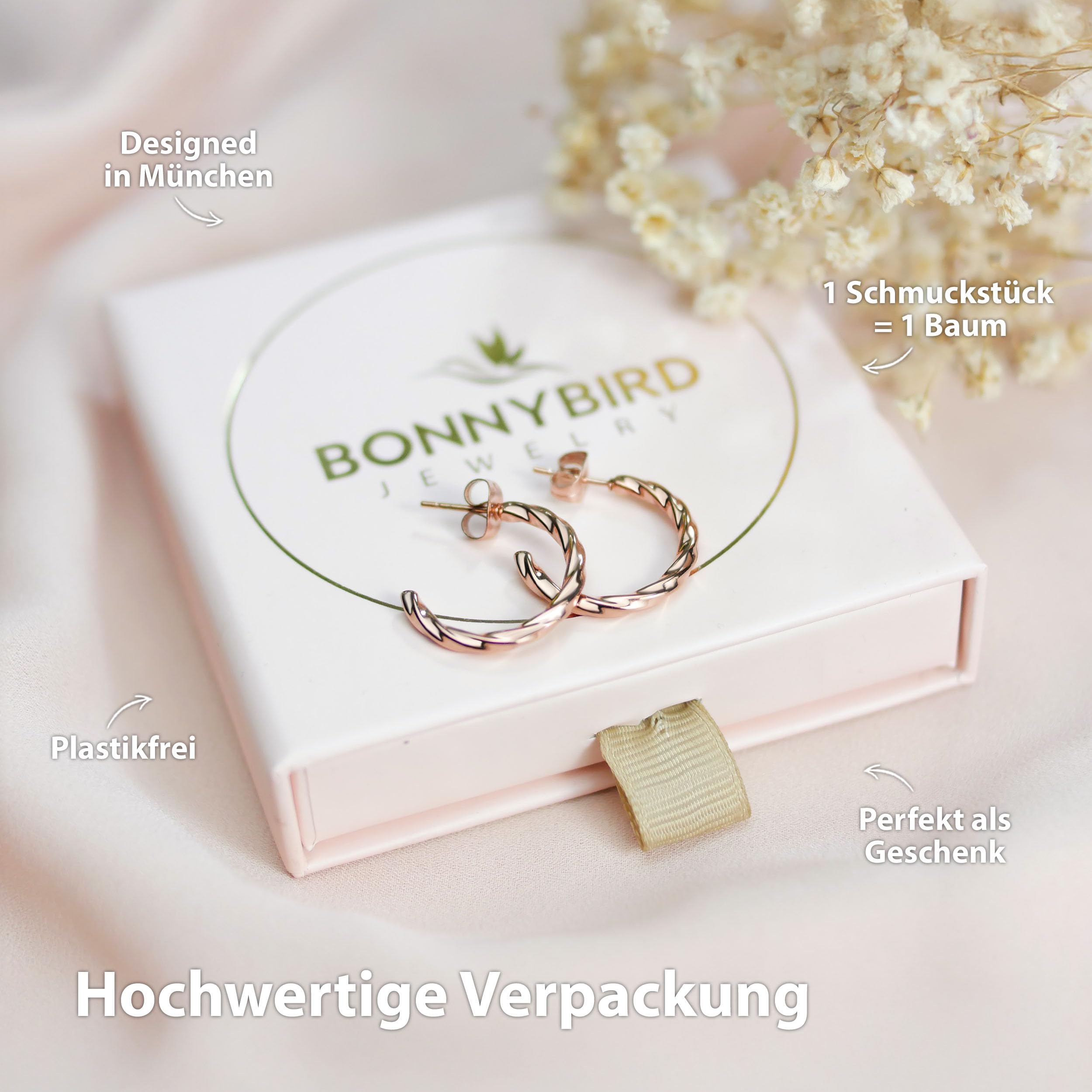 Das Creolen Set von BONNYBIRD ist aus hochwertigem Edelstahl gefertigt. Die Creolen Rosegold Gedreht aus Chirurgenstahl sind somit sehr langlebig und widerstandsfähig. Medizinische Ohrringe für mehrere Ohrlöcher haben den Vorteil, dass sie von jedem Hauttyp sehr gut vertragen werden. Somit handelt es sich um kleine Creolen Rose, die Rötungen und allergische Reaktionen verhindern. Edelstahl Ohrringe Damen sind aufgrund der besonderen Eigenschaften aber für jeden Träger die optimale Wahl. Im Vergleich zu Creolen Silber 925 ist Edelstahl härter und läuft nicht an. Ein Ohrringe Silber 925 Set hat eine ähnliche Farbe und Glanz wie Creolen Edelstahl, aber das Silber-Material ist deutlich weicher und somit nicht so widerstandsfähig. Zudem handelt es sich bei den BonnyTwist um nickelfreie Rosegold Ohrringe Damen. Ob du nun also kleine Creolen Silber 925 oder Edelstahl Creolen kaufst, macht in der Optik keinen grossen Unterschied. Die Material Beschaffenheiten unterscheiden sich deutlich. Sie sind auf der Suche nach Ohrringe Rosegold Creolen? Dann sind diese Mini Creolen Rosegold Damen genau das richtige für Sie. Das Ohrring Set besteht aus geschwungenen Creolen und zwei kleinen Kugel Ohrsteckern. Die Ohrstecker rund sind nur 4 mm in der Grösse. Das ist ein optimaler Durchmesser für Edelstahl Ohrstecker. Creolen Rosegold Klein haben den Vorteil, dass sie besonders leicht sind. Somit lässt sich unsere Creole Rosegold besonders angenehm am Ohr tragen. Ein Creolen Set klein ist auch ein schönes Geschenk. Gold Ohrringe Rose machen immer etwas her und sorgen sicherlich für eine tolle Überraschung. Creolen klein haben aber auch den Vorteil, dass sie sich perfekt kombinieren lassen. Kleine Kreolen können auch mit Ohrclips und Ohrklemmen kombiniert werden. Unsere Rosegold Kreolen klein können aber auch mit grossen Creolen rose vergoldet kombiniert werden. Wenn du also gedrehte Ohrringe Creolen kaufen möchten, dann sind die Kreolen von BONNYBIRD genau das richtige für dich!