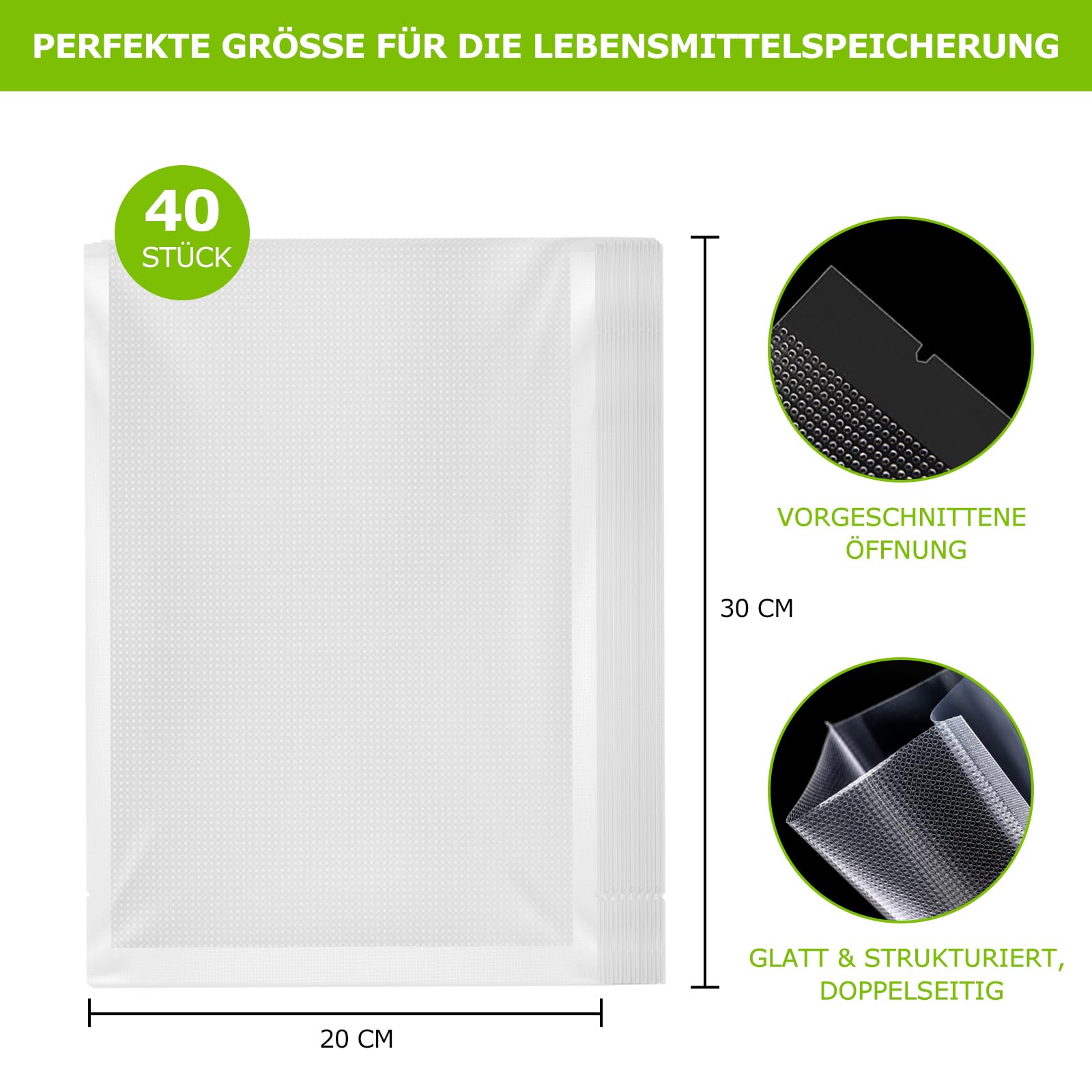 - UNIVERSAL SIZE Food Saver-Verpackungsbeutel: Der Bonsenkitchen 40 Beutel 20x30cm Vakuumbeutel ist kompatibel mit allen vakuumierer mit einer Siegelbreite von mehr als 20 cm. Fast alle Lebensmittel folienschweissgerät haben Dichtungen von mehr als 20cm. Mit unseren professionellen Vakuumbeuteln können Sie Rindfleisch, Lachs, Garnelen, Hühnchen und anderes Fleisch sowie Snacks, Nüsse, Obst und Gemüse vakuumieren.