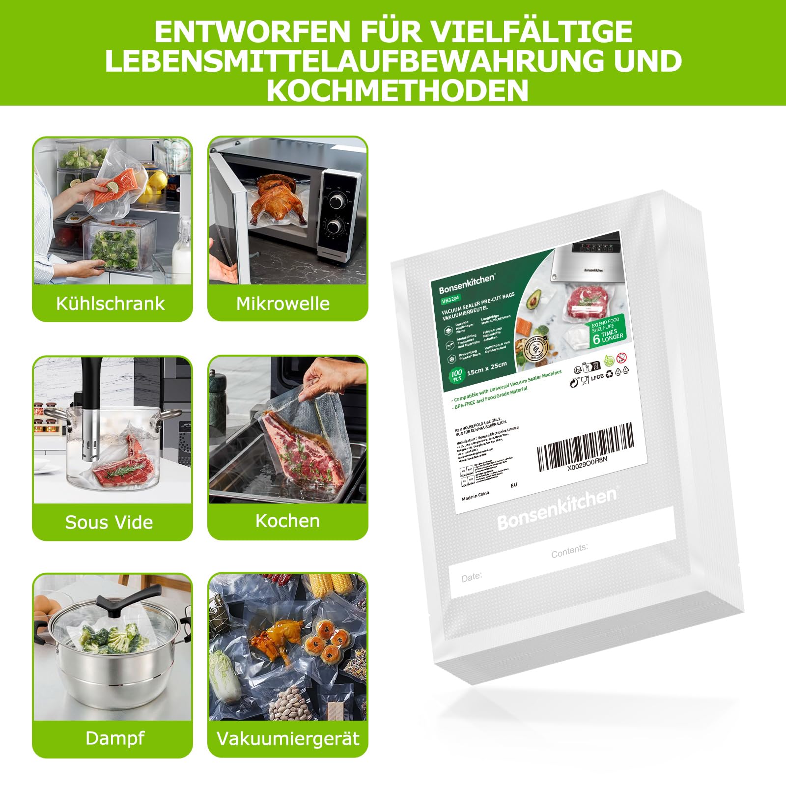Bonsenkitchen Vakuumierbeutel 15x25cm, 100 Beutel Profi-Folienbeutel für alle Vakuumiergerät, vakuumbeutel für lebensmittel, Sous Vide Gefrierbeutel, Einschweissbeutel, BPA-frei