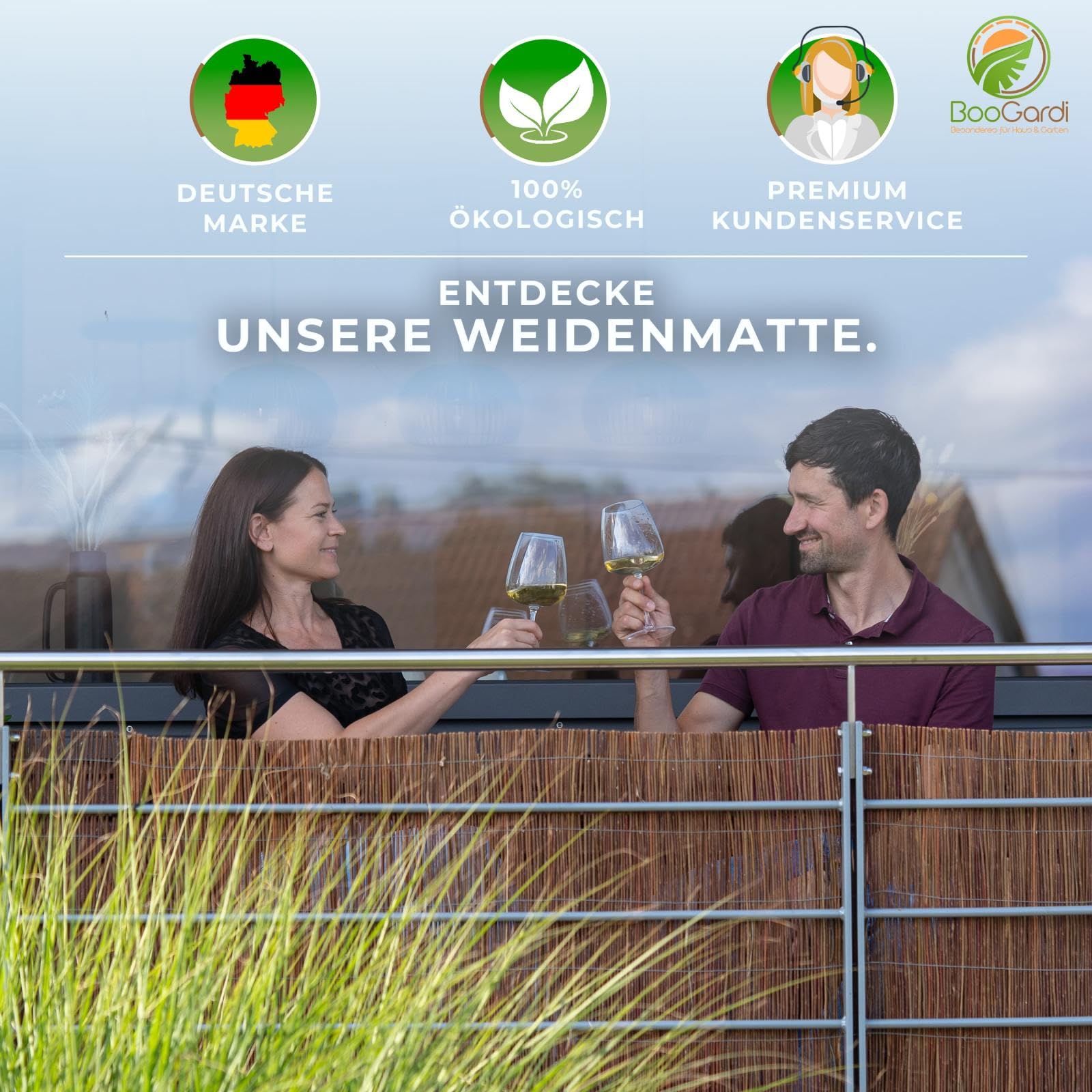 Qualitäts-Sichtschutzmatte von BooGardi - Verwenden Sie unsere Weidenmatte als Wind- und Sichtschutz für Garten, Balkon oder Terrasse.Witterungsbeständiges NaturproduktUnser Weidenzaun ist ein vielseitig verwendbares Naturprodukt. Sie erhalten unsere Naturmatte aus Weidenzweigen in vielen verschiedenen Höhen und Längen.Die Eigenschaften unserer Weidenmatte:Material: WeideFarbe: BraunHöhe: 80 200 cmLänge: 300 oder 500 cmalle 10 cm mit 0,5 - 0,8 starkem, verzinktem Draht verwebtwiderstandsfähig gegen Wind und Wasserdie einzelnen Weidenruten messen ca. 3-9mm im DurchmesserDrahtüberstand am Rand (leichtes Kürzen und Verlängern)EU-QualitätswareMontage leicht gemachtDer praktische Drahtüberstand am Rand erlaubt es, mehrere Weidenmatten unkompliziert und nahezu unsichtbar zu verbinden um auch lange Wände, Zäune oder Geländer vollflächig abdecken zu können.Bei Verwendung als Sichtschutzmatte empfehlen eine doppellagige Anbringung, da diese einen höheren Sichtschutz bietet als eine einfache Lage. Alternativ kann auch ein Schattierungsnetz oder Ähnliches hinter die Matte gespannt werden.Bei der Abdeckung eines bestimmten Elements sollte die Weidenmatte nicht über dieses überstehen, da sie sonst durch Wind oder Regen entlang der Kante brechen kann. Passen Sie die Matte also immer genau an die Höhe von Zaun, Geländer, etc. an.Eine Anleitung zum Kürzen der Länge finden Sie in den Produktfotos. Die Höhe lässt sich ganz einfach mithilfe einer Astschere kürzen.Für eine maximale Haltbarkeit unserer Weidenmatte, empfehlen wir ausserdem die Befestigung mittels witterungsbeständigem Draht aus verzinktem Stahl oder Edelstahl, welche Sie ebenfalls bei uns beziehen können.