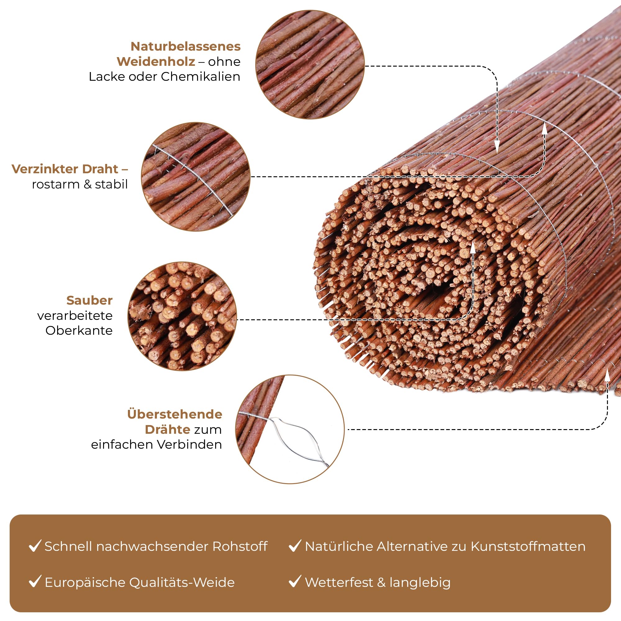 Qualitäts-Sichtschutzmatte von BooGardi - Verwenden Sie unsere Weidenmatte als Wind- und Sichtschutz für Garten, Balkon oder Terrasse.Witterungsbeständiges NaturproduktUnser Weidenzaun ist ein vielseitig verwendbares Naturprodukt. Sie erhalten unsere Naturmatte aus Weidenzweigen in vielen verschiedenen Höhen und Längen.Die Eigenschaften unserer Weidenmatte:Material: WeideFarbe: BraunHöhe: 80 200 cmLänge: 300 oder 500 cmalle 10 cm mit 0,5 - 0,8 starkem, verzinktem Draht verwebtwiderstandsfähig gegen Wind und Wasserdie einzelnen Weidenruten messen ca. 3-9mm im DurchmesserDrahtüberstand am Rand (leichtes Kürzen und Verlängern)EU-QualitätswareMontage leicht gemachtDer praktische Drahtüberstand am Rand erlaubt es, mehrere Weidenmatten unkompliziert und nahezu unsichtbar zu verbinden um auch lange Wände, Zäune oder Geländer vollflächig abdecken zu können.Bei Verwendung als Sichtschutzmatte empfehlen eine doppellagige Anbringung, da diese einen höheren Sichtschutz bietet als eine einfache Lage. Alternativ kann auch ein Schattierungsnetz oder Ähnliches hinter die Matte gespannt werden.Bei der Abdeckung eines bestimmten Elements sollte die Weidenmatte nicht über dieses überstehen, da sie sonst durch Wind oder Regen entlang der Kante brechen kann. Passen Sie die Matte also immer genau an die Höhe von Zaun, Geländer, etc. an.Eine Anleitung zum Kürzen der Länge finden Sie in den Produktfotos. Die Höhe lässt sich ganz einfach mithilfe einer Astschere kürzen.Für eine maximale Haltbarkeit unserer Weidenmatte, empfehlen wir ausserdem die Befestigung mittels witterungsbeständigem Draht aus verzinktem Stahl oder Edelstahl, welche Sie ebenfalls bei uns beziehen können.