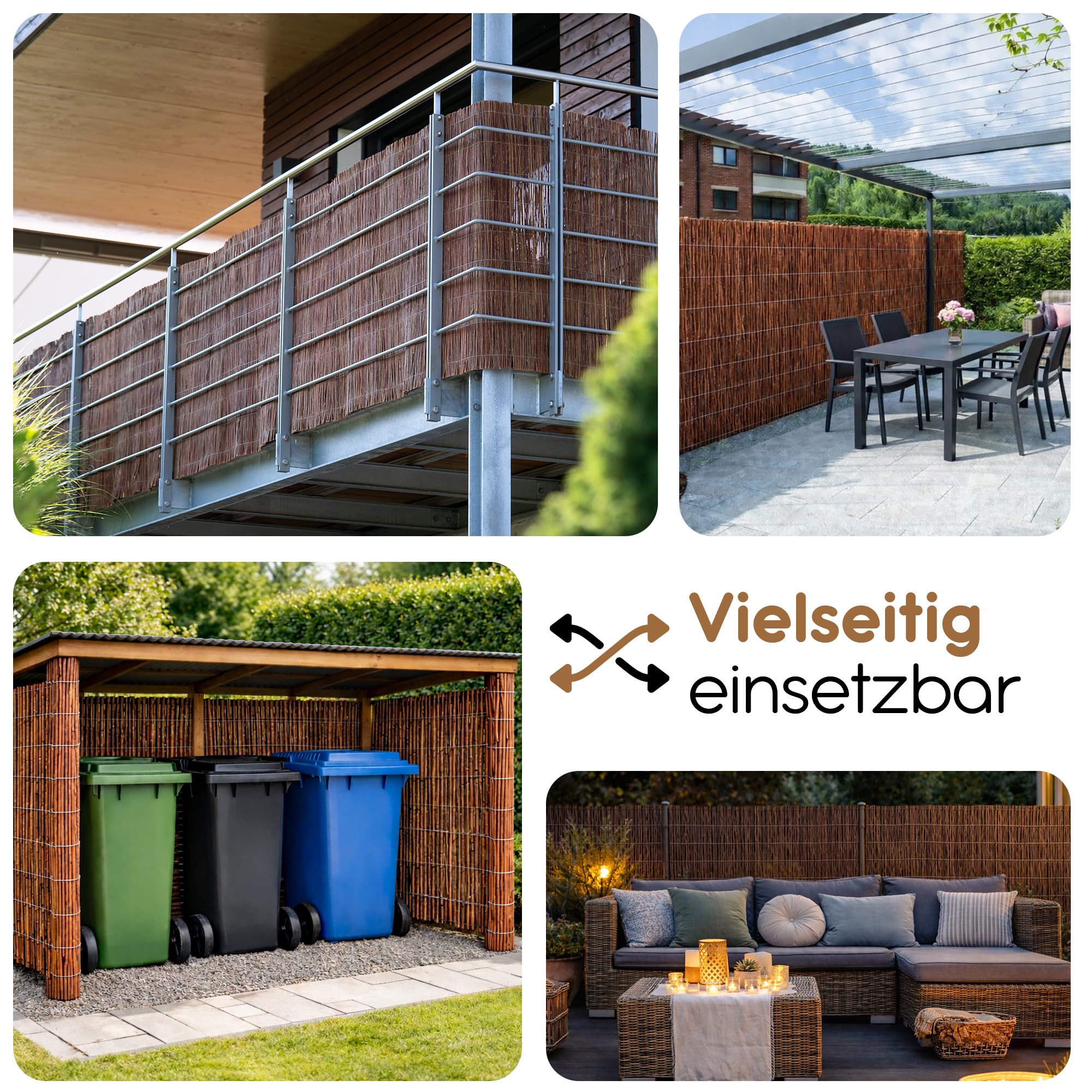 Qualitäts-Sichtschutzmatte von BooGardi - Verwenden Sie unsere Weidenmatte als Wind- und Sichtschutz für Garten, Balkon oder Terrasse.Witterungsbeständiges NaturproduktUnser Weidenzaun ist ein vielseitig verwendbares Naturprodukt. Sie erhalten unsere Naturmatte aus Weidenzweigen in vielen verschiedenen Höhen und Längen.Die Eigenschaften unserer Weidenmatte:Material: WeideFarbe: BraunHöhe: 80 200 cmLänge: 300 oder 500 cmalle 10 cm mit 0,5 - 0,8 starkem, verzinktem Draht verwebtwiderstandsfähig gegen Wind und Wasserdie einzelnen Weidenruten messen ca. 3-9mm im DurchmesserDrahtüberstand am Rand (leichtes Kürzen und Verlängern)EU-QualitätswareMontage leicht gemachtDer praktische Drahtüberstand am Rand erlaubt es, mehrere Weidenmatten unkompliziert und nahezu unsichtbar zu verbinden um auch lange Wände, Zäune oder Geländer vollflächig abdecken zu können.Bei Verwendung als Sichtschutzmatte empfehlen eine doppellagige Anbringung, da diese einen höheren Sichtschutz bietet als eine einfache Lage. Alternativ kann auch ein Schattierungsnetz oder Ähnliches hinter die Matte gespannt werden.Bei der Abdeckung eines bestimmten Elements sollte die Weidenmatte nicht über dieses überstehen, da sie sonst durch Wind oder Regen entlang der Kante brechen kann. Passen Sie die Matte also immer genau an die Höhe von Zaun, Geländer, etc. an.Eine Anleitung zum Kürzen der Länge finden Sie in den Produktfotos. Die Höhe lässt sich ganz einfach mithilfe einer Astschere kürzen.Für eine maximale Haltbarkeit unserer Weidenmatte, empfehlen wir ausserdem die Befestigung mittels witterungsbeständigem Draht aus verzinktem Stahl oder Edelstahl, welche Sie ebenfalls bei uns beziehen können.