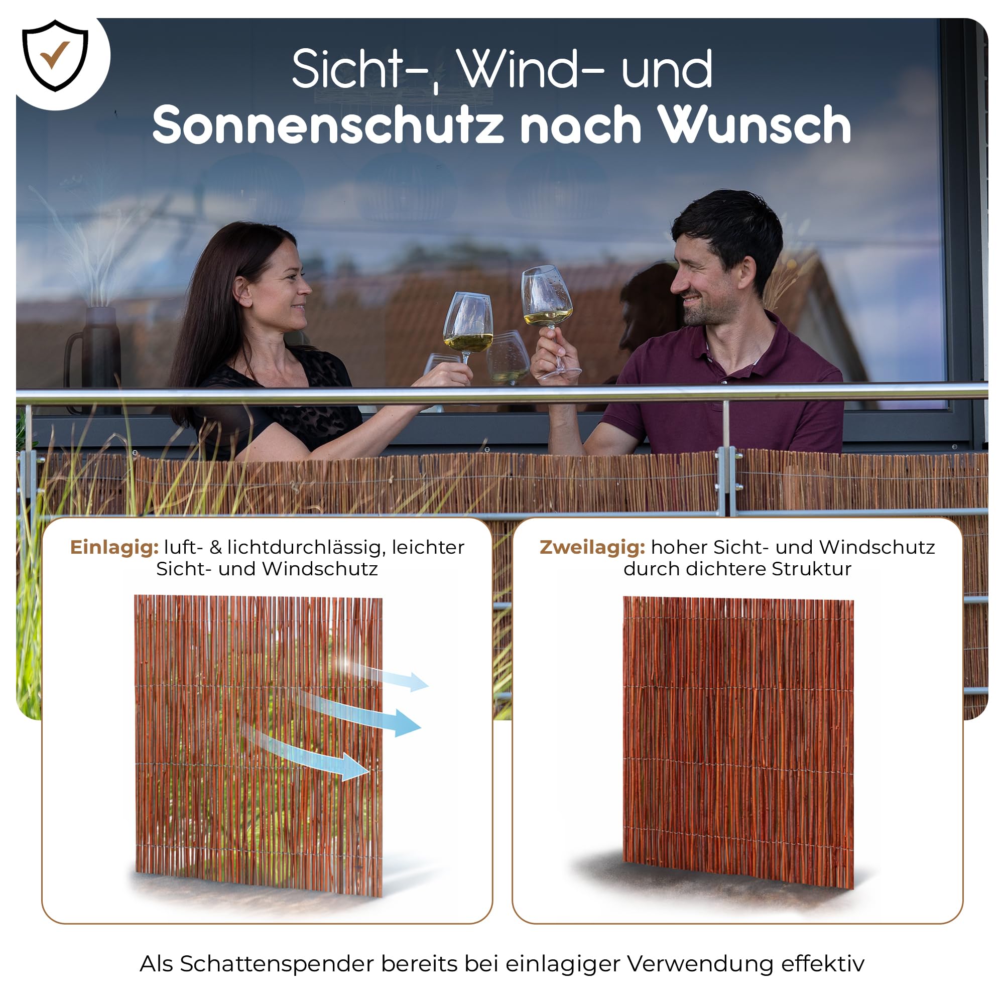 Qualitäts-Sichtschutzmatte von BooGardi - Verwenden Sie unsere Weidenmatte als Wind- und Sichtschutz für Garten, Balkon oder Terrasse.Witterungsbeständiges NaturproduktUnser Weidenzaun ist ein vielseitig verwendbares Naturprodukt. Sie erhalten unsere Naturmatte aus Weidenzweigen in vielen verschiedenen Höhen und Längen.Die Eigenschaften unserer Weidenmatte:Material: WeideFarbe: BraunHöhe: 80 200 cmLänge: 300 oder 500 cmalle 10 cm mit 0,5 - 0,8 starkem, verzinktem Draht verwebtwiderstandsfähig gegen Wind und Wasserdie einzelnen Weidenruten messen ca. 3-9mm im DurchmesserDrahtüberstand am Rand (leichtes Kürzen und Verlängern)EU-QualitätswareMontage leicht gemachtDer praktische Drahtüberstand am Rand erlaubt es, mehrere Weidenmatten unkompliziert und nahezu unsichtbar zu verbinden um auch lange Wände, Zäune oder Geländer vollflächig abdecken zu können.Bei Verwendung als Sichtschutzmatte empfehlen eine doppellagige Anbringung, da diese einen höheren Sichtschutz bietet als eine einfache Lage. Alternativ kann auch ein Schattierungsnetz oder Ähnliches hinter die Matte gespannt werden.Bei der Abdeckung eines bestimmten Elements sollte die Weidenmatte nicht über dieses überstehen, da sie sonst durch Wind oder Regen entlang der Kante brechen kann. Passen Sie die Matte also immer genau an die Höhe von Zaun, Geländer, etc. an.Eine Anleitung zum Kürzen der Länge finden Sie in den Produktfotos. Die Höhe lässt sich ganz einfach mithilfe einer Astschere kürzen.Für eine maximale Haltbarkeit unserer Weidenmatte, empfehlen wir ausserdem die Befestigung mittels witterungsbeständigem Draht aus verzinktem Stahl oder Edelstahl, welche Sie ebenfalls bei uns beziehen können.