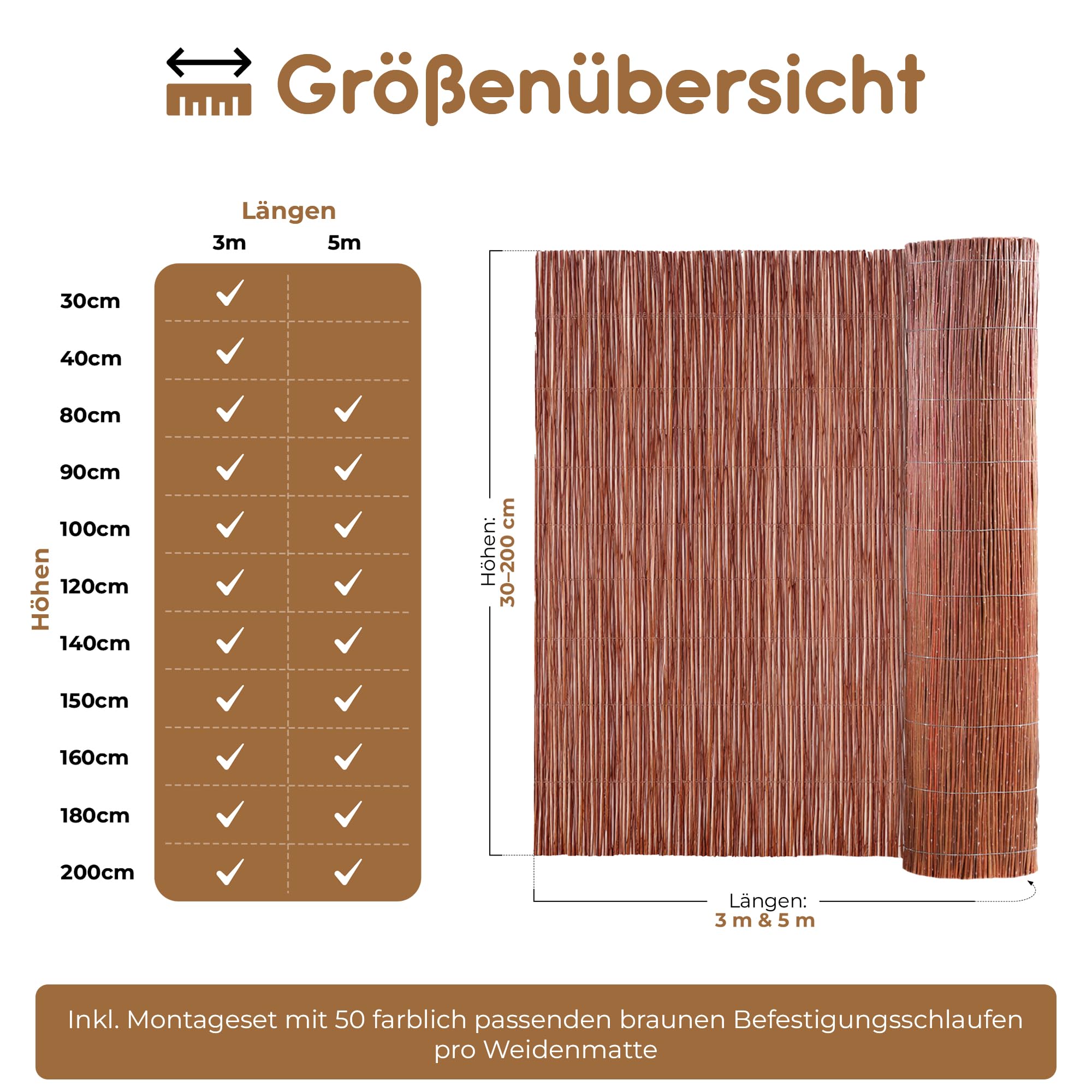 Qualitäts-Sichtschutzmatte von BooGardi - Verwenden Sie unsere Weidenmatte als Wind- und Sichtschutz für Garten, Balkon oder Terrasse.Witterungsbeständiges NaturproduktUnser Weidenzaun ist ein vielseitig verwendbares Naturprodukt. Sie erhalten unsere Naturmatte aus Weidenzweigen in vielen verschiedenen Höhen und Längen.Die Eigenschaften unserer Weidenmatte:Material: WeideFarbe: BraunHöhe: 80 200 cmLänge: 300 oder 500 cmalle 10 cm mit 0,5 - 0,8 starkem, verzinktem Draht verwebtwiderstandsfähig gegen Wind und Wasserdie einzelnen Weidenruten messen ca. 3-9mm im DurchmesserDrahtüberstand am Rand (leichtes Kürzen und Verlängern)EU-QualitätswareMontage leicht gemachtDer praktische Drahtüberstand am Rand erlaubt es, mehrere Weidenmatten unkompliziert und nahezu unsichtbar zu verbinden um auch lange Wände, Zäune oder Geländer vollflächig abdecken zu können.Bei Verwendung als Sichtschutzmatte empfehlen eine doppellagige Anbringung, da diese einen höheren Sichtschutz bietet als eine einfache Lage. Alternativ kann auch ein Schattierungsnetz oder Ähnliches hinter die Matte gespannt werden.Bei der Abdeckung eines bestimmten Elements sollte die Weidenmatte nicht über dieses überstehen, da sie sonst durch Wind oder Regen entlang der Kante brechen kann. Passen Sie die Matte also immer genau an die Höhe von Zaun, Geländer, etc. an.Eine Anleitung zum Kürzen der Länge finden Sie in den Produktfotos. Die Höhe lässt sich ganz einfach mithilfe einer Astschere kürzen.Für eine maximale Haltbarkeit unserer Weidenmatte, empfehlen wir ausserdem die Befestigung mittels witterungsbeständigem Draht aus verzinktem Stahl oder Edelstahl, welche Sie ebenfalls bei uns beziehen können.