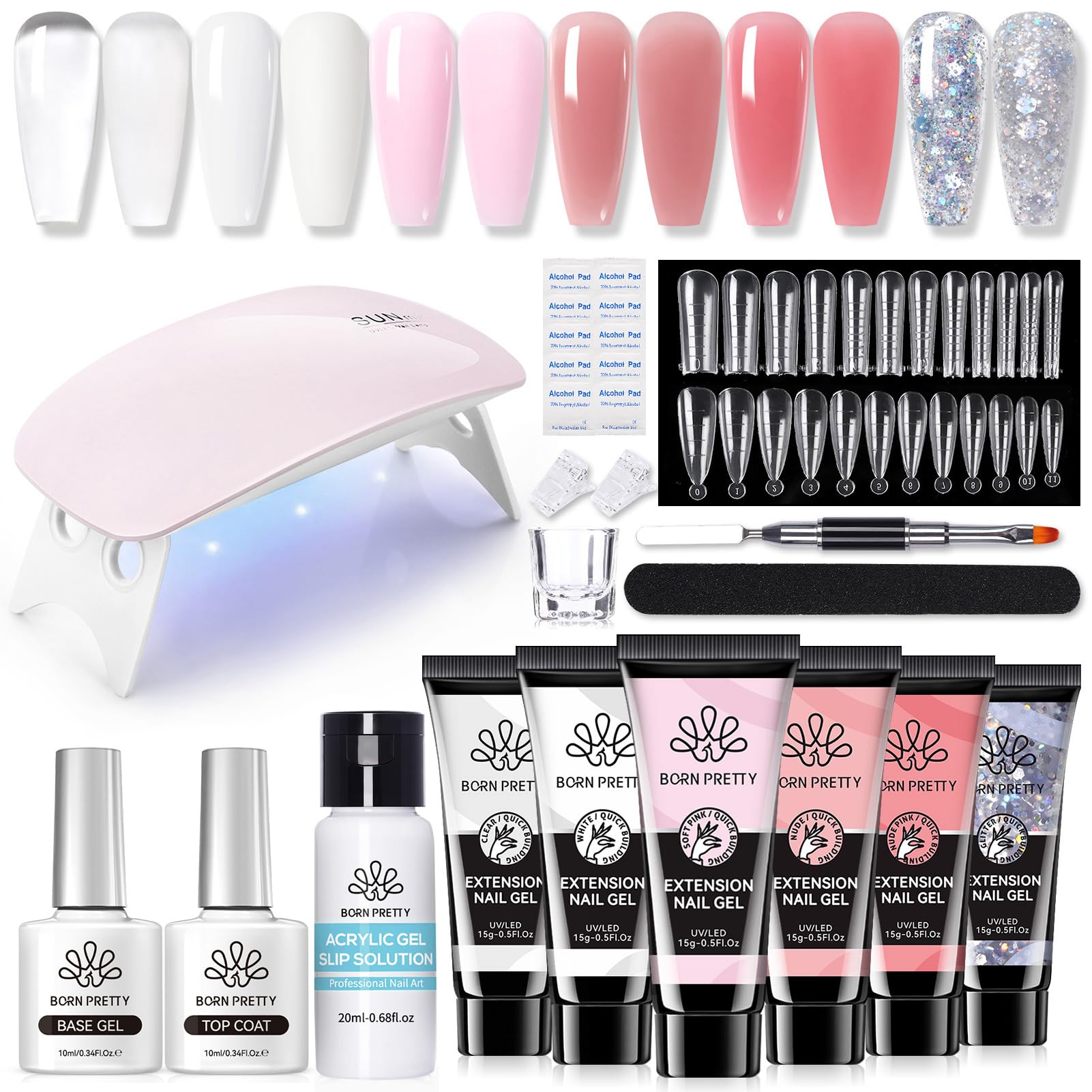 Born Pretty Polygel Starter Set mit UV Lampe, Nagelset Gelnägel Starterset 6 Farben Transparent Weiß Nude Rose Glitzer Polygel Nägel und Slip Solution Base Top Coat Acrylnägel Nagelverlängerung Kit