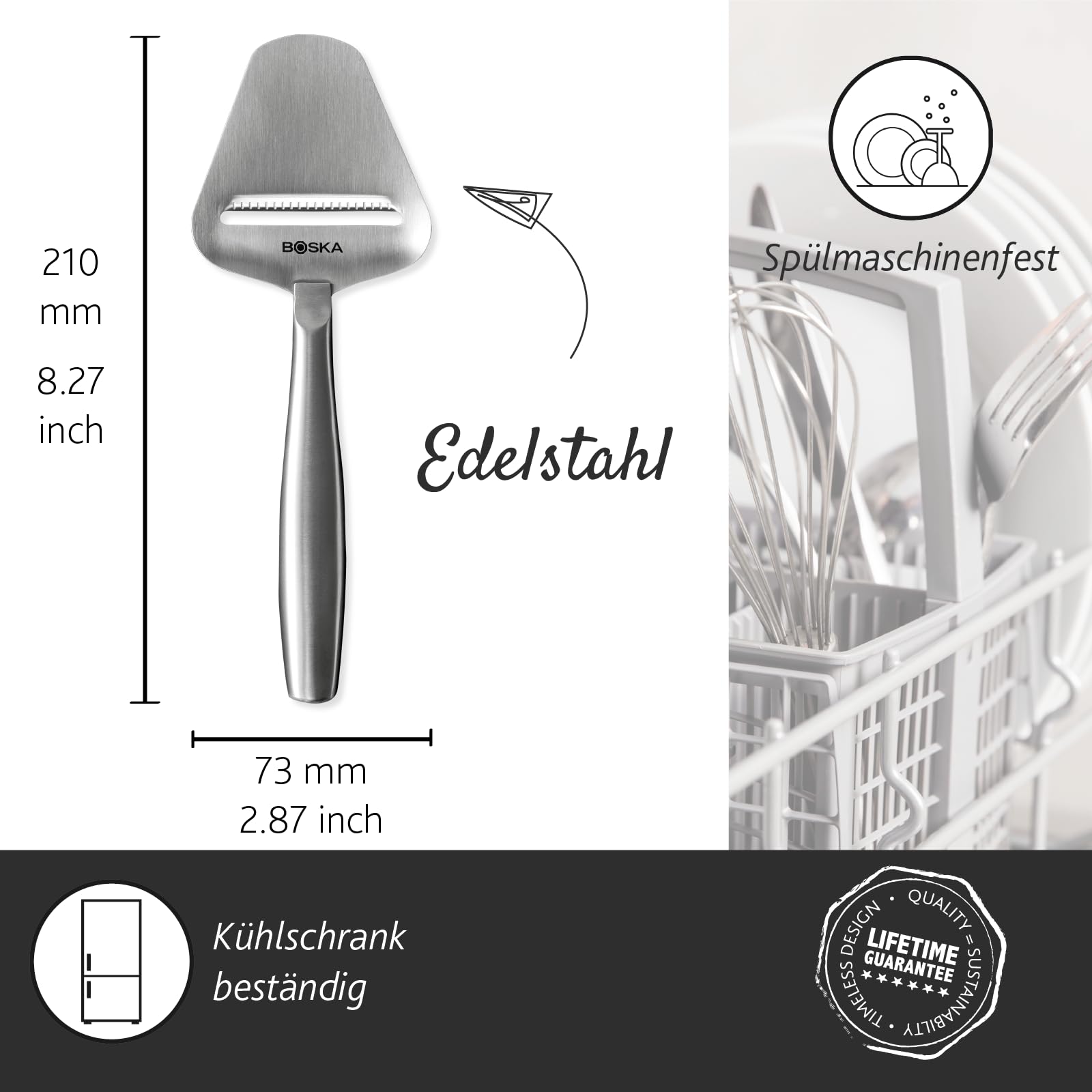 Boska ist ein innovatives, authentisches Familienunternehmen, das bereits seit 1896 ein Herz für Käse hat und deshalb stets auf die Suche nach neuem Cheesewares-Zubehör geht. Wenn Sie sich für unsere Cheesewares entscheiden, entscheiden Sie sich für Produkte, die die strengsten professionellen Normen erfüllen. Qualität und Design werden in unserem Unternehmen ganz gross geschrieben. Dafür wurden wir bereits mit 6 Red Dot Design Awards ausgezeichnet. Darüber hinaus bieten wir Ihnen eine Standardgarantie von 10 Jahren und bei Nichtgefallen eine Geld-zurück-Garantie von 30 Tagen. Bei uns finden Sie das weltweit grösste Sortiment an hochwertigen Käseaccessoires, das in 90 Ländern erhältlich ist. Unser Sortiment ist reichhaltig und unsere Produkte eignen sich als Sammlerstücke und Geschenke. Neben kompletten Plug-and-Play-Konzepten für Läden bieten wir auch die praktischsten Lösungen für jeden Käsefan.