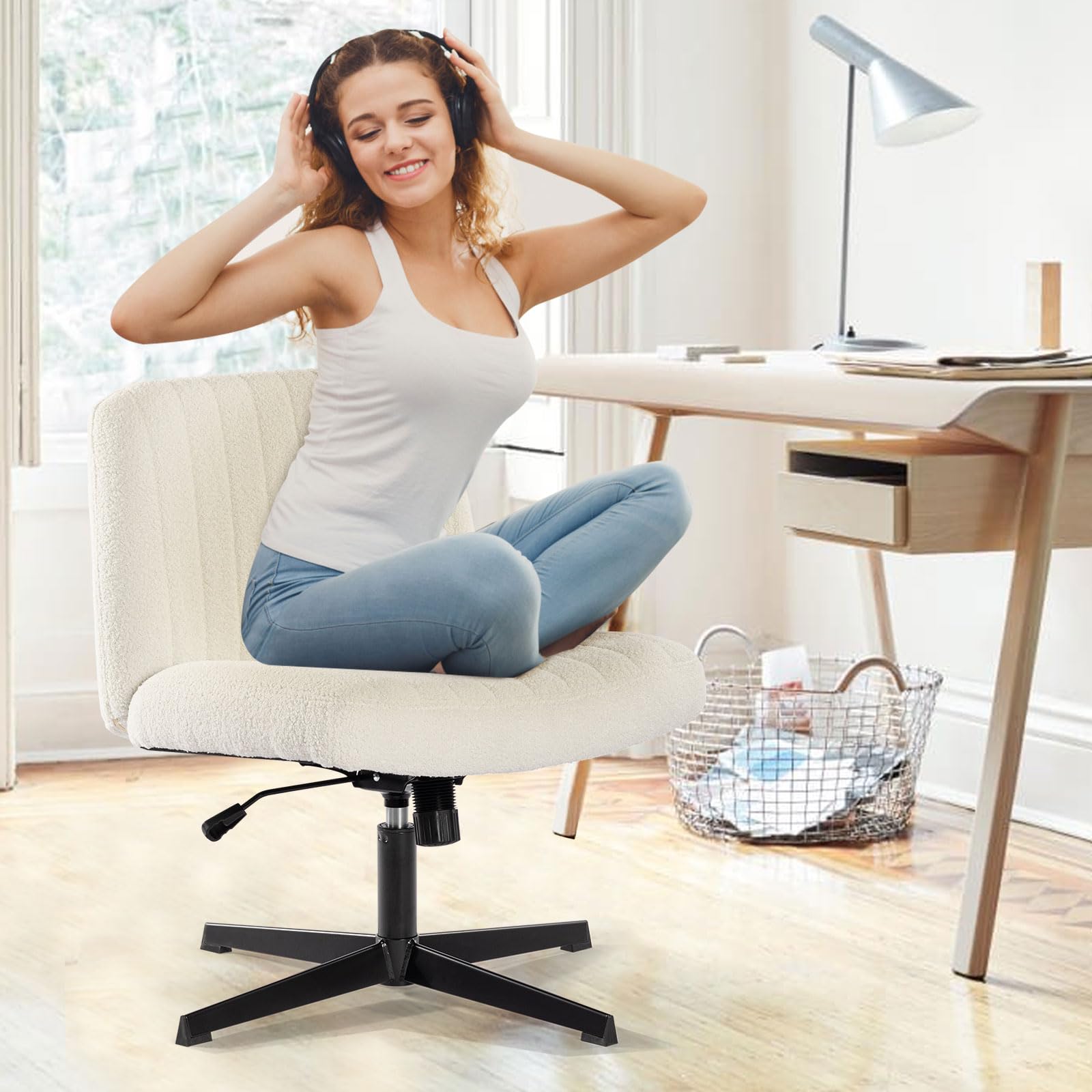 Bosmiller Schneidersitz Stuhl mit Stoffpolsterung,Criss Cross Chair Breiterem Kissen,Höhenverstellbar Schreibtischstuhl 200KG,Bürostuhl Ohne Armlehnen fur Home Office, Material: Keine Rädern, Farbe: Lambs