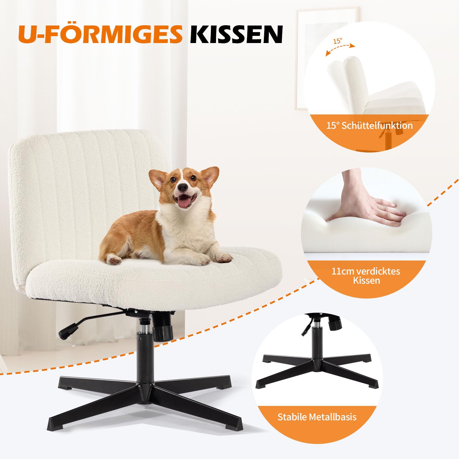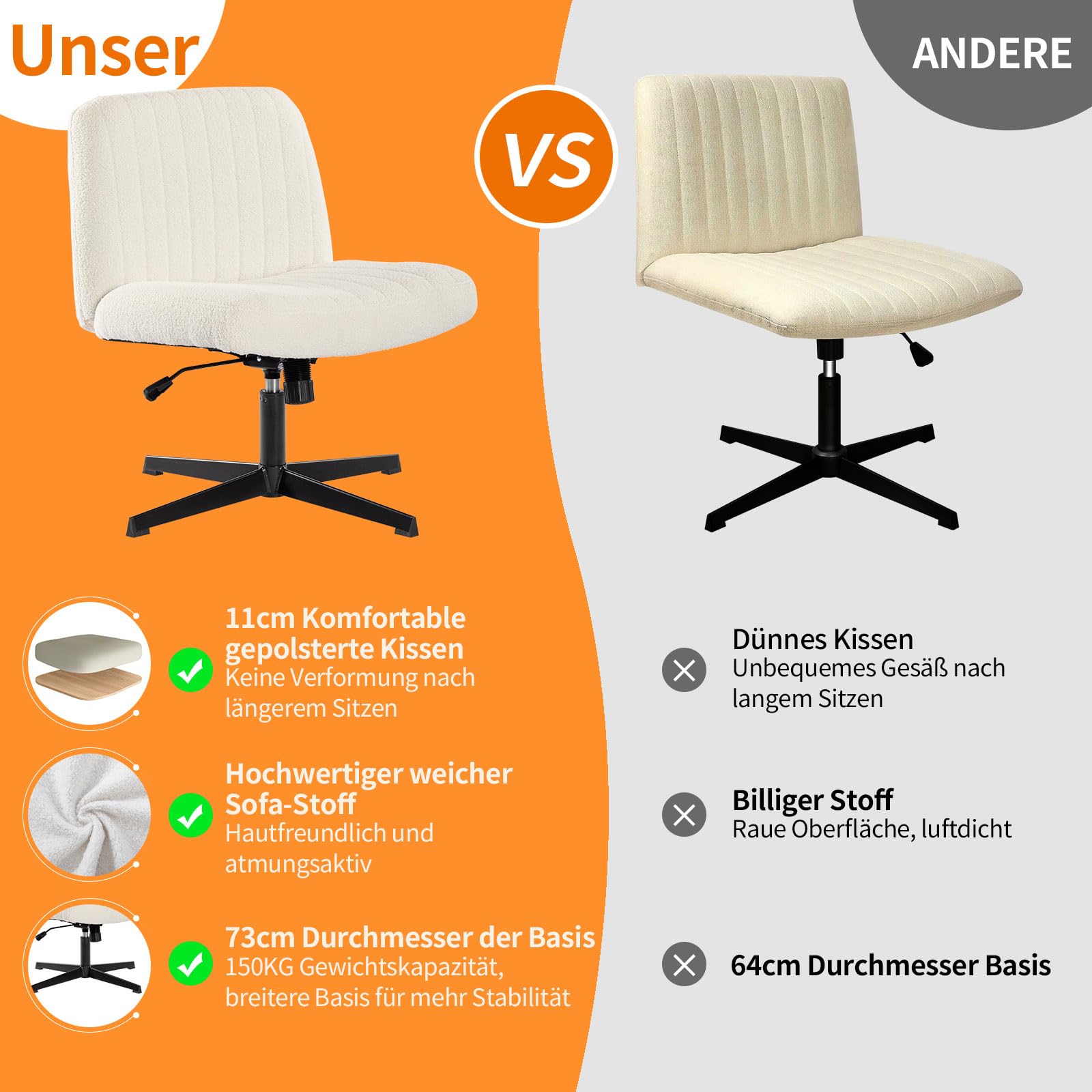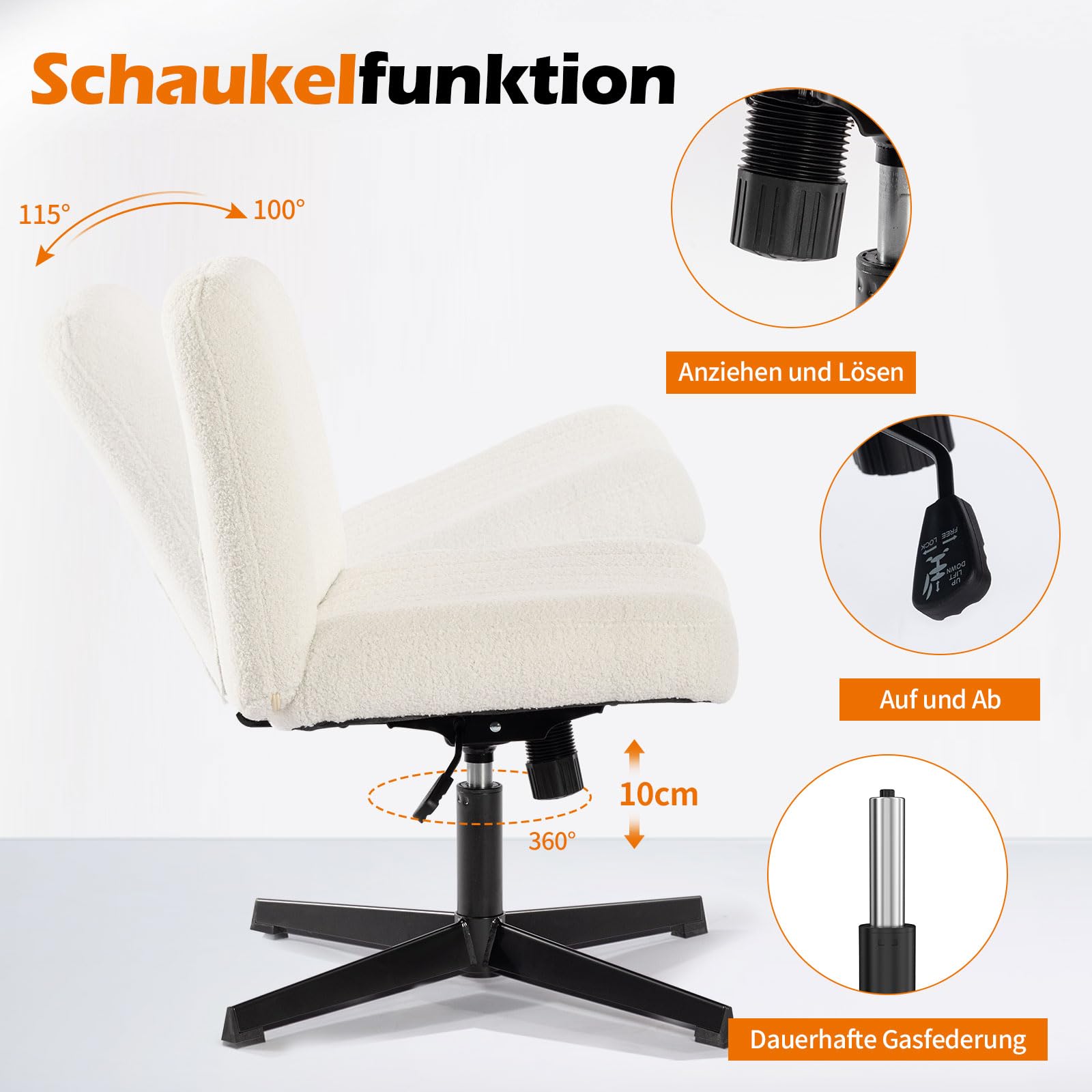 • 【Verstellbare Höhe + 100°-115°-Neigung = Passform als Armloser Schreibtischstuhl】 Brauchst du einen armlosen Stuhl für den Schreibtisch, der auch flexibel passt? Als Armloser Schreibtischstuhl ist unser Cross-Leg-Sessel perfekt: Die Höhe lässt du nach deiner Schreibtischhöhe anpassen – egal ob du gross oder klein bist, du sitzt immer in einer natürlichen Haltung. Zudem kannst du ihn 100°-115° nach hinten neigen, so machst du kurze Pausen zwischendurch, ohne deinen Arbeitsplatz verlassen zu müssen. Er kombiniert Arbeitskomfort mit Flexibilität!