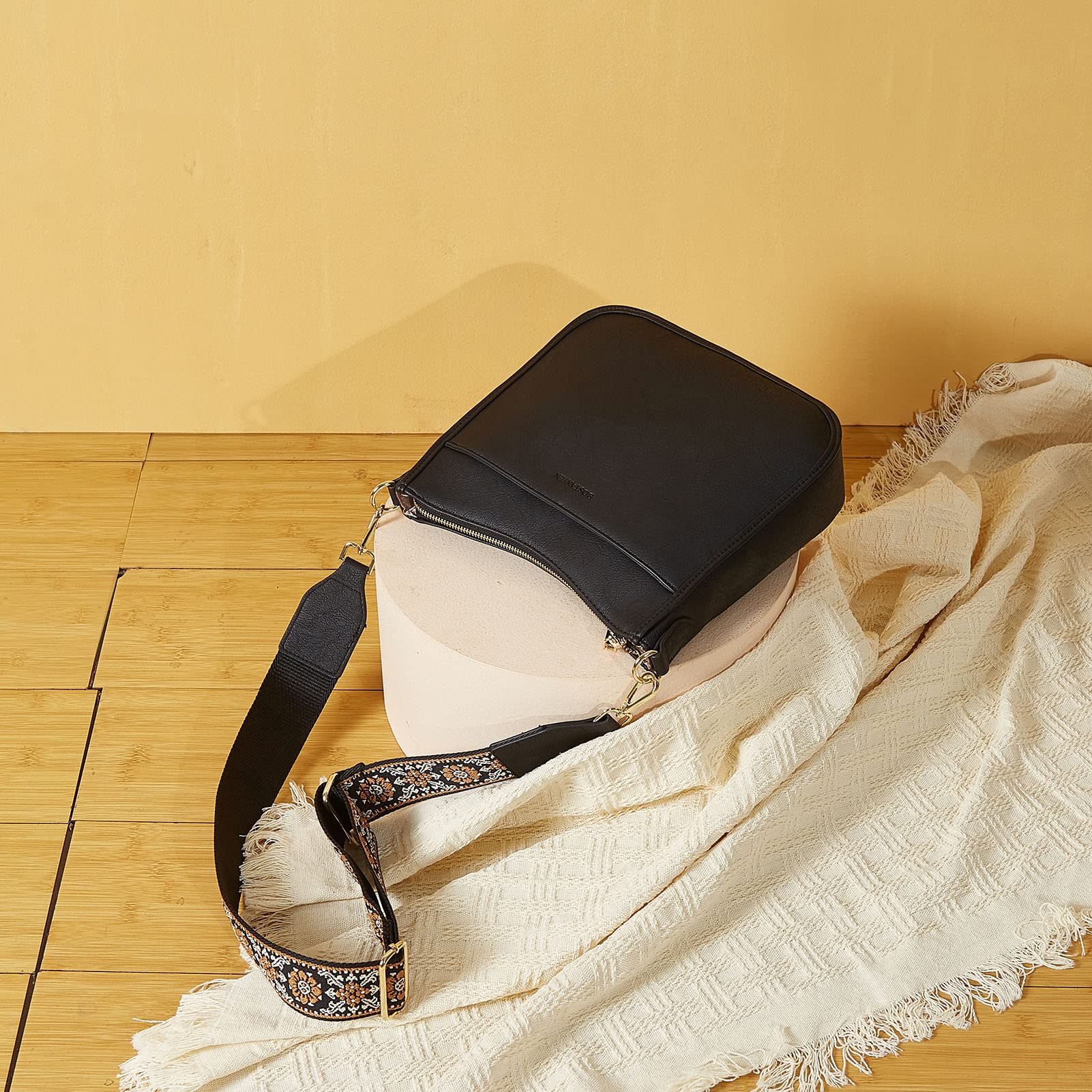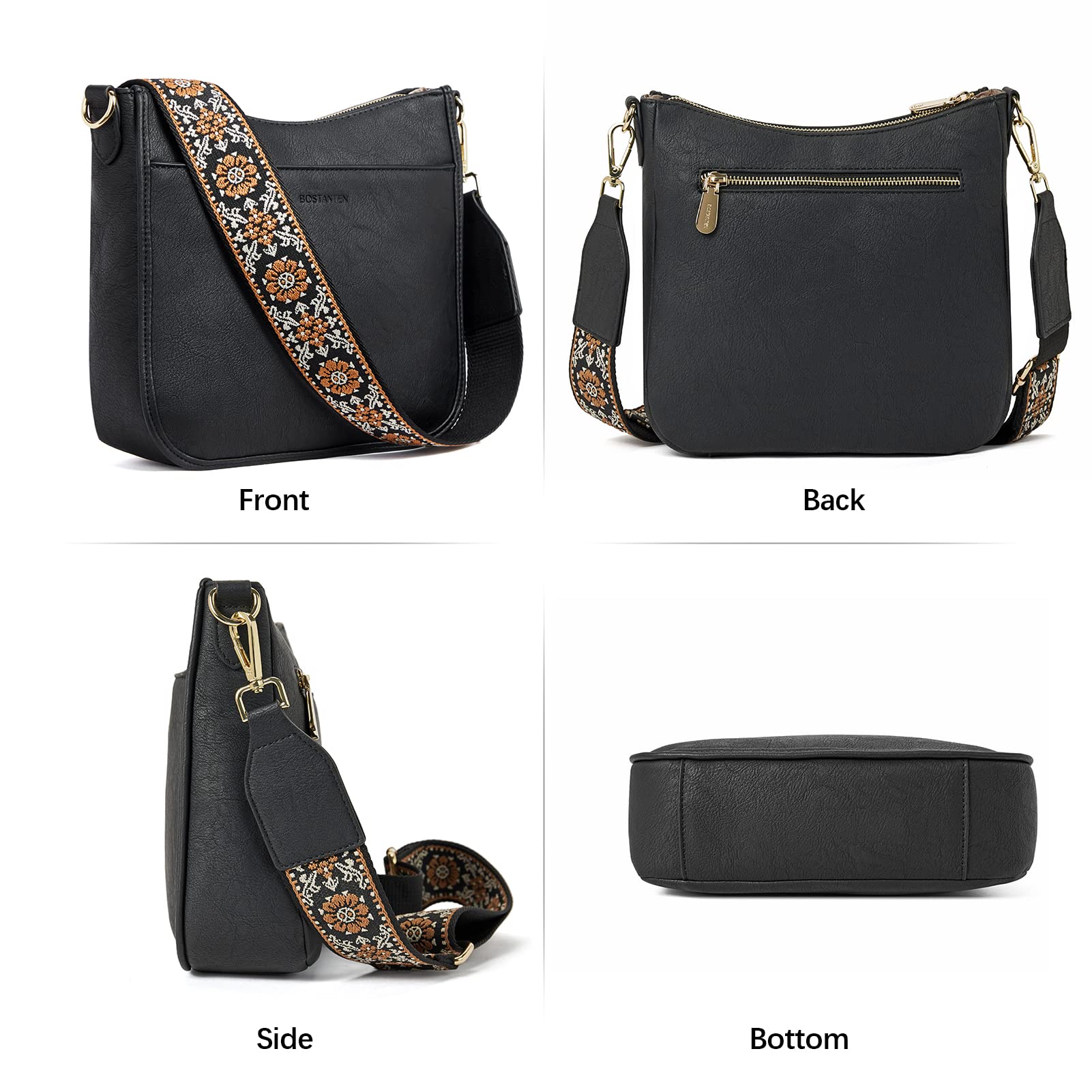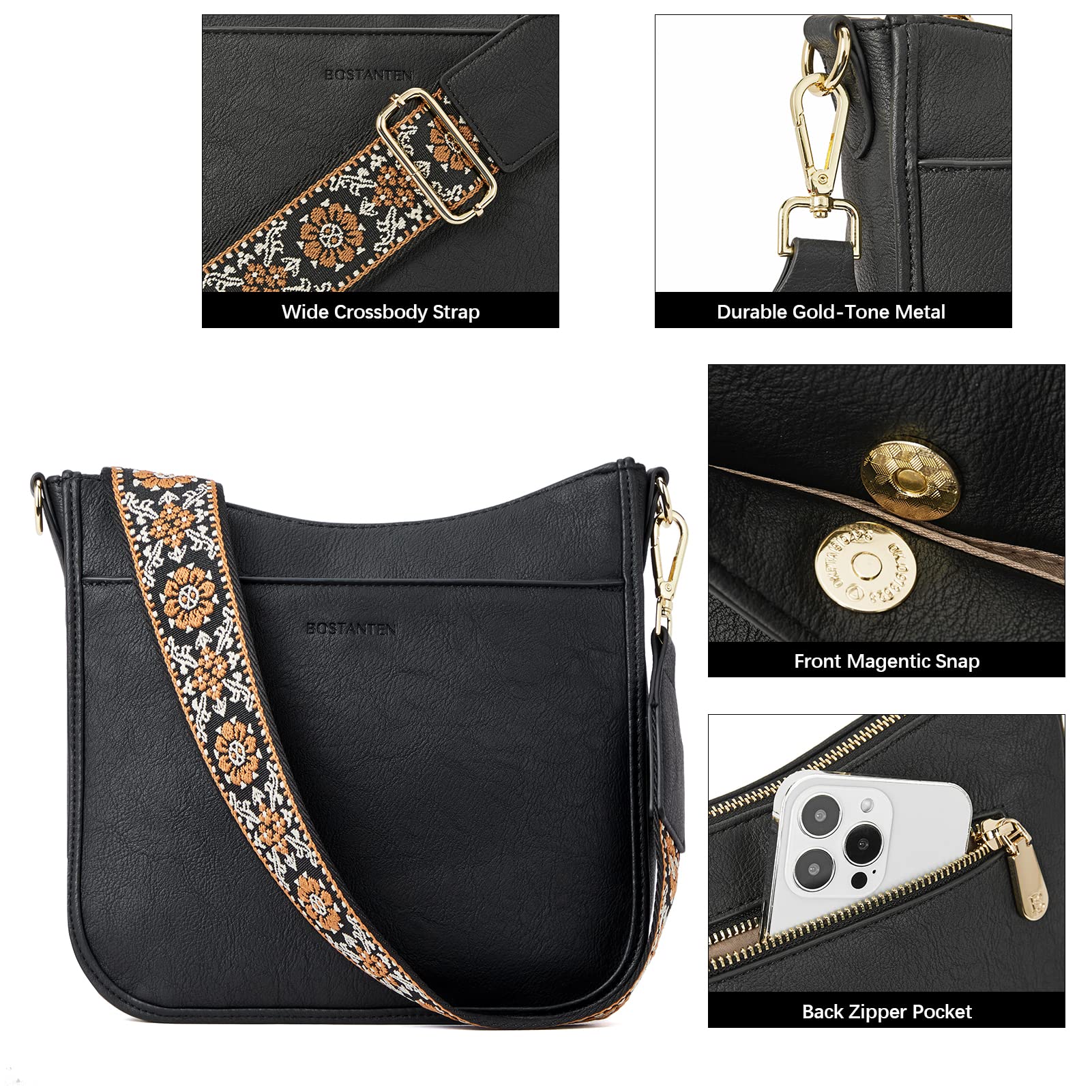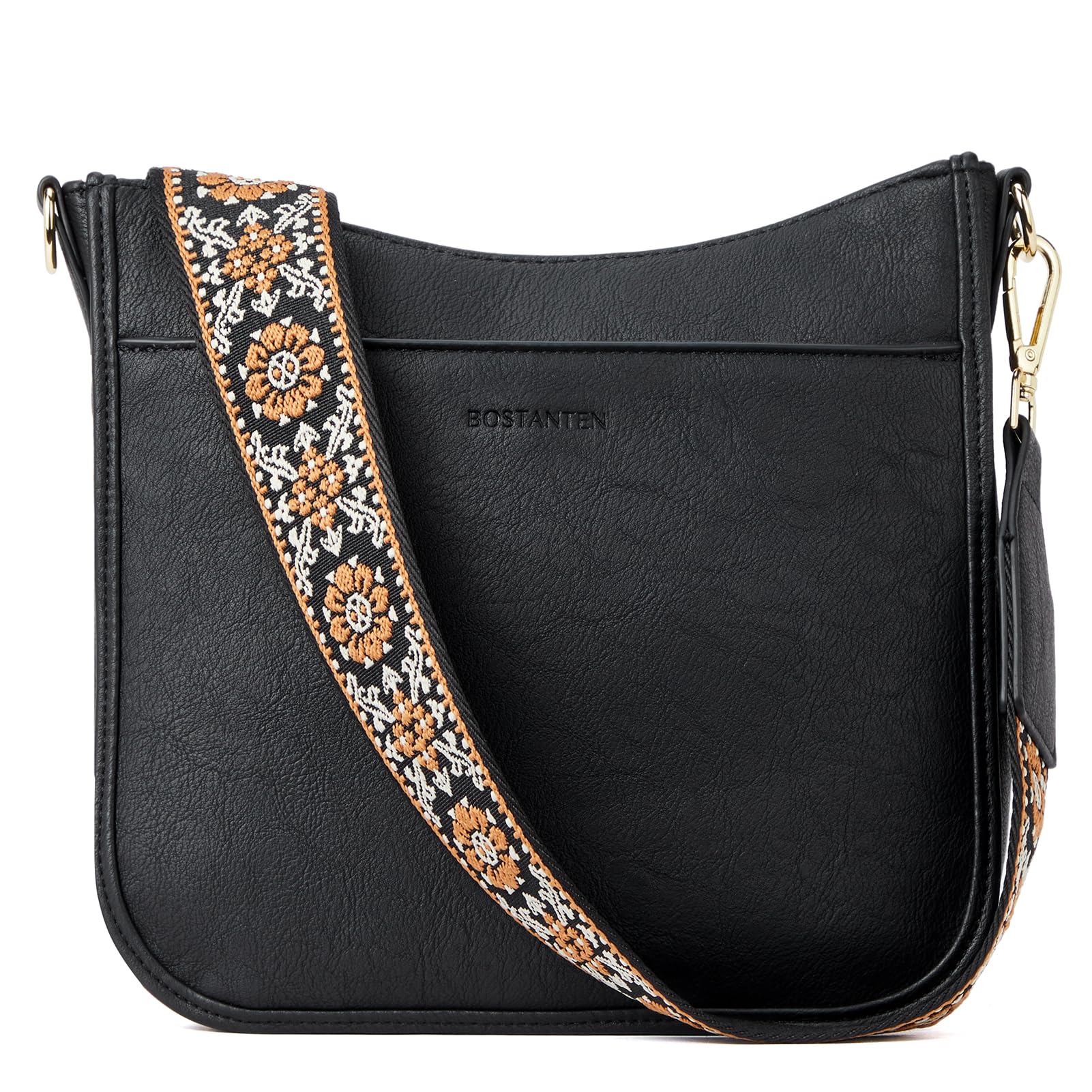 Bostanten Damen-Handtasche, kleine Umhängetasche, PU-Leder, Crossbody-Taschen für Damen, mit verstellbarem, buntem Schultergurt, Schwarz