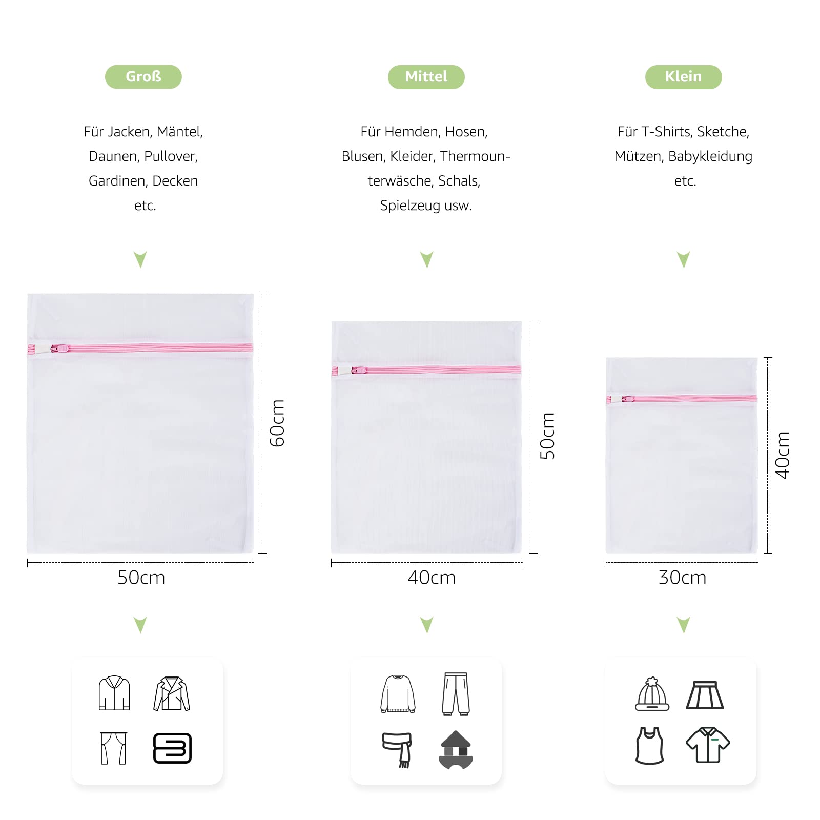 • VIELSEITIG - Diese robusten Wäschenetze in verschiedenen Grössen eignen sich perfekt zum Waschen verschiedener Kleidung, etc. Ideal für empfindliches, Bluse, Strumpfwaren, BH, Unterwäsche, Babykleidung, Schuhen, Koffer, Socken. Die Wäschesäcke mit Reissverschluss können auch als praktische Aufbewahrungsbeutel für unterwegs verwendet werden.