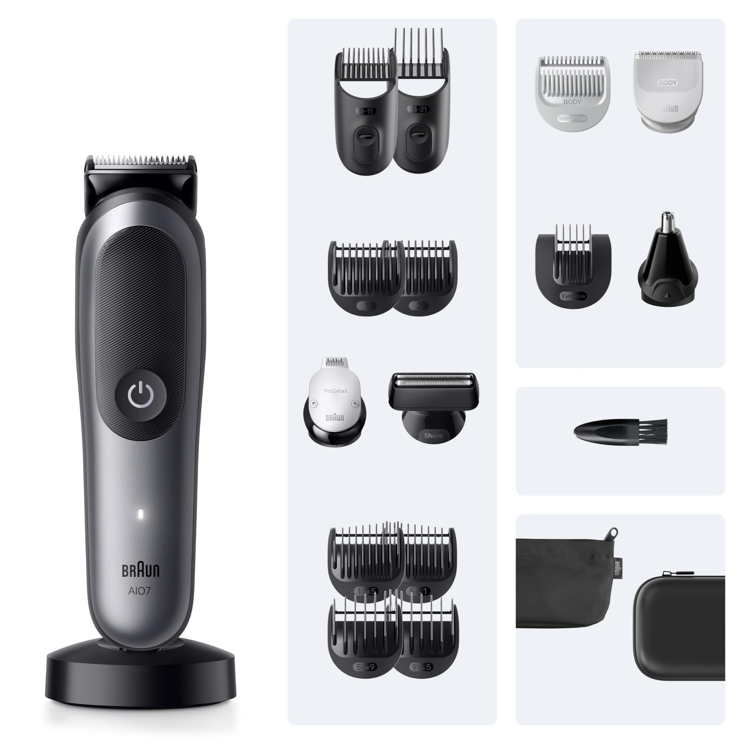 Braun All-in-One Series 7, 18-in-1 Multigroom, Barttrimmer, Nasenhaartrimmer, Haarschneidemaschine für Gesicht, Kopf und Körper, 120 Min Akku, 14 Längen (3–21 mm), Wasserdicht, AIO7585, Grau