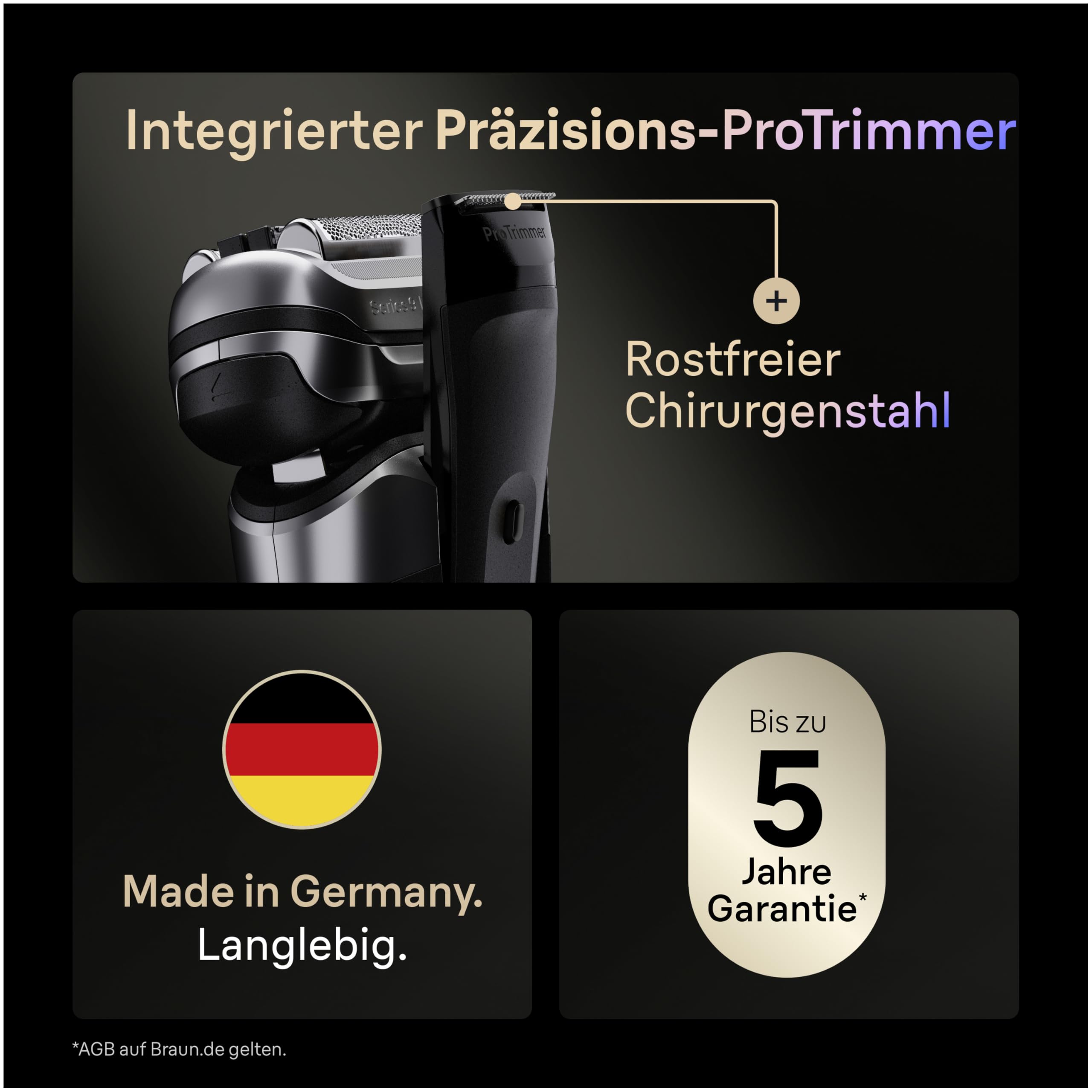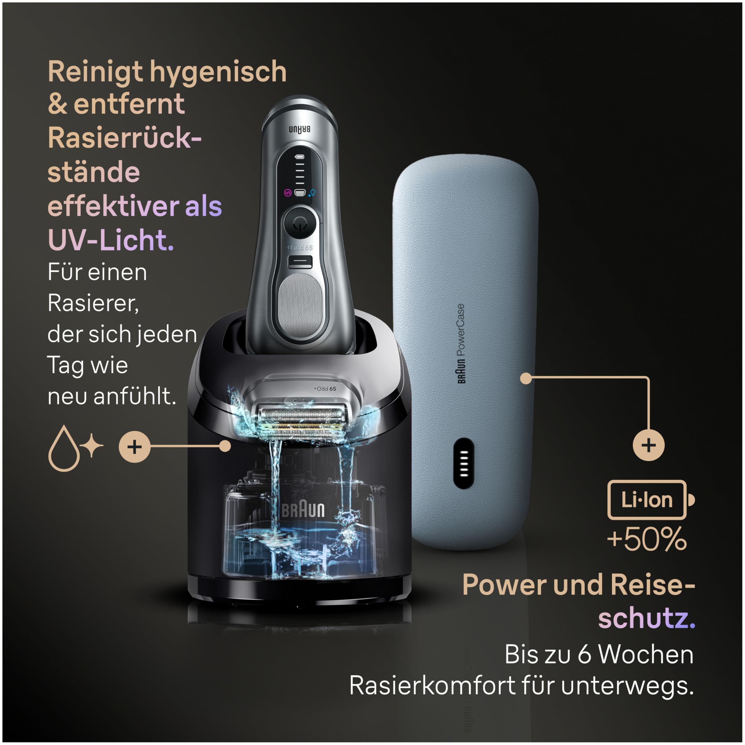 Der Braun Series 9 PRO+ Elektrorasierer für Männer wurde entwickelt, um perfekte Gründlichkeit und Hautschutz zu erzielen. Unsere ultradünnen Präzisionsklingen liefern die ultimative Rasur. Die 5+1 Scherkopf-Technologie synchronisiert perfekt die Direct&Cut Klinge, den ProTrimmer, die hautschonende OptiFoil, den schützenden SkinGuard und die titanbeschichtete ProLift-Klinge. Die Pro-SensoAdapt Technologie analysiert die Bartdichte 300x pro Sekunde und passt die Rasierleistung automatisch an. Inklusive 6-in-1 SmartCare Center, optimiert durch AutoSelect Programm, Reinigen, Schutz der Klingenlebensdauer, Trocknen, Aufladen und Erhaltung der Rasierleistung. Der Series 9 PRO+ Elektrorasierer für Männer ist zu 100% wasserdicht. Hergestellt in Deutschland;Lieferumfang: 1x Braun Series 9 PRO+ Rasierer, 1x Reiseetui, 1x Ladegerät, 1x Reinigungsbürste, 1x Ladeetui, 1x 6-in-1 SmartCare Center, 1x Reinigungskartusche.