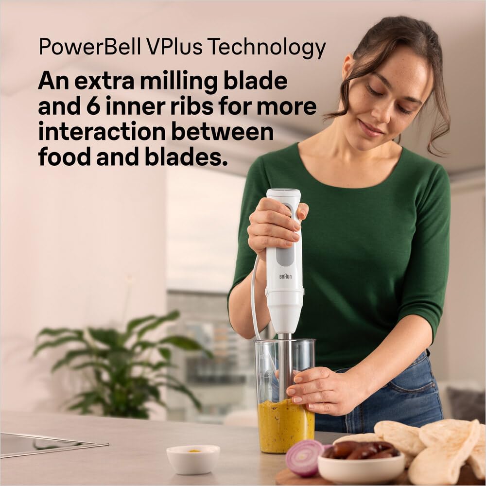 Bis zu 4x feinere Ergebnisse* mit einer Daumenbewegung. Lassen Sie Ihrer Kreativität in der Küche freien Lauf mit dem MultiQuick 5 und einem einfachen Wechsel des praktischen Zubehörs dank des patentierten EasyClick Systems Plus. Die PowerBell VPlus Technologie sorgt ausserdem für bis zu 4-mal feinere Ergebnisse*. Eine zusätzliche Mahlklinge und 6 Innenrippen sorgen für eine bessere Interaktion zwischen den Lebensmitteln und den Klingen. Der MultiQuick 5 bietet Ihnen 21 leicht einstellbare Geschwindigkeitsstufen mit einem einhändig bedienbaren Geschwindigkeitsregler und einen 1000-Watt-Motor für schnelles und effizientes Mixen. * Im Vergleich zu Braun MQ10.000P bei Mandelmilch.