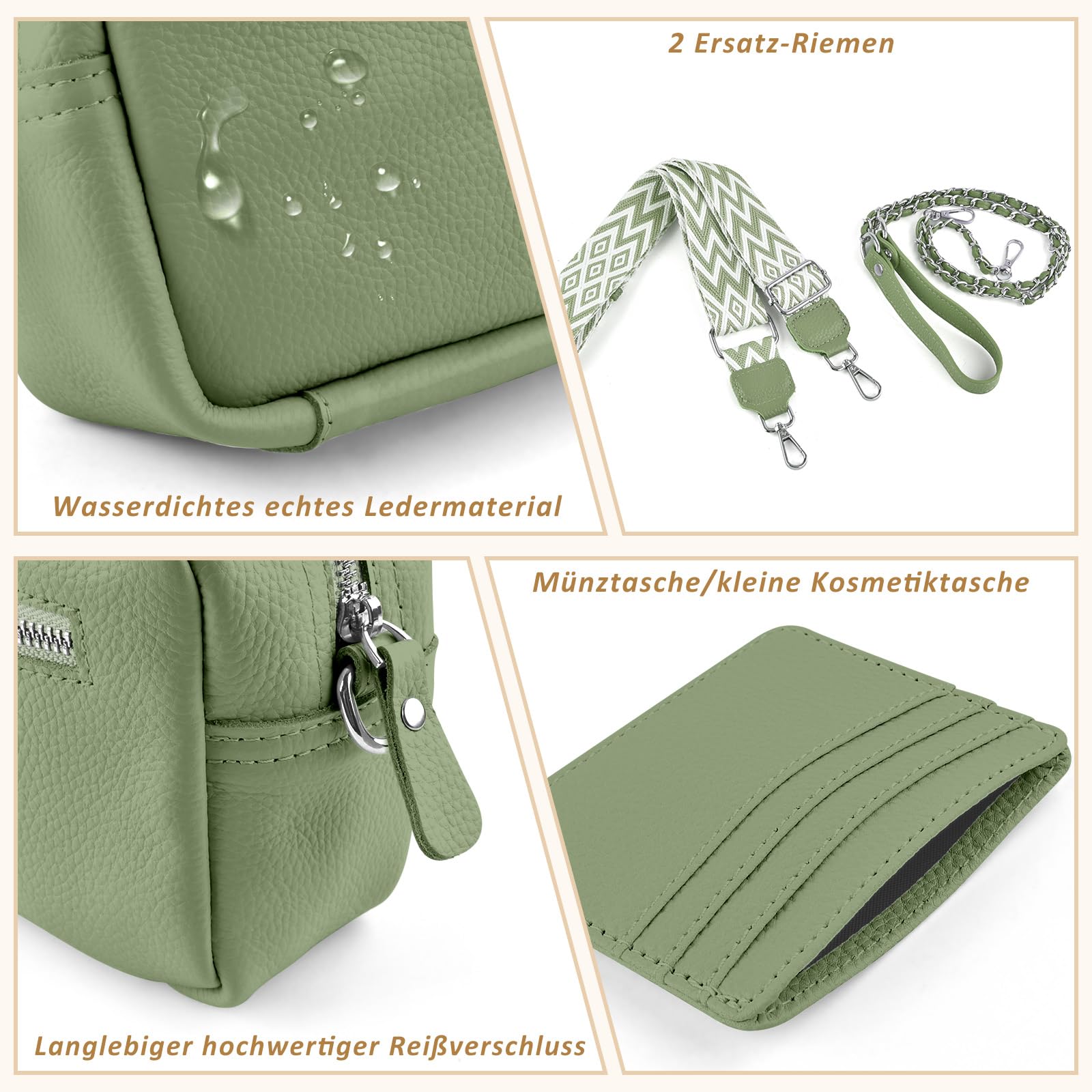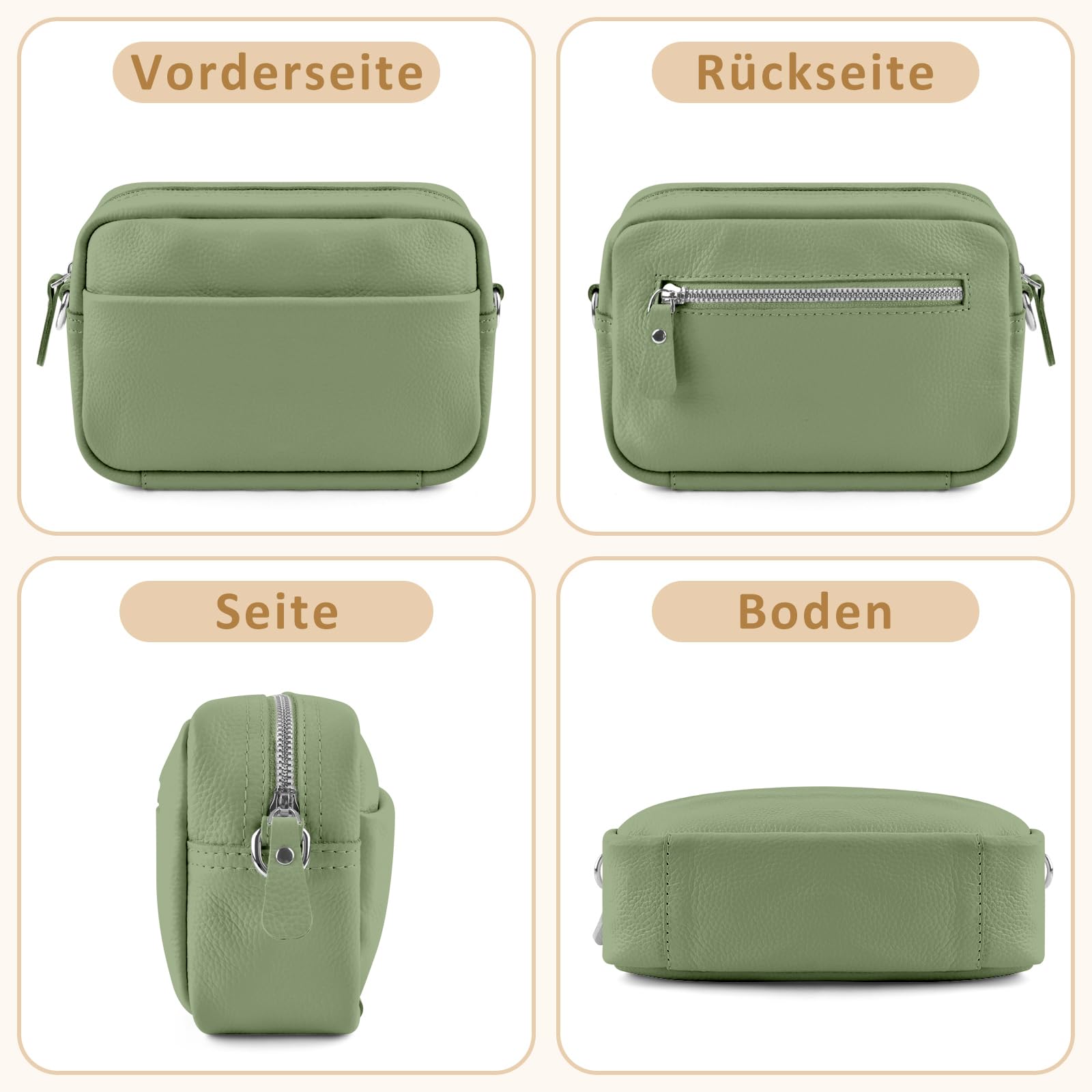 3 Fächer mit Reißverschluss, offenes Frontfach und extra Kartenhalter