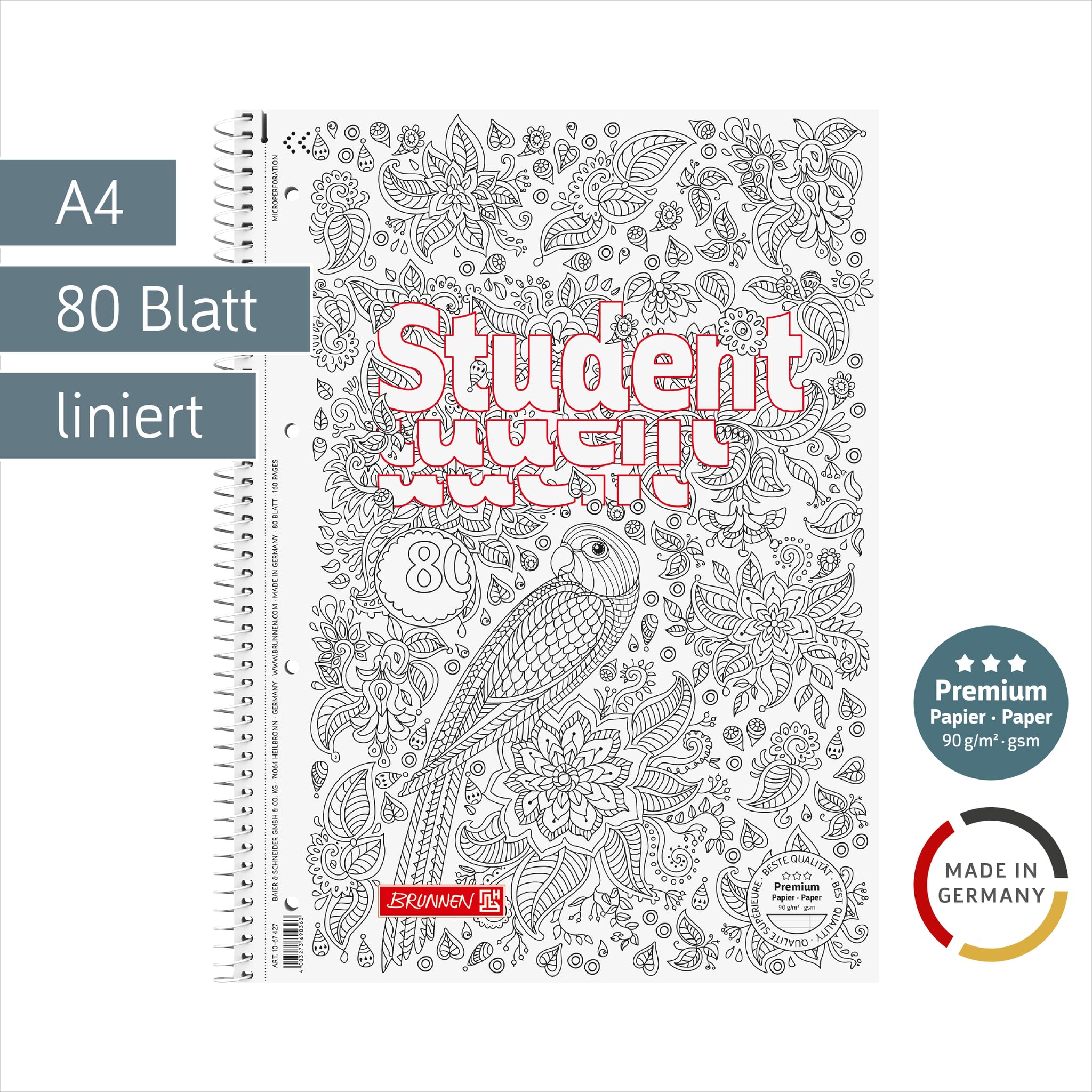 BRUNNEN Collegeblock Premium Student „Papagei“ ZENart | A4, Lineatur 27, 80 Blatt, weiss