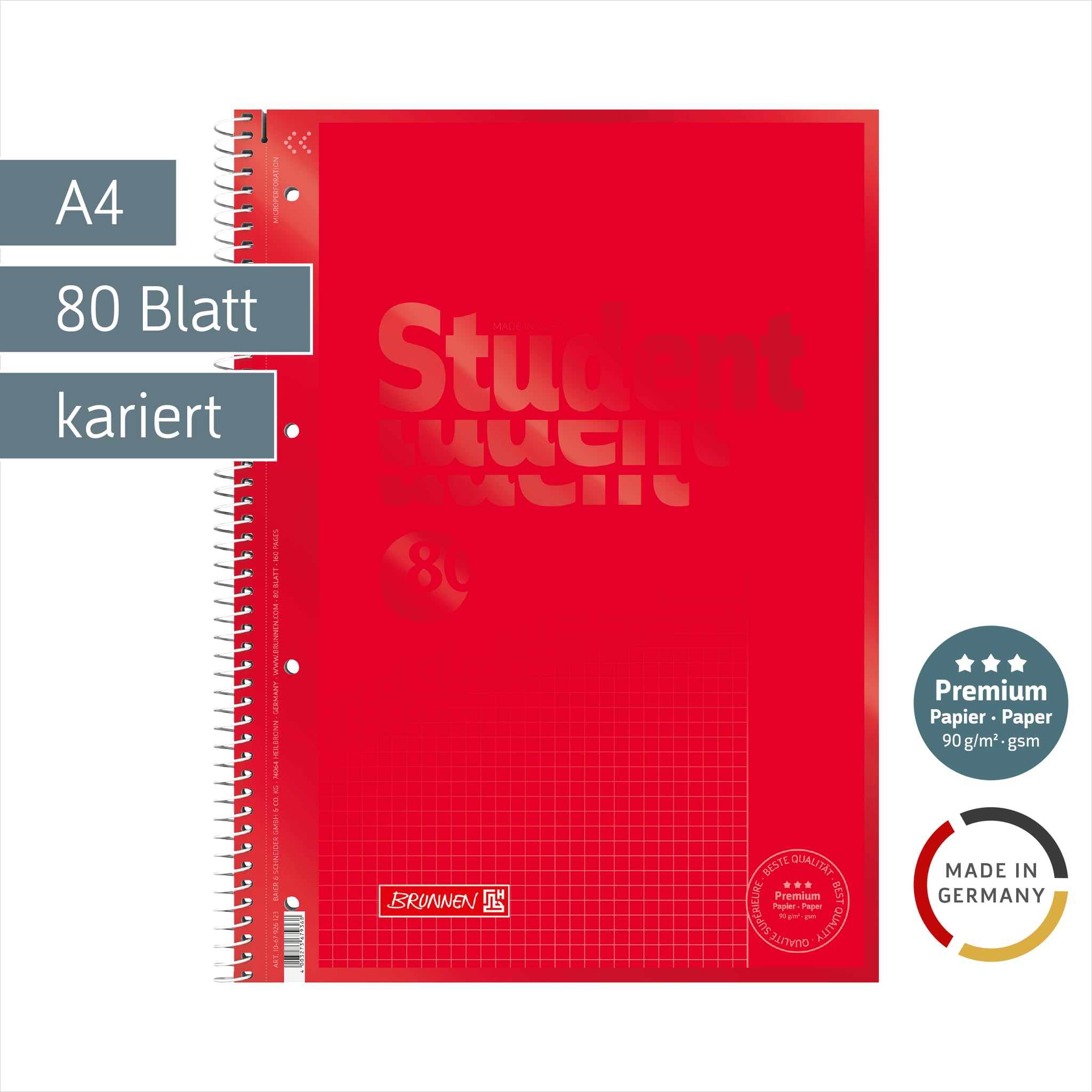 BRUNNEN Collegeblock Premium Student Colour Code | A4, Lineatur 26, 80 Blatt, red