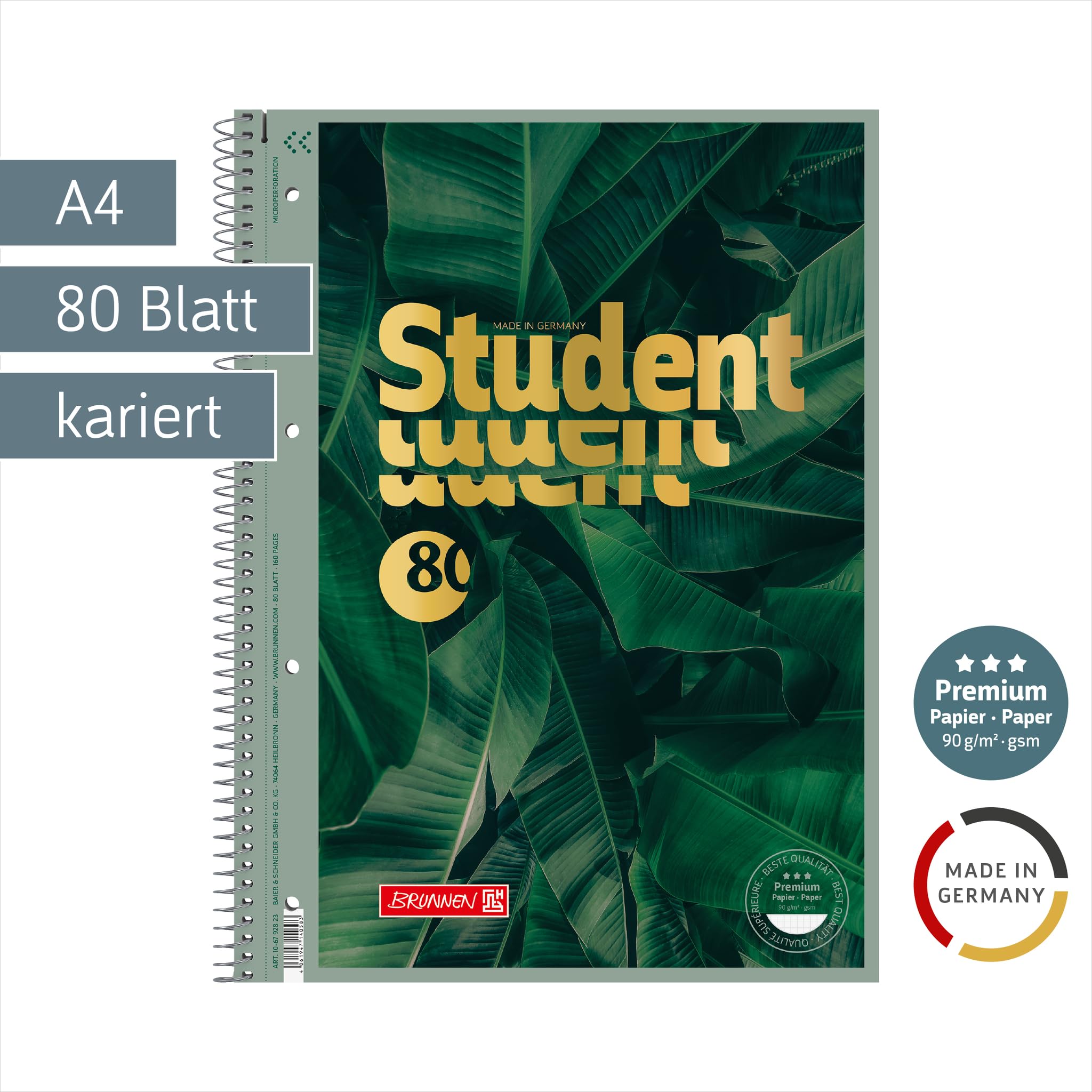 Format: A4 • 5 mm kariert mit Randlinie innen und aussen, Lin. 28 • 80 Blatt, 160 Seiten • 90 g/m², Premiumpapier, hochweiss, satiniert, tintenfest, Spiralbindung, 4-fach Lochung, Ausreisshilfe, Microperforation • Farbe: dunkelgrün • mit Goldprägung • Made in Germany