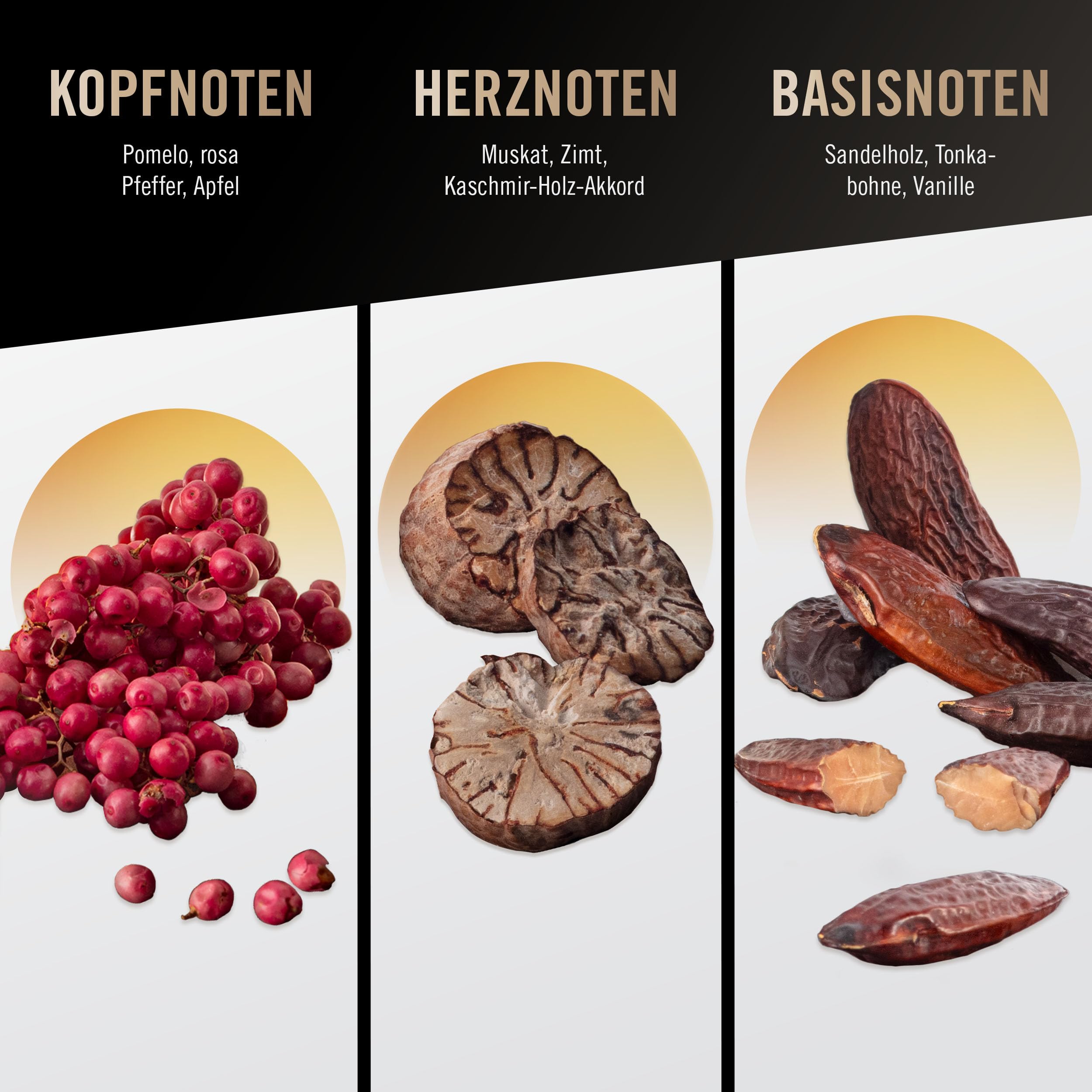 • Das Herren Parfüm eröffnet mit einer frischen Duftnote aus Apfel, Pampelmuse & rosa Pfefferkörnern, während im Herzen würzige Muskatnuss, Zimt & Kaschmir-Akkord dem Geruchssinn schmeicheln