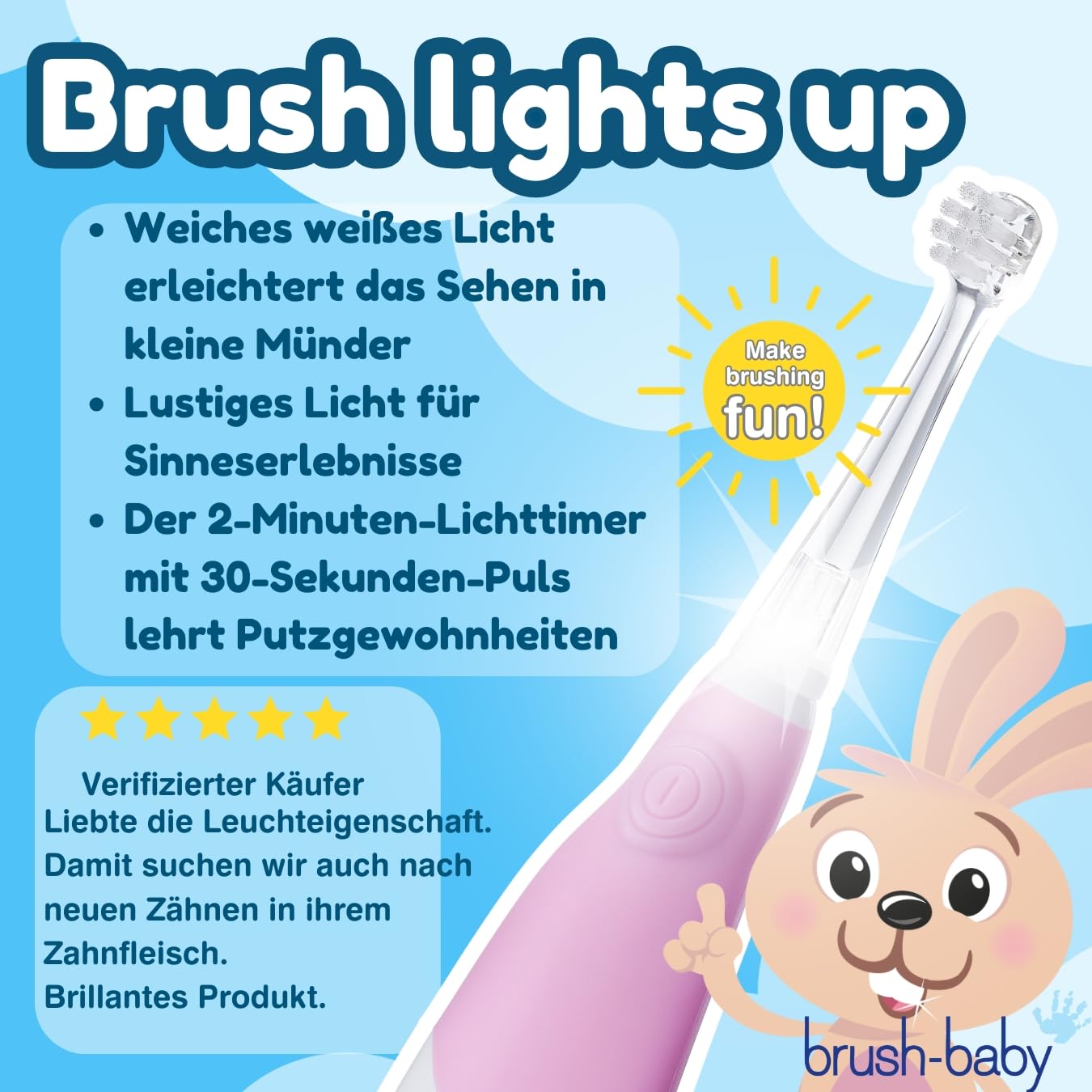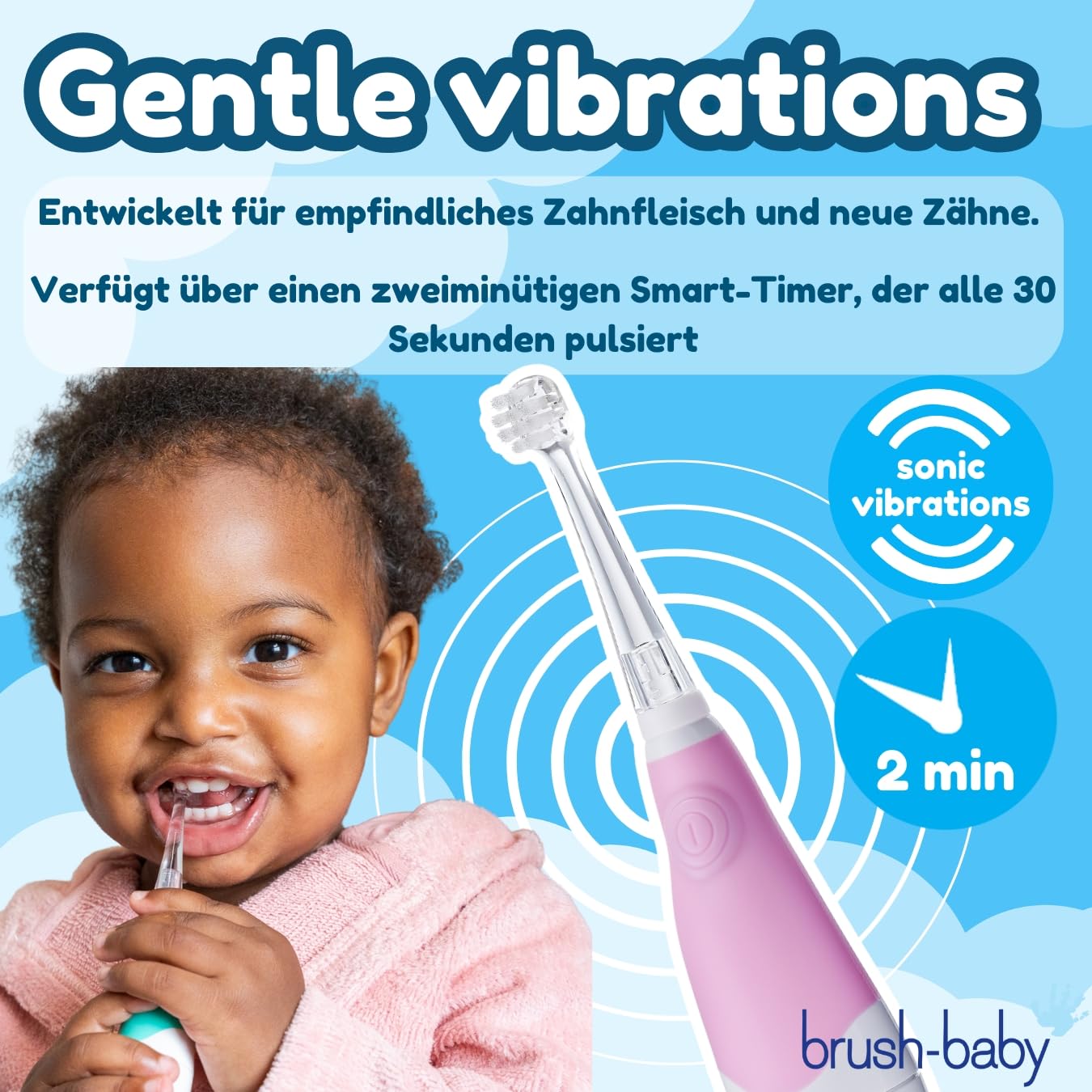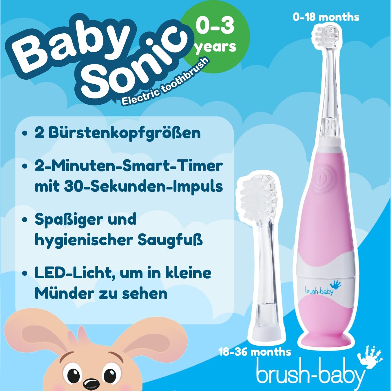 Die Brush-Baby BabySonic Elektrische Zahnbürste in Rosa wurde speziell für Kinder von Geburt bis 3 Jahre entwickelt. Die extra-weichen, vibrierenden Borsten reinigen sanft Milchzähne und beruhigen empfindliches Zahnfleisch beim Zahnen.Ein integrierter 2-Minuten-Smart-Timer mit 30-Sekunden-Impulsen sorgt für die richtige Putzdauer und macht das tägliche Putzen spielerisch. Das eingebaute LED-Licht erleichtert das gründliche Reinigen, da die Zähne deutlich sichtbar sind.Das Set enthält zwei Ersatz-Bürstenköpfe: einen Baby-Kopf (0–18 Monate) mit kleiner Bürstengrösse für Neugeborene sowie einen Kleinkind-Kopf (18–36 Monate), passend für wachsende Münder und Zähne.Die Zahnbürste hat ausserdem einen hygienischen Saugnapf-Sockel, der sie aufrecht hält und vor Kontakt mit Schmutz schützt. Hergestellt aus BPA-freien Materialien, unterstützt sie eine sichere und effektive Zahnpflege vom ersten Zahn an.Sicherheitshinweis: Kind beim Zähneputzen immer beaufsichtigen. Vor dem ersten Gebrauch die Isolierlasche entfernen. Bürstenköpfe alle 3 Monate oder früher austauschen (bei Abnutzung).Lieferumfang: 1 BabySonic Elektrische Zahnbürste Rosa, 1 Baby-Bürstenkopf (0–18 Monate), 1 Kleinkind-Bürstenkopf (18–36 Monate), 1 AAA-Batterie.