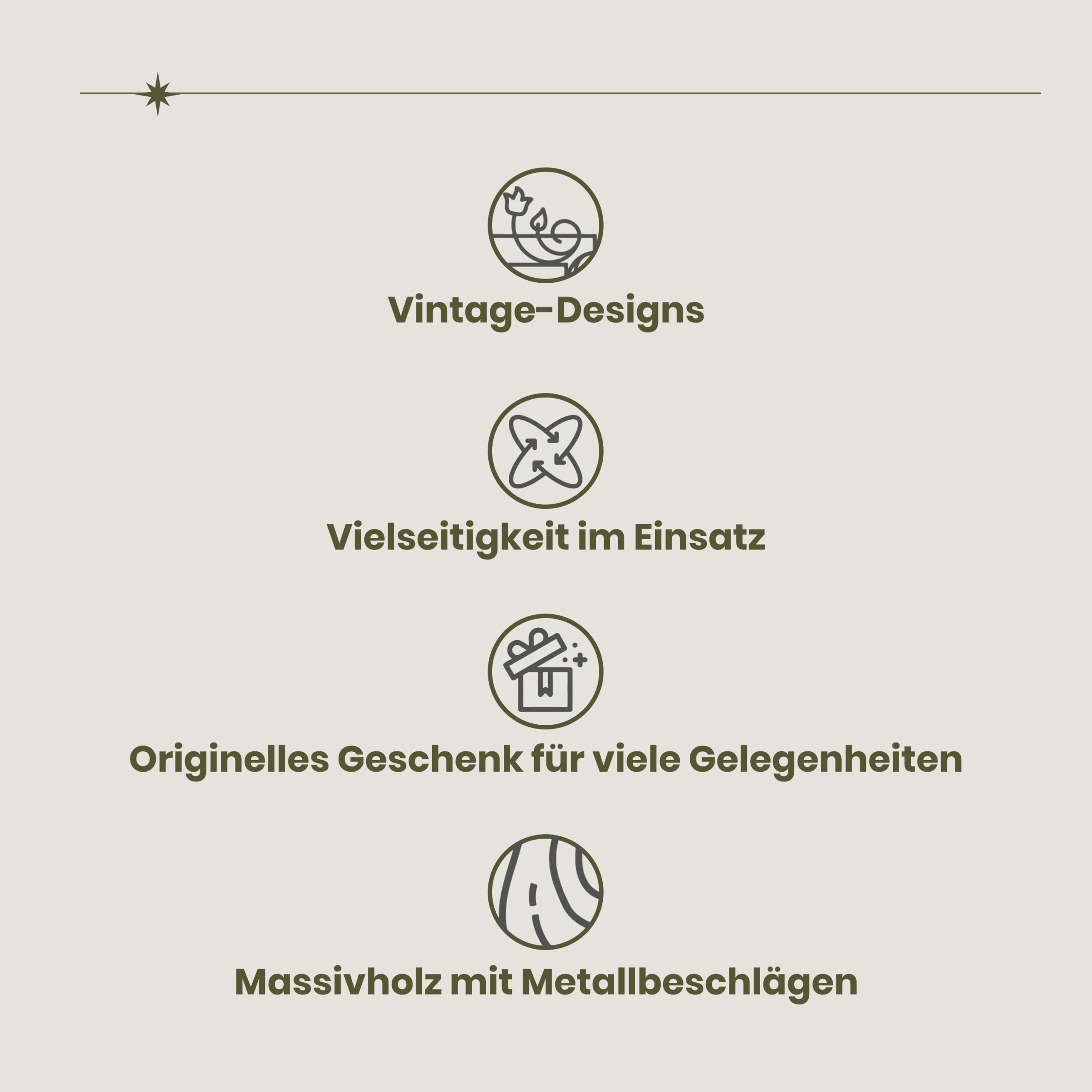 Für jeden Anlass eine gute Wahl - die BRYNNBERG-Schatztruhe im antiken Design Als optischer Hingucker in den eigenen vier Wänden oder als ausgefallenes Geschenk für Gross und Klein; die Holztruhe überzeugt mit schönen Verzierungen und Ornamenten wie Metallbeschlägen und Ledergurten. Egal ob als Schmuckkassette oder Zeitschriftendepot, die BRYNNBERG Schatztruhe bietet immer eine schöne Gelegenheit, sämtliche Habseligkeiten schnell und sicher zu verstauen. Auch als Geldkassette oder ausgefallene Spardose ist die Holztruhe gut geeignet. Diese vielseitige Box zaubert jedem Nutzer ein Lächeln ins Gesicht und ist ein schönes Accessoire für schlichte Wohnzimmer oder ein tolles Spielgerät für das Kinderzimmer. Da das Eigengewicht gering ist, können auch Kinder die Truhe gut tragen. Ob Schnitzeljagd oder Mottoparty - den kreativen Ideen zur Nutzung und Umsetzung sind hierbei keine Grenzen gesetzt. Damit auch für jeden Anlass die richtige Truhe dabei ist, sind die BRYNNBERG -Truhen in verschiedenen Designs und Grössen erhältlich. Ausserdem ist die Schatztruhe dank der Schwenk-Schliessung immer leicht zu handhaben. Die Vorteile der BRYNNBERG-Schatztruhe im Überblick: ? vielseitig verwendbar ? ansprechendes, antikes Design ? ideal als Geschenk ? in Handarbeit gefertigt ? verschiedene Varianten erhältlich