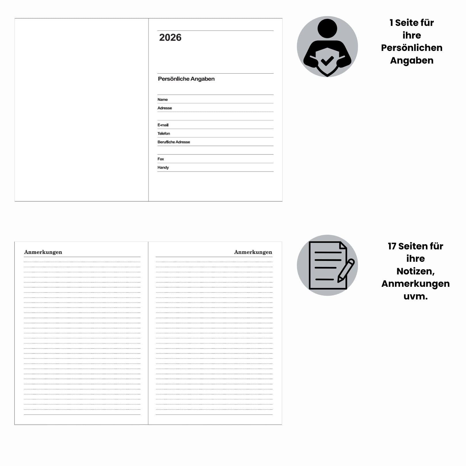 Im hinteren Bereich finden Sie 17 liniert beschriftbare Seiten für wichtige Notizen, Checklisten oder spontane Einfälle. Die verstärkten Deckblätter vorne und hinten bieten zusätzlichen Schutz und Gestaltungsfläche.Individuelle Farbwahl