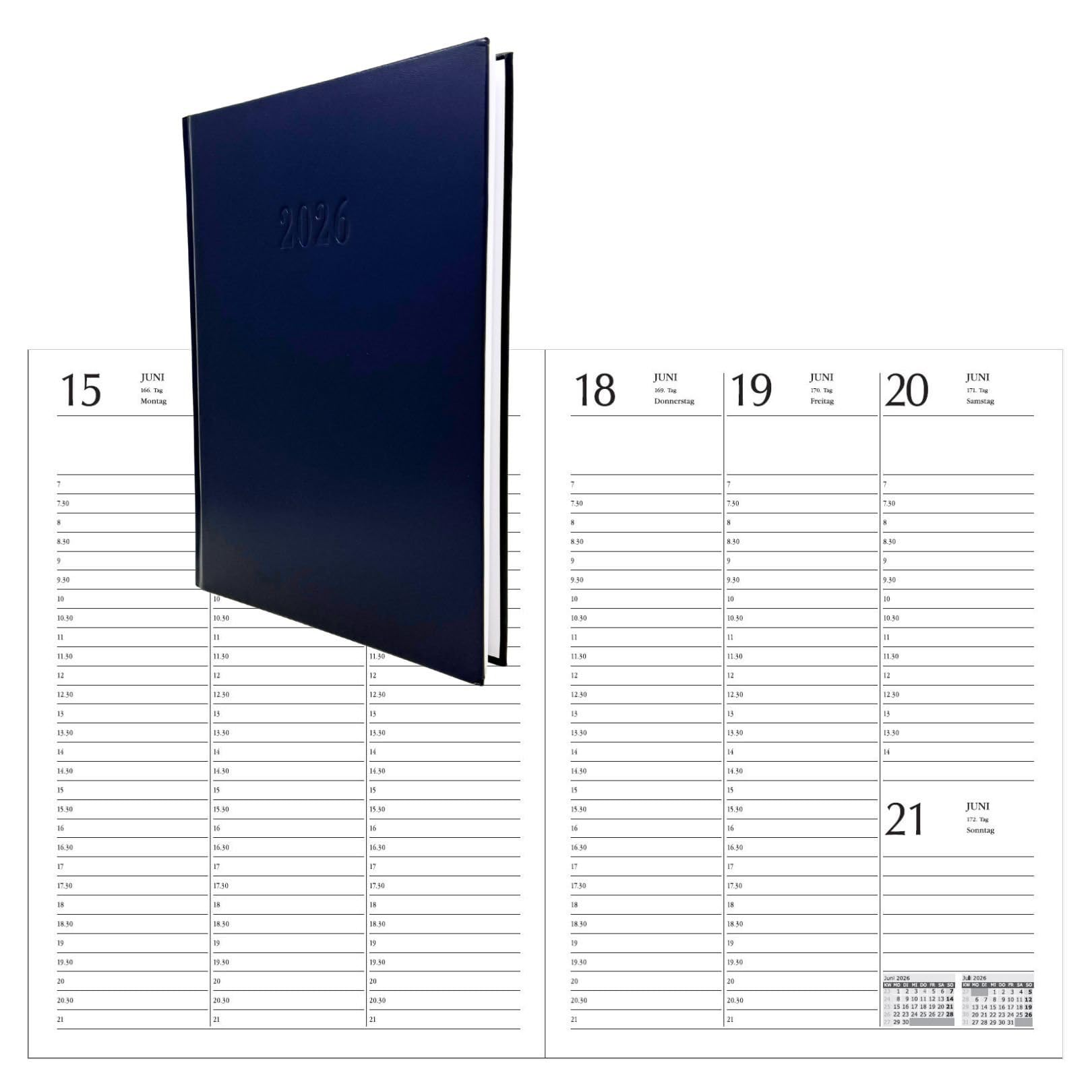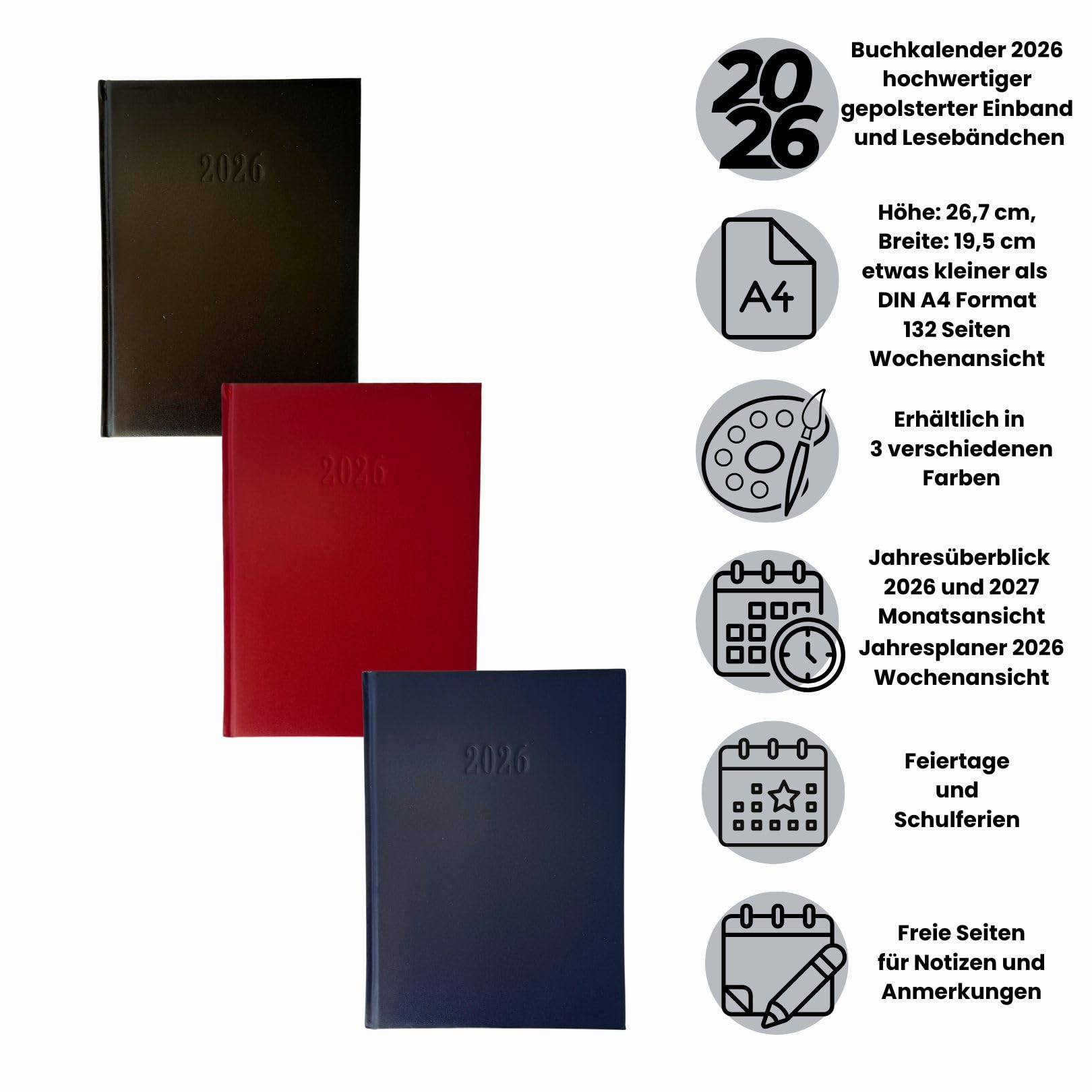 Wählen Sie Ihren Favoriten: klassisches Schwarz, tiefes Blau oder lebendiges Rot – passend zu Ihrem Stil und Workspace.Mit diesem Buchkalender XL 2026 Wochenplaner sind Sie bestens gerüstet, um Ihre private und berufliche Zeit optimal zu managen. Starten Sie organisiert und fokussiert in das neue Jahr!Seitenaufteilung des Kalenders:Seite 1+2: weisses verstärktes Deckblatt zur freien VerfügungSeite 3: Persönliche AngabenSeite 4: FeiertagsübersichtSeite 5: Kalender 2026 mit MonatsansichtSeite 6: Kalender 2027 mit MonatsansichtSeite 7: Schulferien 2026Seite 8-113: Wochenkalendarium, Montag bis Sonntag auf zwei Seiten mit 6 Spalten, Samstag und Sonntag zusammen auf einer Spalte. Die Tagesspalten haben eine praktische UhrzeiteinteilungSeite 114-130: Anmerkungen, grosszügiger Platz für ihre Notizen auf 17 SeitenSeite 131+132: weisses verstärktes Deckblatt zur freien VerfügungMATERIAL:Kalenderseiten = Papier / Einband = der hochwertiger gepolsterte Kunststoff-Einband in edler LederoptikMAssE: Höhe: ca. 26,7 cm, Breite: ca. 19,5 cm (fast DIN A4 Format), Stärke: ca. 1,5 cm, 132 SeitenVERWENDUNG:Ihr perfekter Begleiter durch das Kalenderjahr 2026, hier haben Sie ihre Termine - ob Privat oder Geschäftlich - sicher im Griff