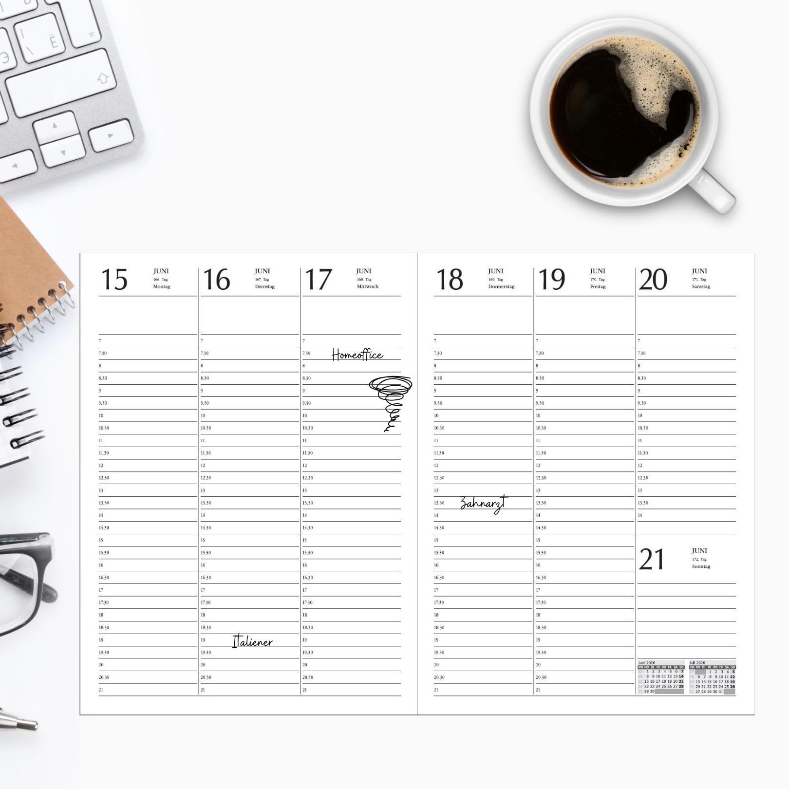 Der hochwertige Kunststoff-Einband in eleganter Lederoptik verleiht dem Kalender ein professionelles Design und schützt die Seiten vor Abnutzung. Ein schwarzes Lesebändchen führt Sie direkt zur aktuellen Woche.Freiraum für Notizen