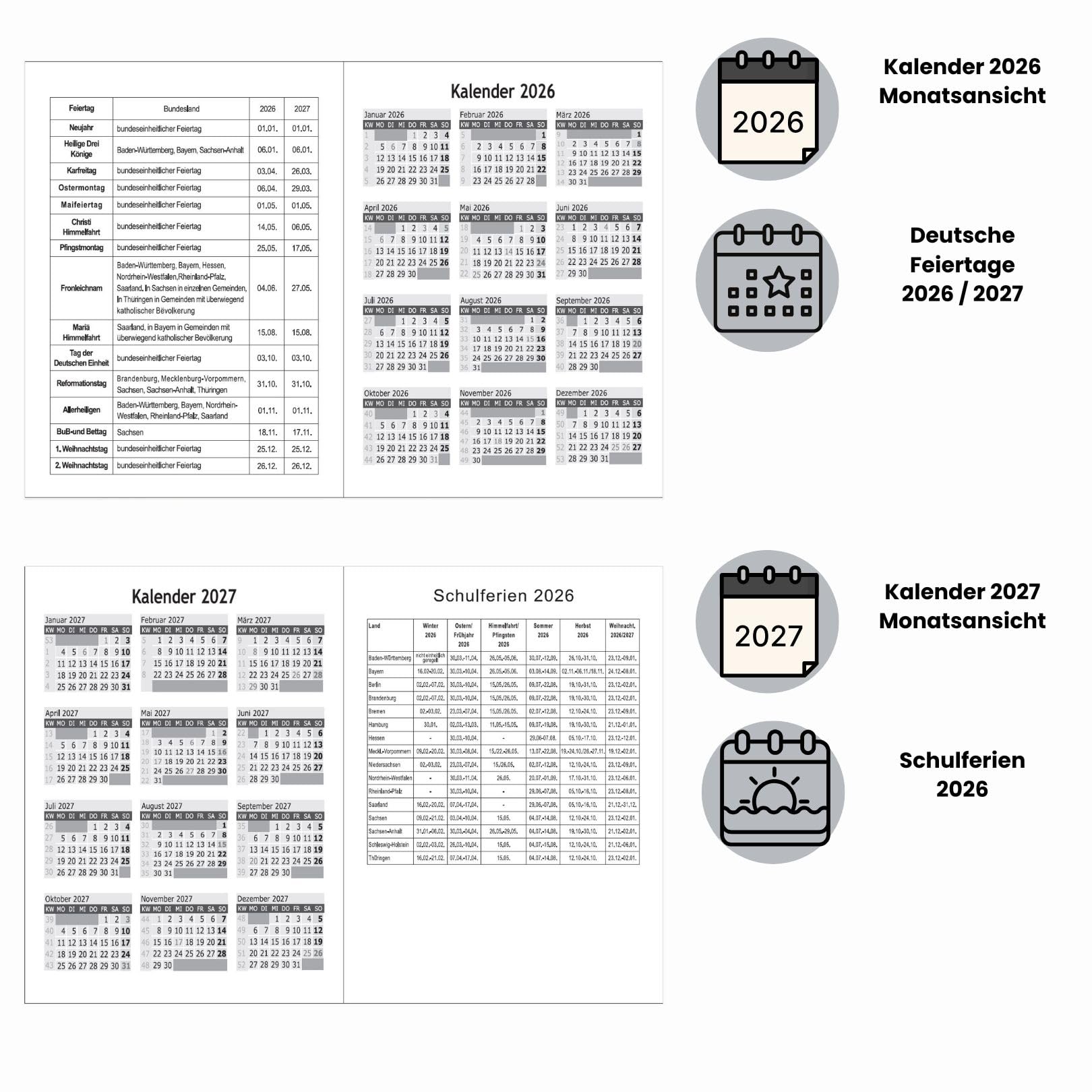 Beginnen Sie mit Ihren persönlichen Daten, gefolgt von übersichtlichen Monatsplänen für 2026 und 2027 sowie einer praktischen Feiertags- und Schulferienübersicht. So haben Sie alle wichtigen Daten stets im Blick.Perfekte Wochenorganisation