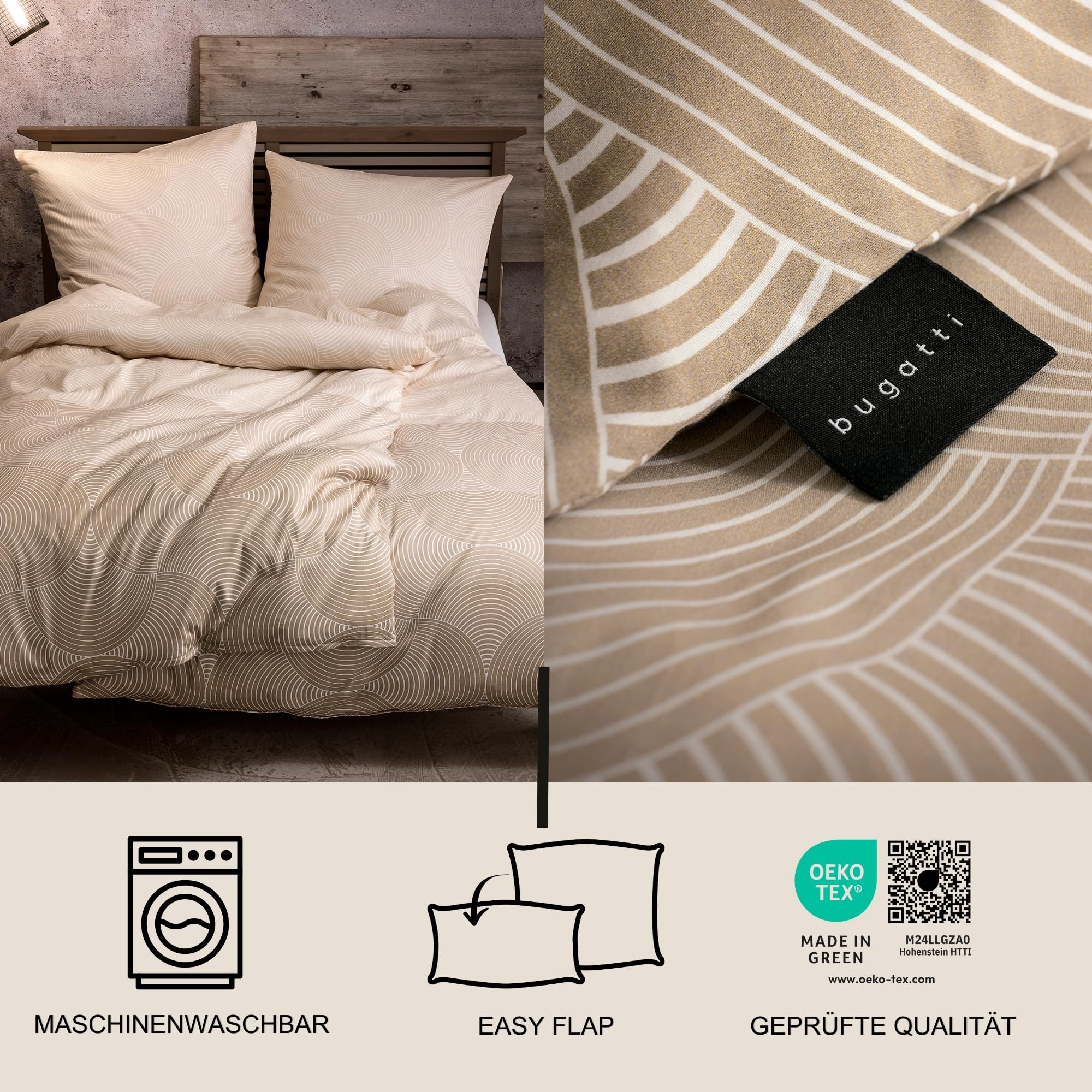 Geniessen Sie süsse Träume mit dem bugatti Bettwäscheset, bestehend aus einem Bettbezug und einem Kissenbezug, gefertigt aus 100% hochwertiger Mako-Baumwolle von s.Oliver. Das geometrische Kreismuster in Beige verleiht Ihrem Zimmer einen modernen und minimalistischen Touch. Der Bettbezug misst 155 x 220 cm und der Kissenbezug 80 x 80 cm, mit robusten Reissverschlüssen, die das Beziehen erleichtern. Diese Bettwäsche ist weich und bequem, perfekt für das ganze Jahr, maschinenwaschbar bei 60 °C, trocknergeeignet. Darüber hinaus verfügt er über das Ökotex-Siegel Made in Green M24LLGZA0 und garantiert eine umweltfreundliche Herstellung. Das Bettwäsche-Set ist in Einheitsgrösse erhältlich und wird für Erwachsene empfohlen.