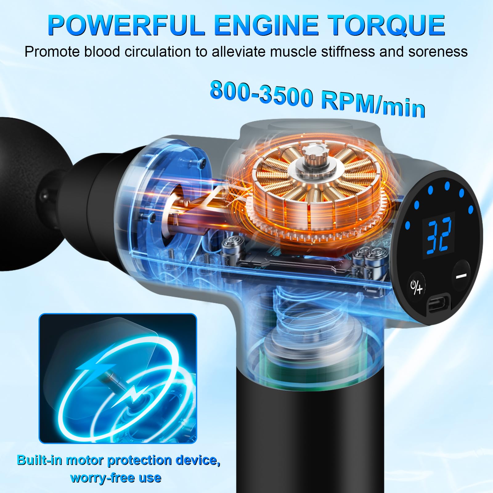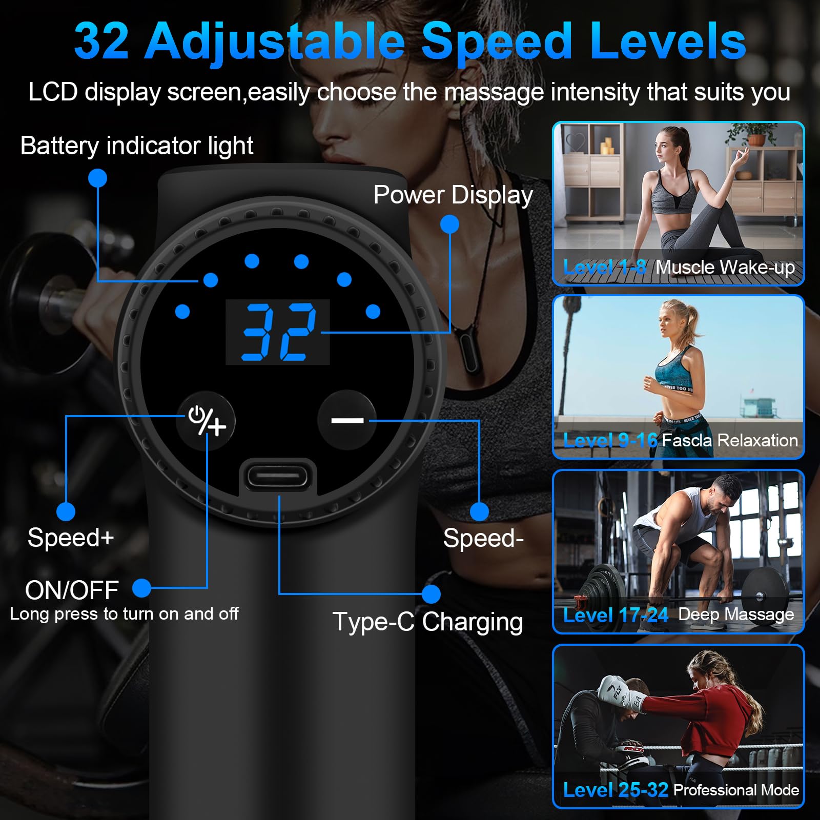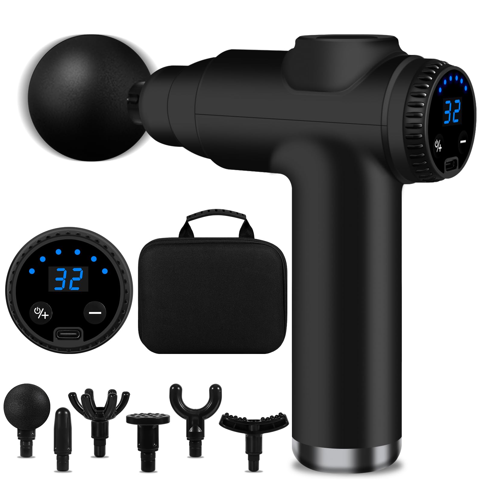 • 【LCD display】: Die muskelmassagepistole ist mit einem LCD display ausgestattet, kann geschwindigkeit und batterieanzeige anzeigen und sie entsprechend der strommenge rechtzeitig aufladen. Sie können die geschwindigkeit des elektrischen massagegeräts erhöhen oder verringern, indem sie einfach die taste + oder - drücken. Durch langes drücken wird das gerät ein- und ausgeschaltet.