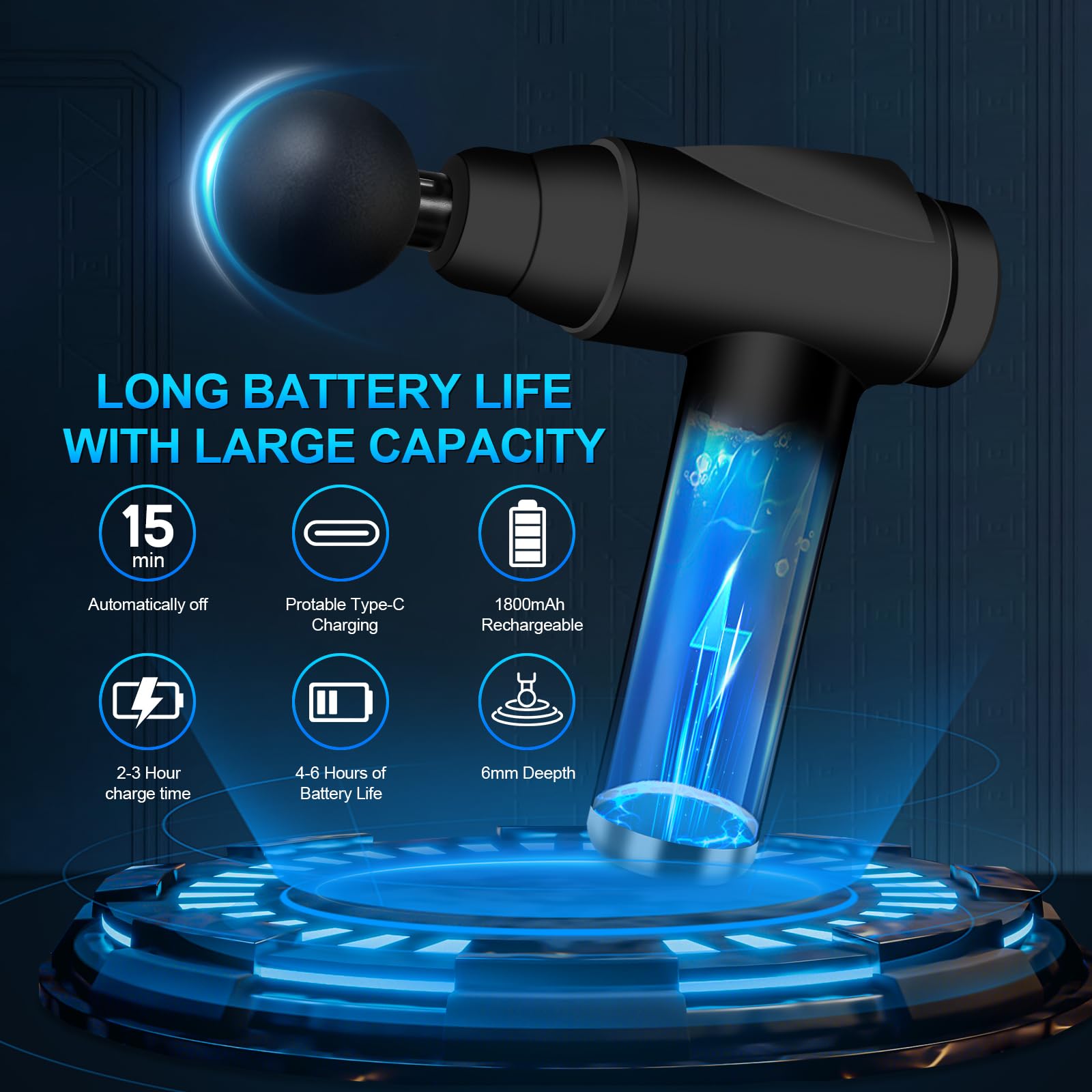 • 【Lange akkulaufzeit】: Diese Mini-Massagepistole ist mit einem fortschrittlichen 1800-mAh-Lithium-Akku ausgestattet, der mit einer einzigen ladung 4–6 stunden lang verwendet werden kann (abhängig von der massageintensität, die sie verwenden). Und die massagepistole verfügt über eine 15-minütige automatische stromausfallschutzfunktion.
