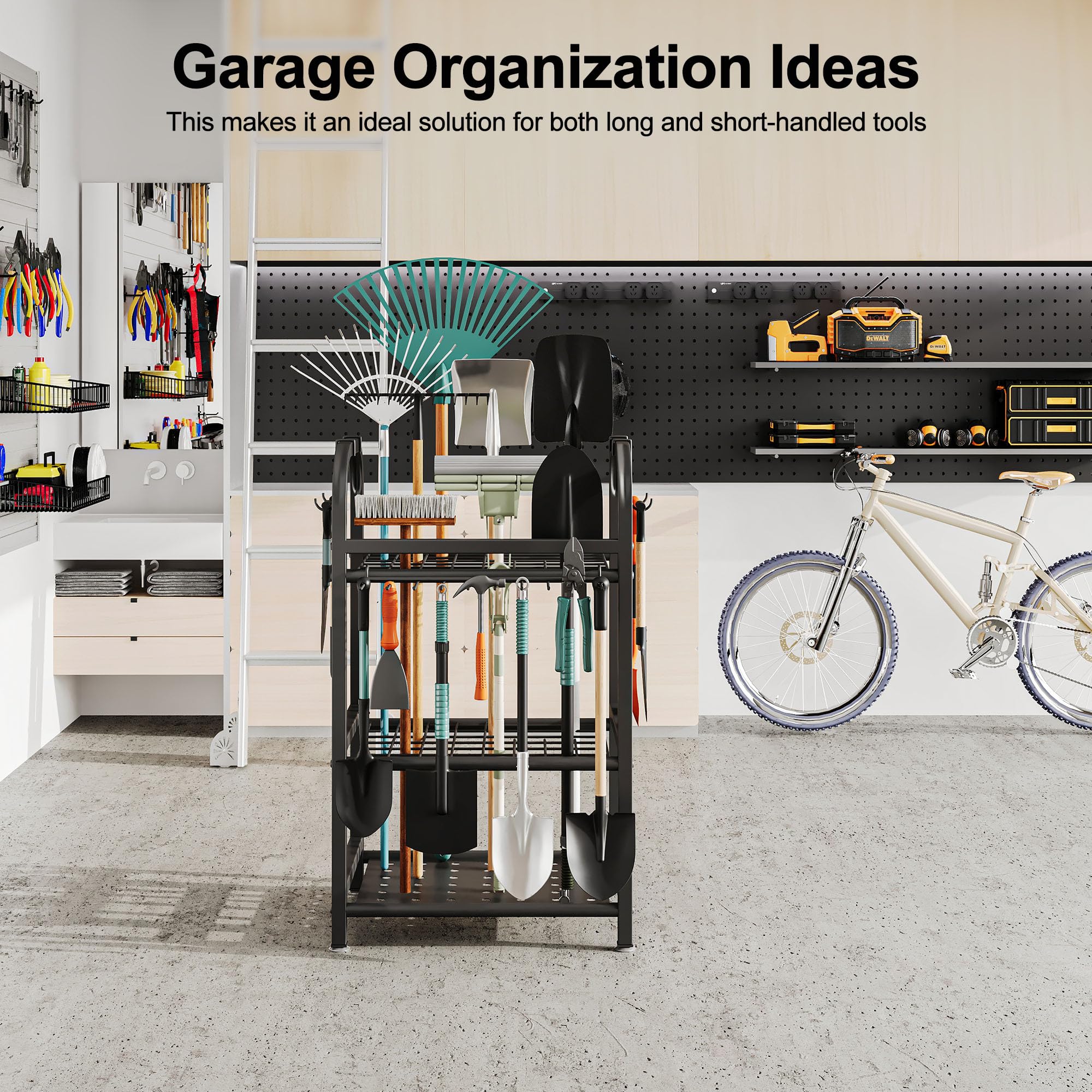 - Gartenwerkzeug-Organizer für die Garage: Mit grosser Kapazität wird unser Gartengeräte-Organizer mit 4 beweglichen Haken zum Aufhängen und 10 Haken an der Vorderseite geliefert. Darüber hinaus verfügt es über ein spezielles Werkzeugregal mit D-Griff mit drei Schlitzen, um die einfache Platzierung von Werkzeugen mit D-Griff zu ermöglichen