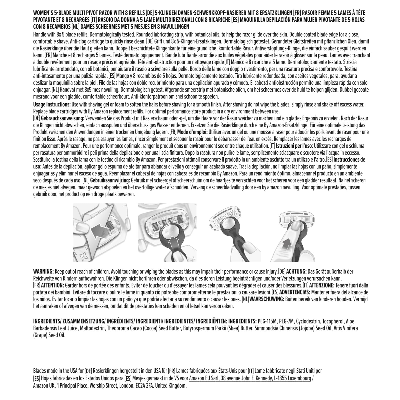 Jetzt Teil der Marke „by Amazon“. Der Damen-Rasierer von by Amazon mit 5 Klingen und Griff mit Multi-Achsgelenk wurde entwickelt, um den Konturen deines Körpers zu folgen. Die angenehm beschichteten Klingen bieten zusätzliche Sanftheit und Komfort. Der Gleitstreifen mit Vitamin E und Aloe hilft, den Rasierer über die Haut gleiten zu lassen und minimiert Irritationen. Leicht abzuspülende Klingen mit verstopfungsfreier Kartusche für einen leichten Wasserdurchfluss.