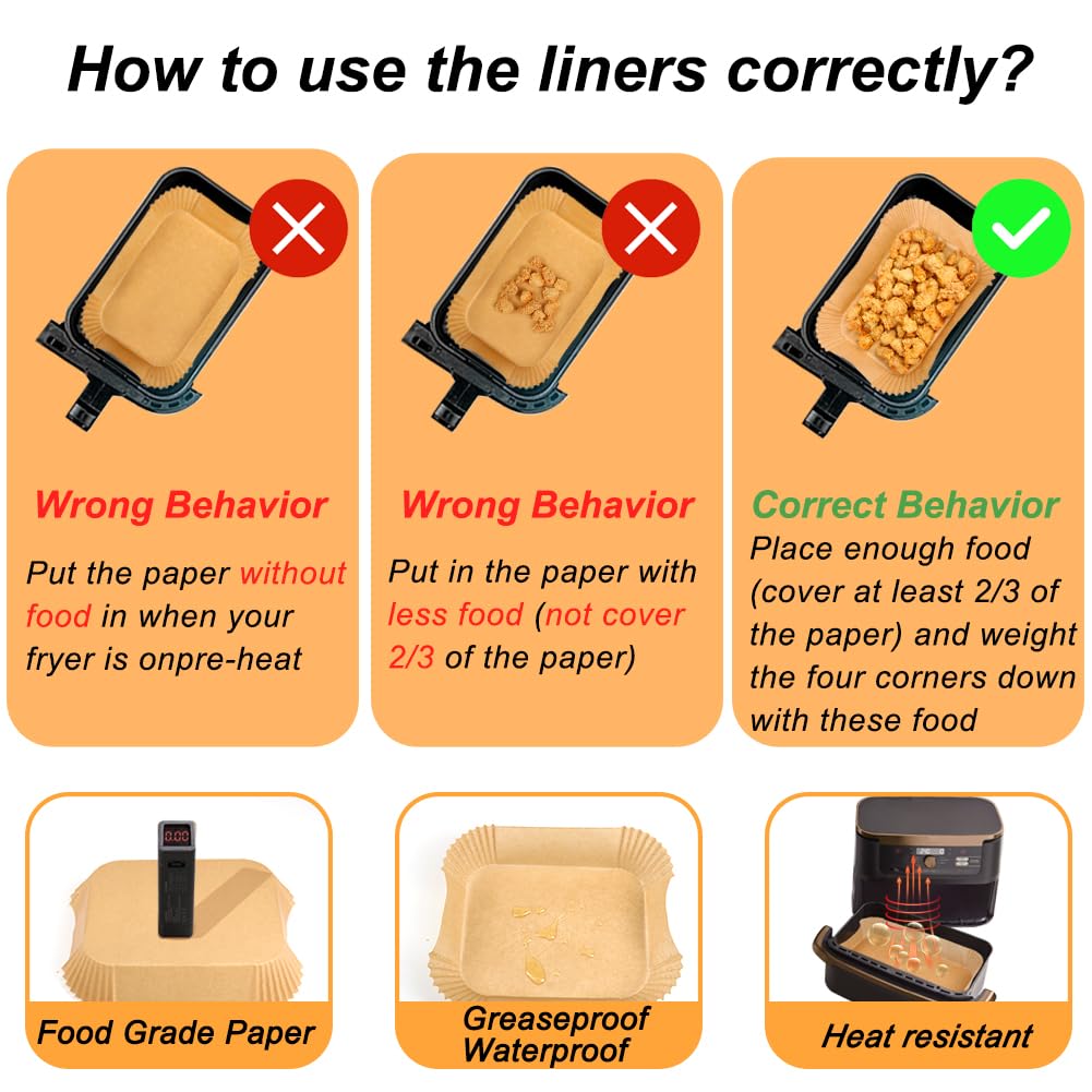 150 Stück Luftfritteusen-Einlagen für Ninja Flexdrawer / Luftfritteuse, Pergamentpapier, kompatibel mit Ninja Foodi FlexDrawer Luftfritteuse 10,4 l AF500UK & Duronic Air Fryer AF34 10 l & Instant XXL 8,5 l BYKITCHEN Store, machen Sie Ihr Leben ein wenig einfacher. Rechteckiges Luftfritteusenpapier mit Seite, verhindert Fett oder Rückstände an der Seite/Unterseite der Luftfritteuse, im Grunde keine Reinigung nach dem Backen. Merkmale: Besonders geeignet für Ninja Foodi Flex Drawer Air Fryer AF500UK 10,4 l Auch kompatibel mit Duronic Air Fritteuse AF34 10L & Instant XXL 8,5L Luftfritteuse & Ometa 9L Dual Air Fritteuse Einsätze für Luftfritteusenkorb mit seitlichem Design, einfaches Übertragen von Lebensmitteln auf den Teller. Aus hochwertigem Zellstoff in Lebensmittelqualität und Antihaftbeschichtung, 100 % sicher für den täglichen Gebrauch. Fettdicht, wasserdicht und nicht saugfähig. Hitzebeständig bis 232 C, mikrowellen- und ofenfest. Produktmerkmale: Menge: 50 Stück grosse rechteckige Einlagen für 10,4 l und 100 Stück rechteckige Einlagen für 5,2 l (insgesamt 150 Stück). Hinweis: 1. Legen Sie beim Vorheizen kein leeres Papier ein. 2. Stellen Sie sicher, dass ausreichend Lebensmittel mindestens 2/3 der Pergamentfolie abdecken. 3. Seien Sie vorsichtig, um alle vier Ecken mit Lebensmitteln zu beschweren. 4. Die maximale Aufheizzeit <45 Minuten.