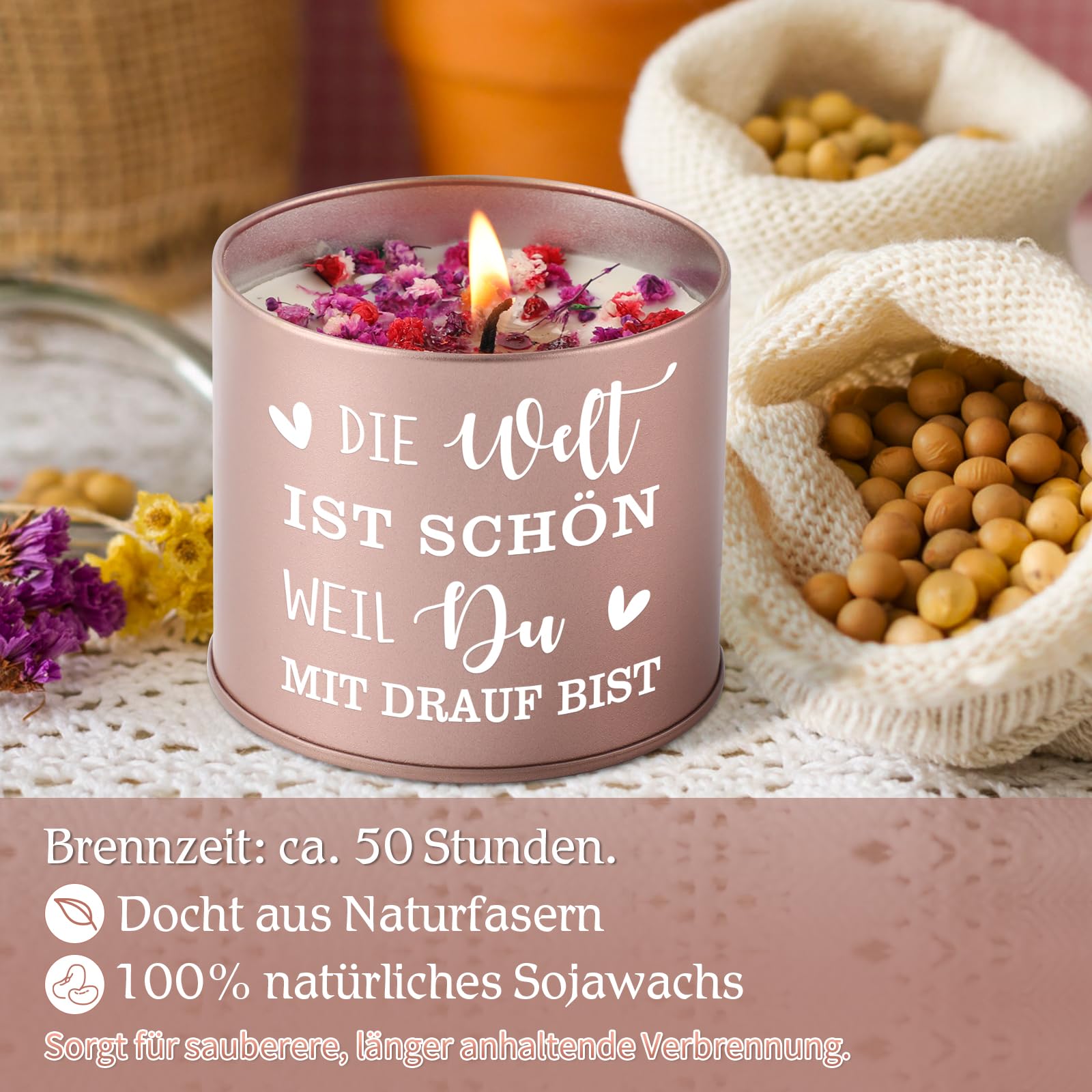 Material: rein Sojawachs + natürliches ätherisches Öl + Docht aus rein Baumwolle