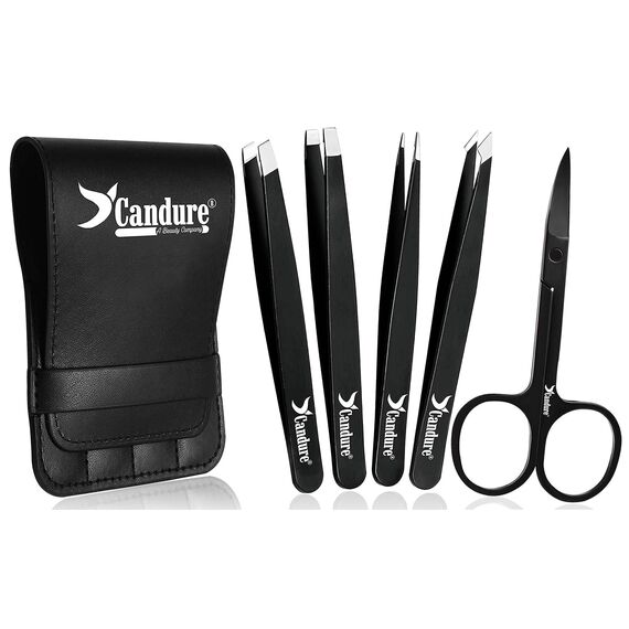 Candure Eyebrow Tweezers Set for Professionals (5Piece) – Stainless Steel Precision Tweezers for Ingrown Hair, Facial Hair, Splinter and Blackhead Remover (Schwarz - 5 Stück)