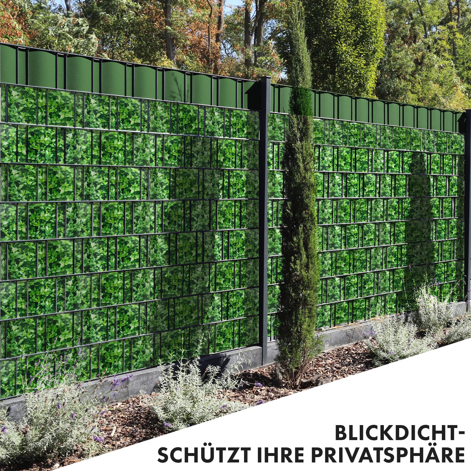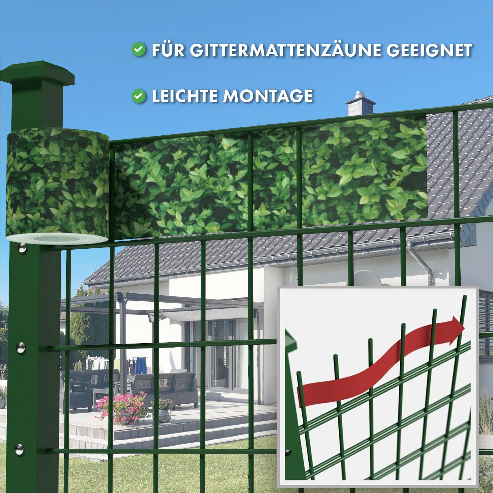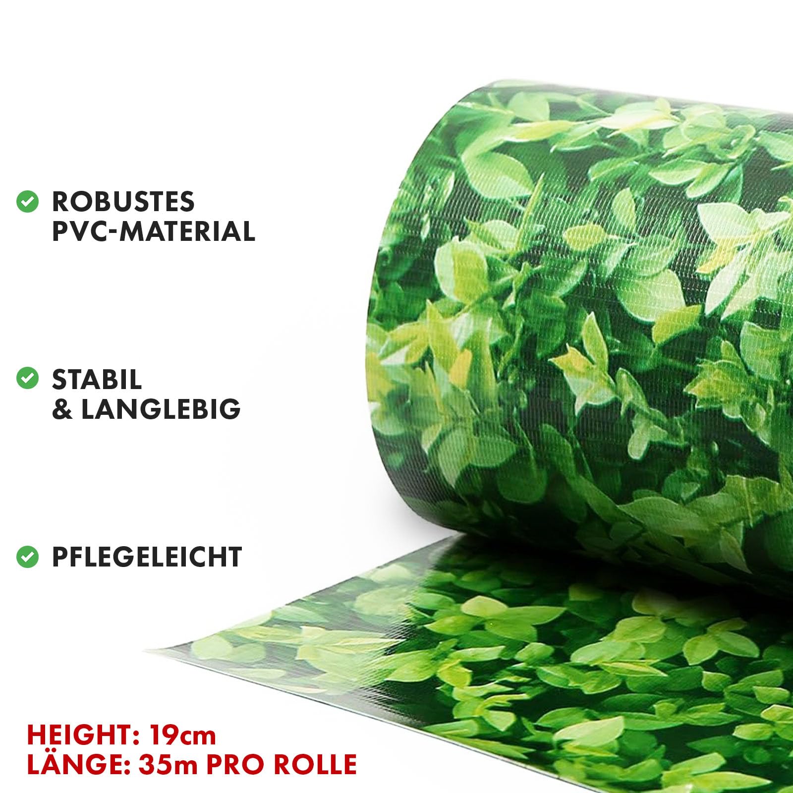 Sichtschutzstreifen PVC | Sichtschutzfolie Gartenzaun oder Balkon | inkl. 20 Befestigungsclips | für Einzel- und Doppelstabmatten geeignet | 19 cm x 35 m | einfarbig oder mit Motiv| Buchsbaum-Optik