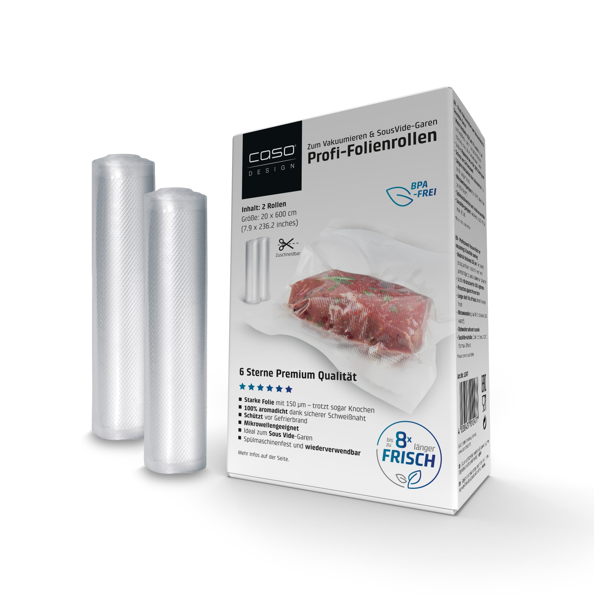 CASO 6 Sterne Profi-Folienrollen 20x600 cm, 2 Rollen, Vakuumierbeutel für alle Vakuumierer, stark und reissfest ca.150 μm, Vakuumbeutel Lebensmittel Vakuumiergerät, BPA-frei