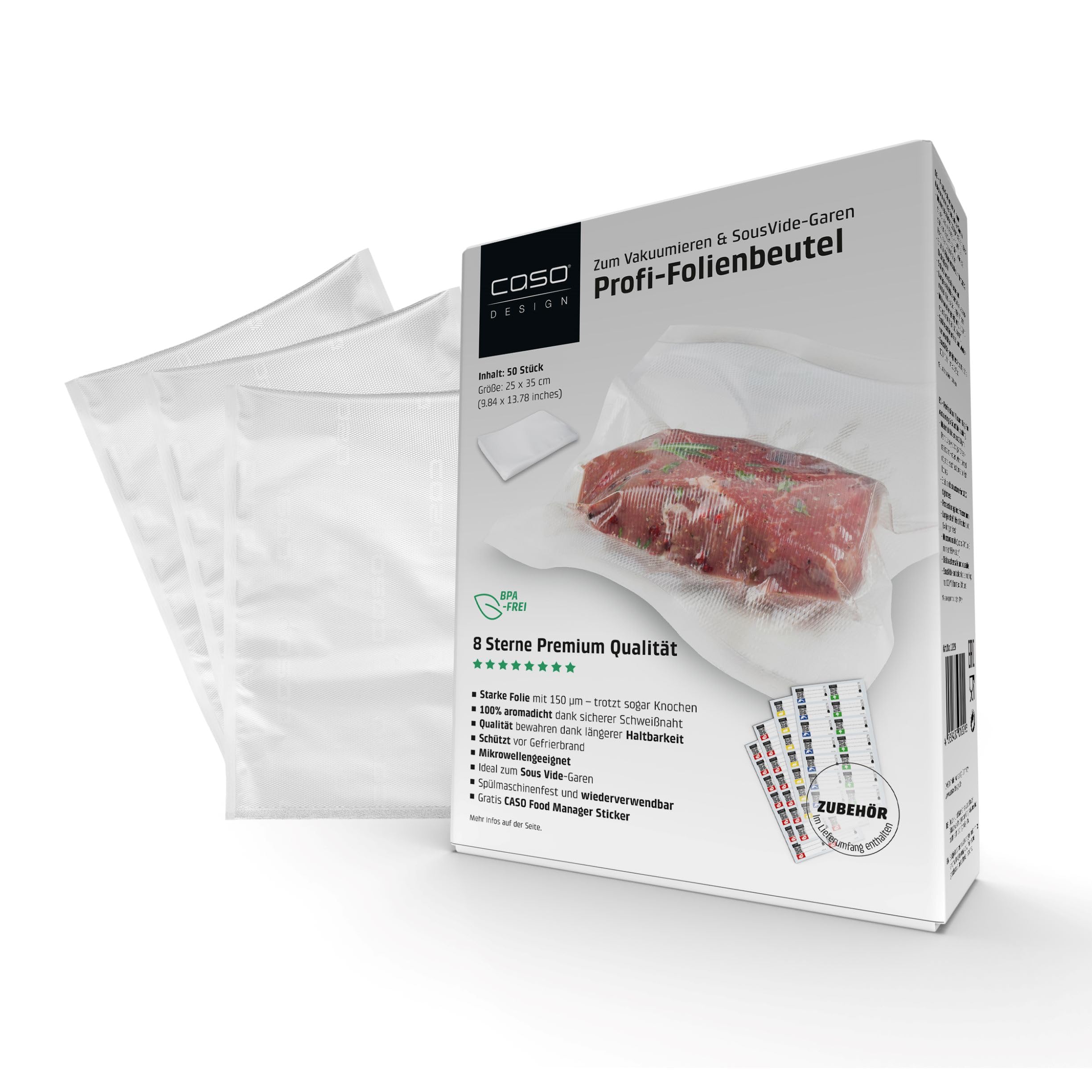CASO 8 Sterne Profi- Folienbeutel 25x35 cm / 50 Beutel, Vakuumierbeutel für alle Vakuumierer, sehr stark & reissfest ca. 150µm, Vakuumbeutel Lebensmittel Vakuumiergerät, Sous Vide, BPA-frei