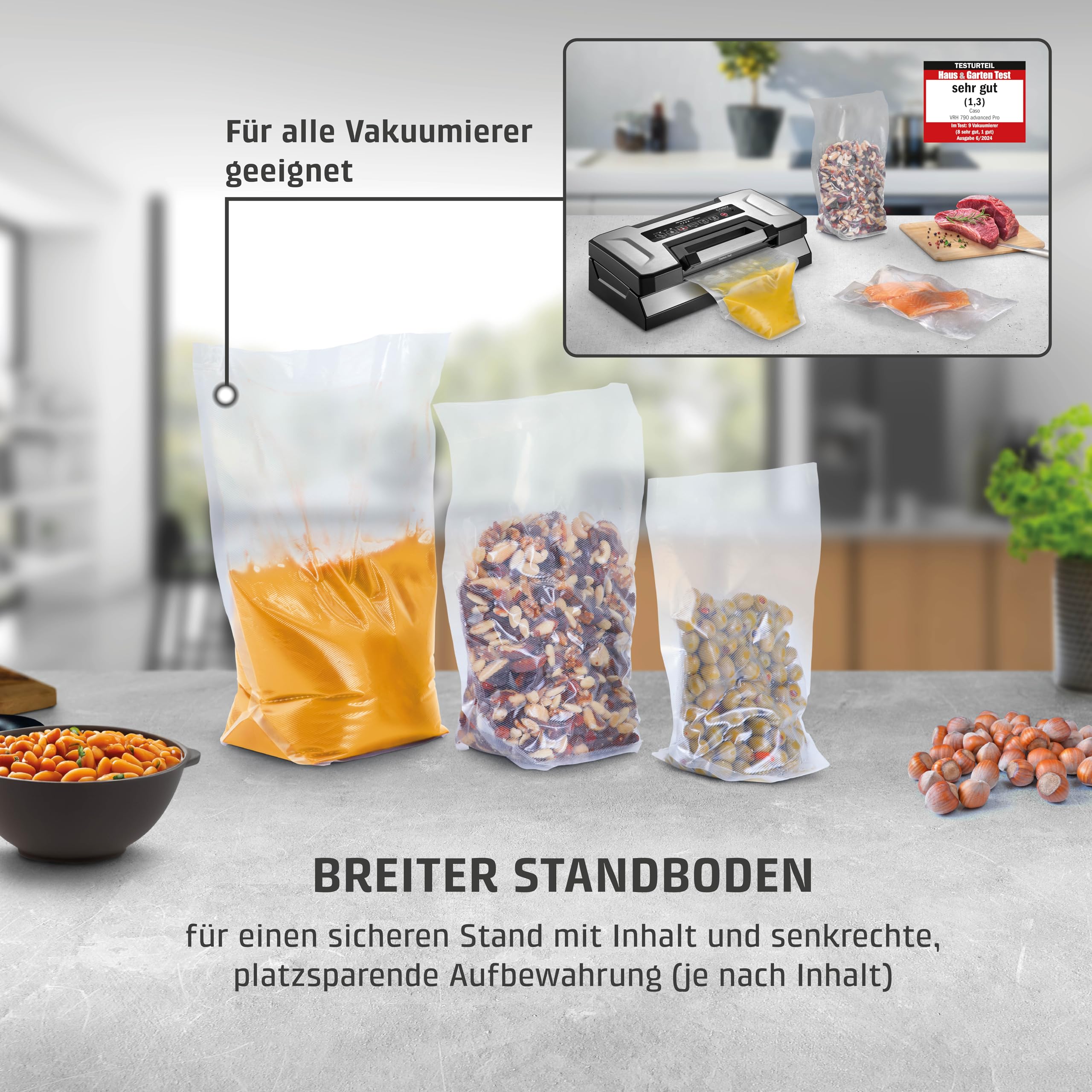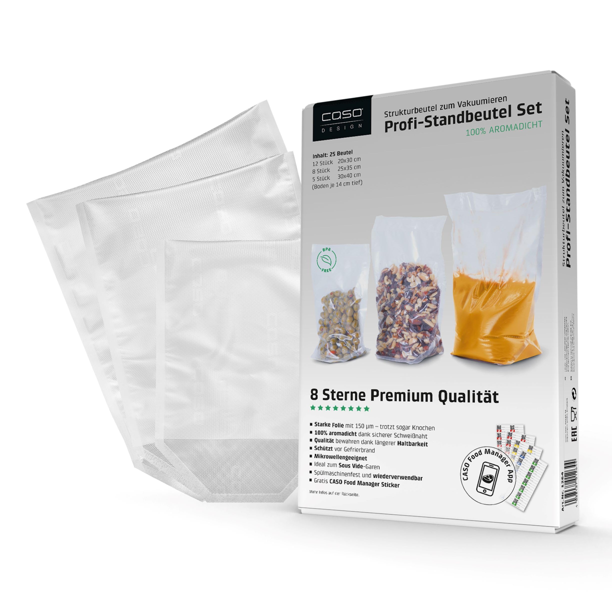 CASO Profi-Standbeutel Set / Strukturbeutel zum Vakuumieren / Innovative Vakuumbeutel mit Standboden – ideal für das Vakuumieren von Flüssigkeiten und voluminösen Lebensmitteln / Breiter Standboden für einen sicheren Stand mit Inhalt und senkrechte, platzsparende Aufbewahrung (je nach Inhalt) / Besonders geeignet für CASO Design Vakuumierer VRH 790 advanced Pro / Materialstärke 150 μm: Besonders stark und reissfest – auch bei spitzen Gegenständen, wie z. B. Knochen oder Gräten / Stabile Rippenstruktur für 100 % Dichtigkeit / Schutz vor Gefrierbrand / Längere Haltbarkeit der Lebensmittel: Bis zu 8x länger frisch / Mikrowellengeeignet (bis 70 °C)** / Spülmaschinengeeignet und wiederverwendbar / SousVide-geeignet: Kochfest bis 100 °C für max. 8 Std. / Set mit verschiedenen Grössen mit jeweils 14 cm Tiefe*: 12 St. 20x30 cm, 8 St. 25x35 cm, 5 St. 30x40 cm / Mit gratis CASO Food Manager Stickern und CASO Food Manager App zur Organisation und Lagerung Ihrer Lebensmittel / Für Balken- und Kammervakuumierer geeignet / *Bei ausgeklapptem Boden | **Bitte Beutel leicht öffnen